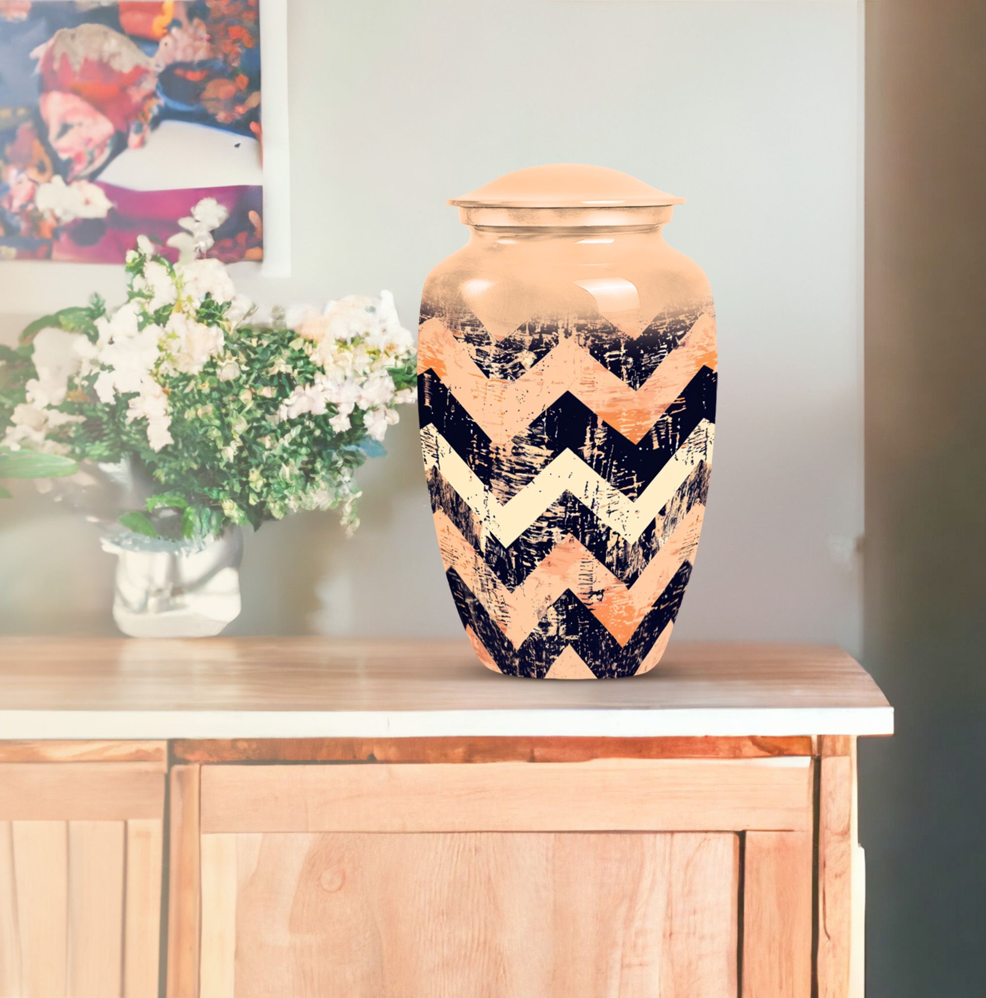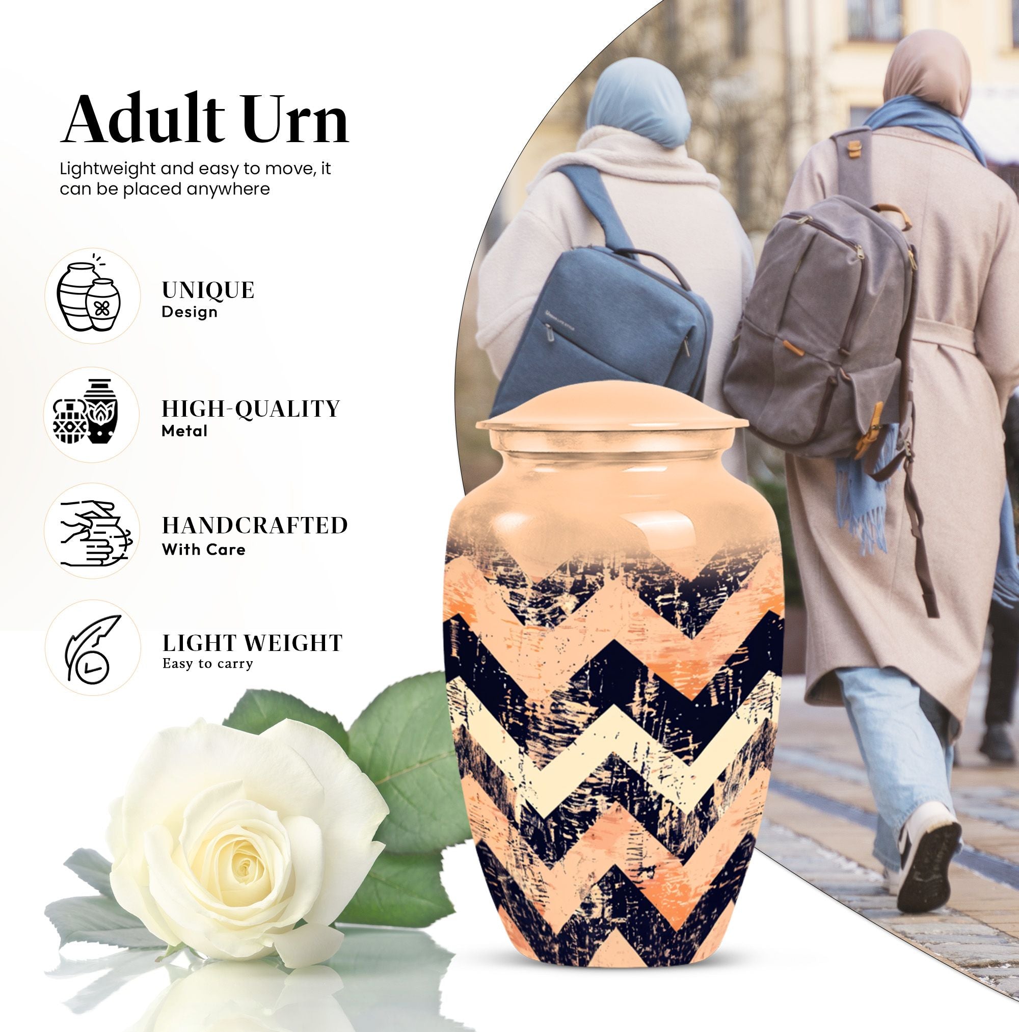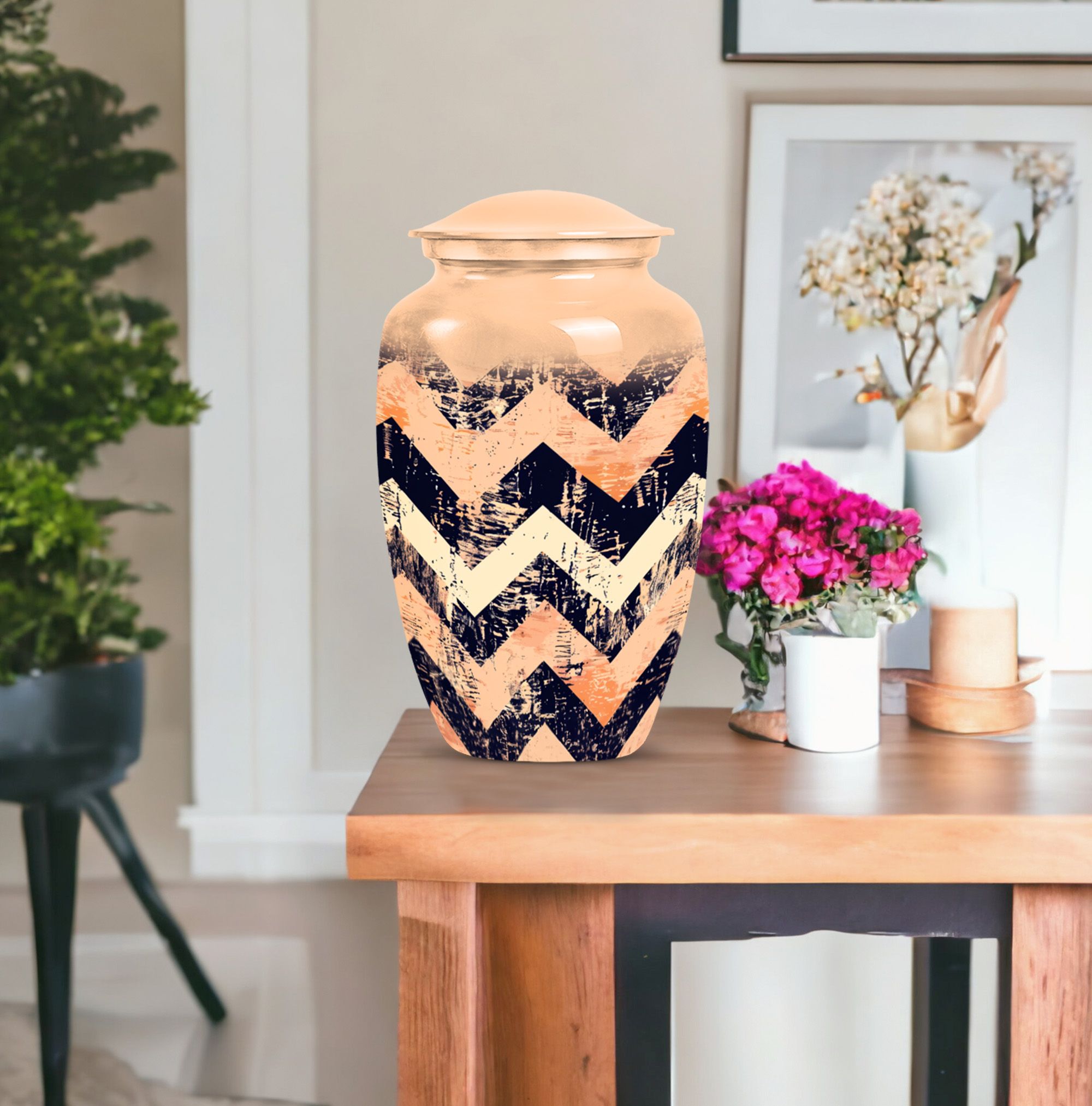 Honor your loved ones eternally with our Abstract Pattern Urn, a unique large urn for human ashes. Our specialty urn, meticulously crafted from robust Aluminium, guarantees lasting quality as it resides with you. An impressive height of 10 inches and a capacity of 200 cubic inches make this urn suitable for housing substantial amounts of ashes with ease. Despite its size, the urn maintains a manageable weight of a mere 3.3 pounds. We believe in making this already meaningful piece even more personal by offering customized engravings of names on it. Our abstract-themed urn comes with an elegant velvet pouch for safe containment and transfer of ashes. You can place this urn in your home as a poignant memorial tribute or use it for cremation or burial ceremonies. This urn distinguished by its classic design, bridges the gap between tradition and contemporary style. It redefines memorial urns, setting a new standard in the ceremony supplies sector. Note: The secondary keywords for this product are memorial medium urns for ashes, cremation urn burial, funeral, and funeral cremation urn.