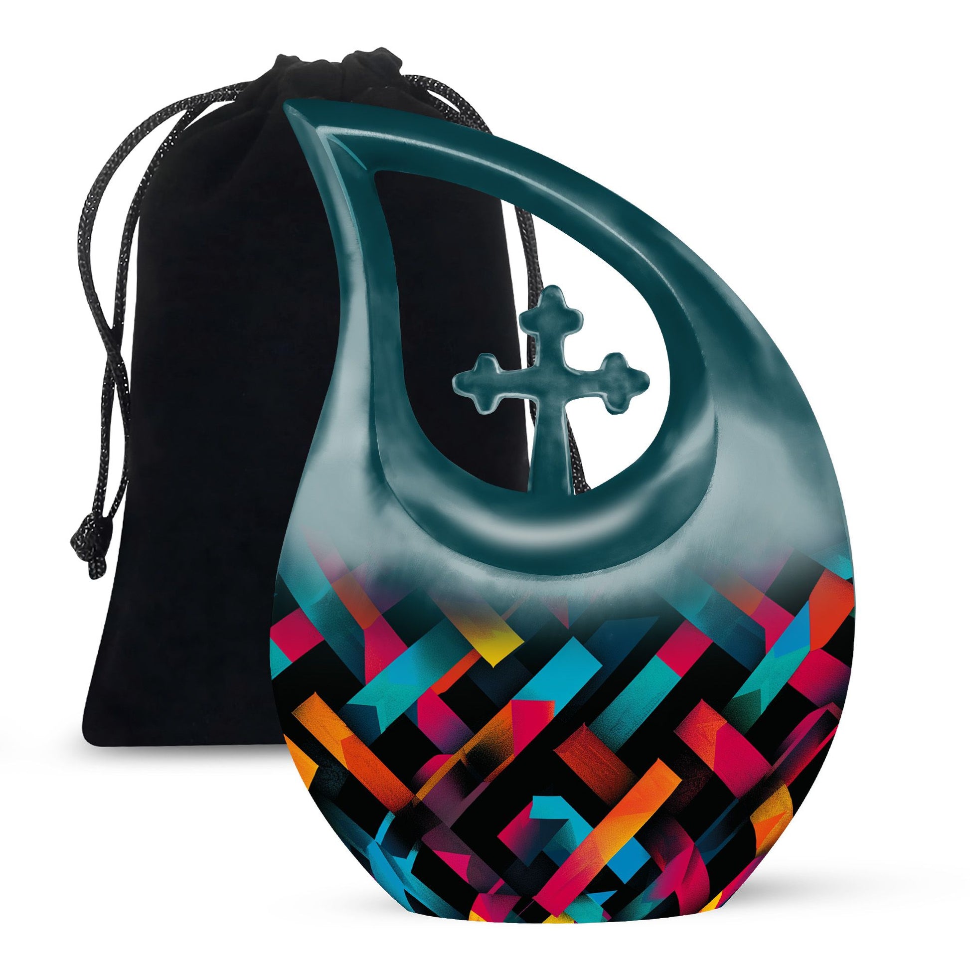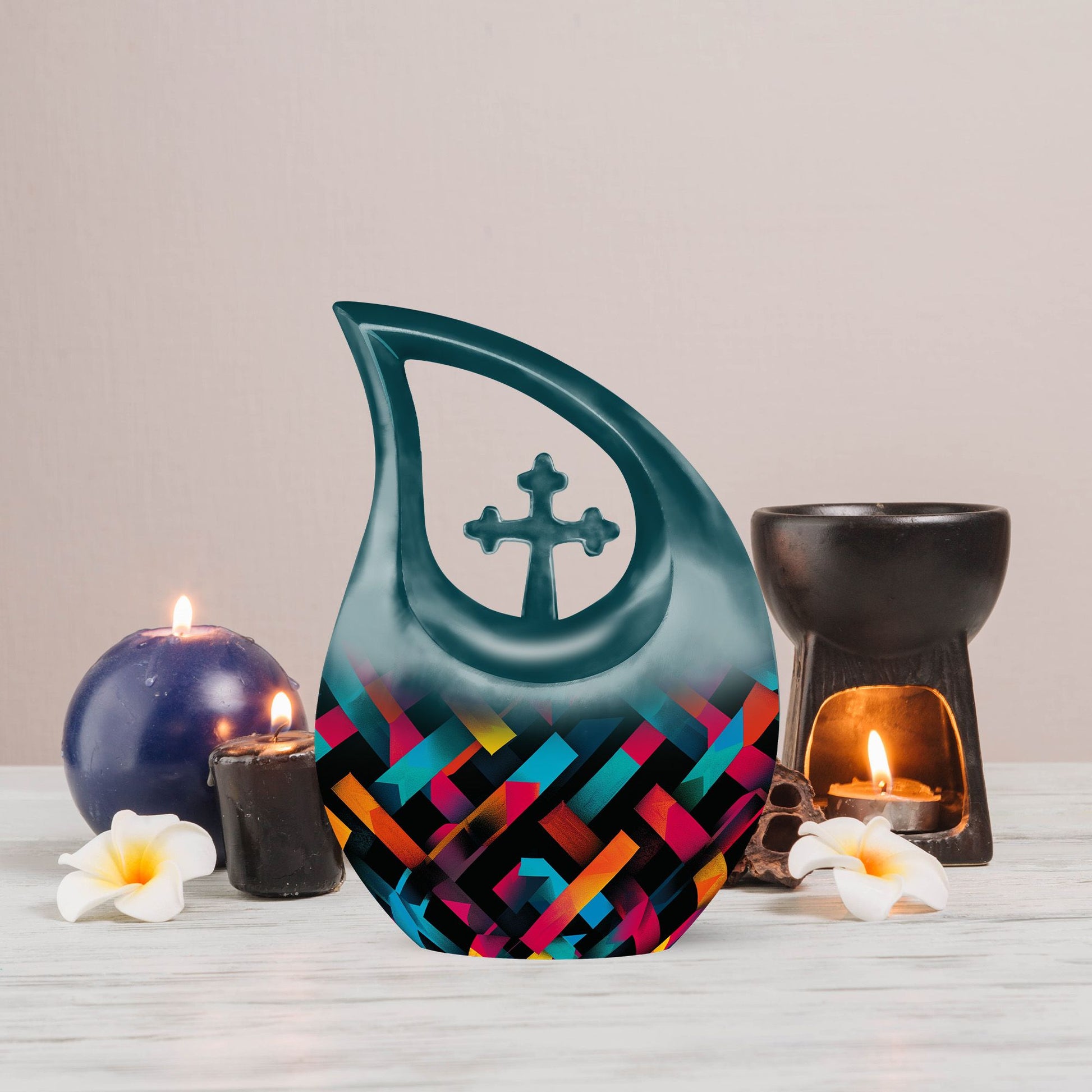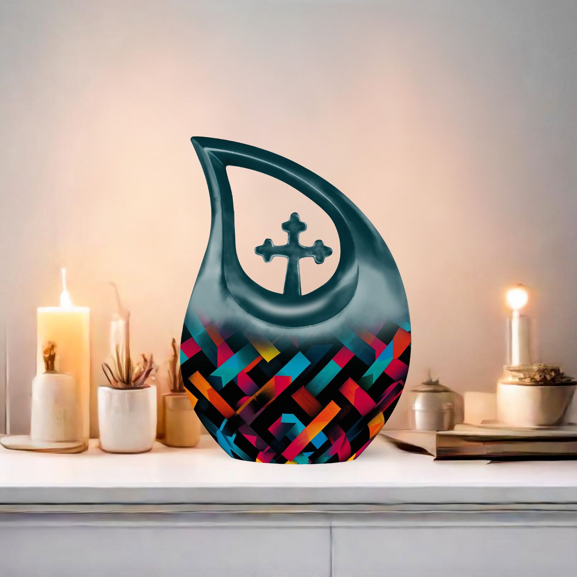 Honor the memory of your loved ones with this meticulously crafted 10-inch Pattern Urn. Boasting a unique design theme, this cremation container features a soothing 'Cross Drop' design. Each urn is precision-crafted from durable aluminium, ensuring longevity and heartening preservation. With a substantial capacity of 200 cubic inches, the urn comfortably holds the ashes of your loved one, acting as a touching tribute to their life. The urn weighs 3.3 pounds and displays a balance of robust durability and delicate design. Augment its significance with your personalized touch by engraving names onto the urn, making it an artifact of cherished memories. Further, the package comes supplied with a velvet pouch for dignified containment of ashes. Our large urns harmoniously blend design and practicality, serving as ideal memorial urns or burial urns. Remember, cherish, and celebrate your loved ones with our unique selection of personalized urns for ashes.