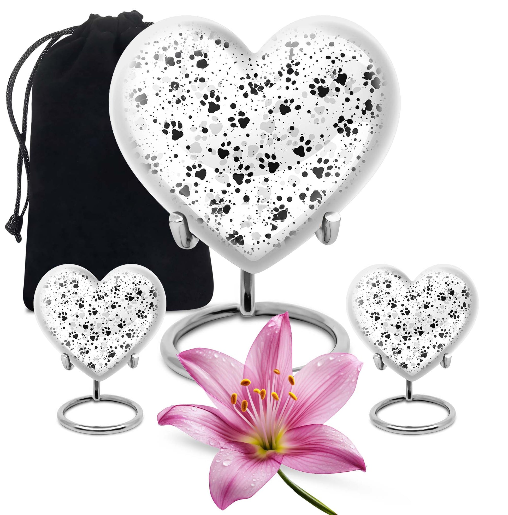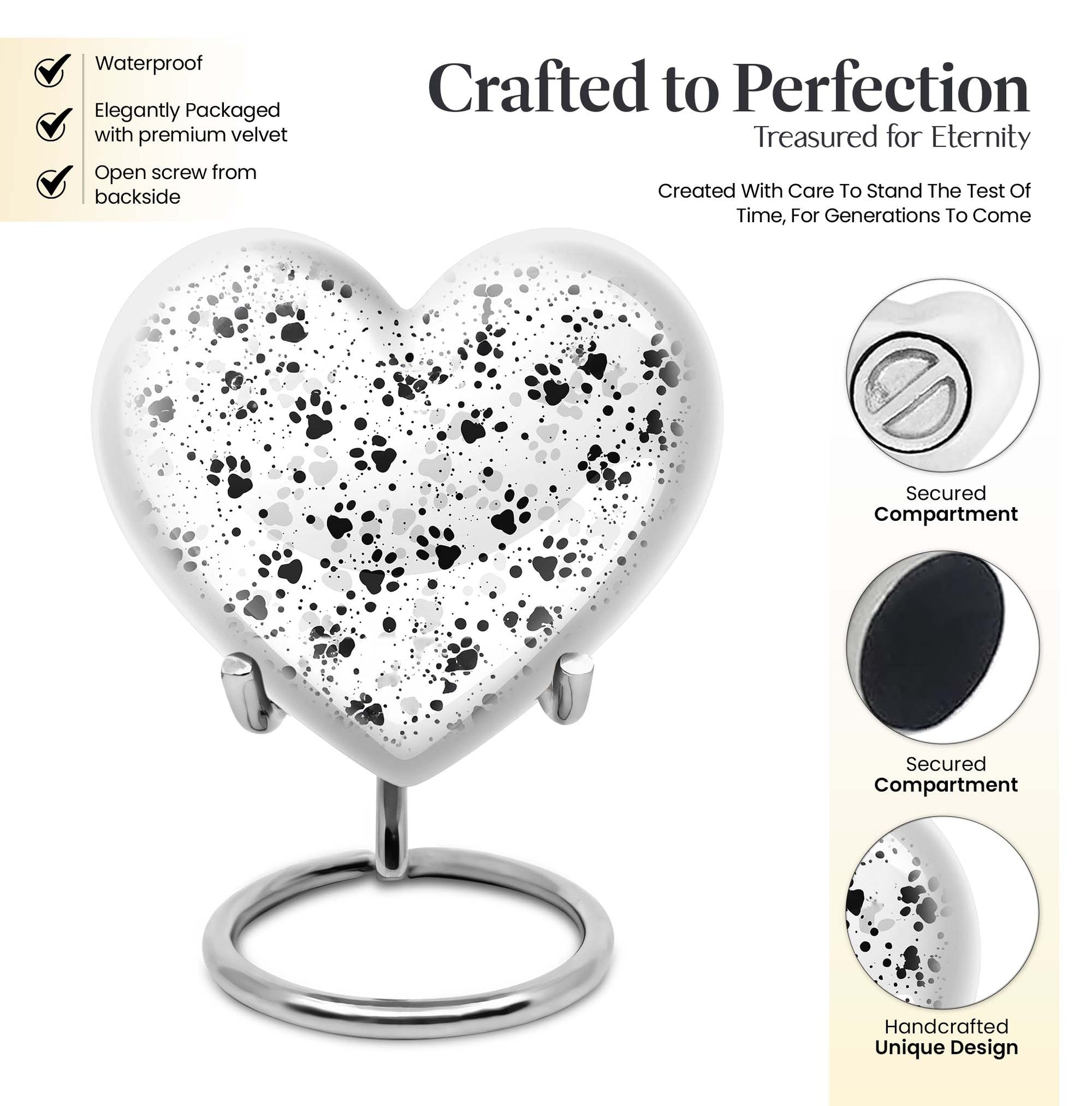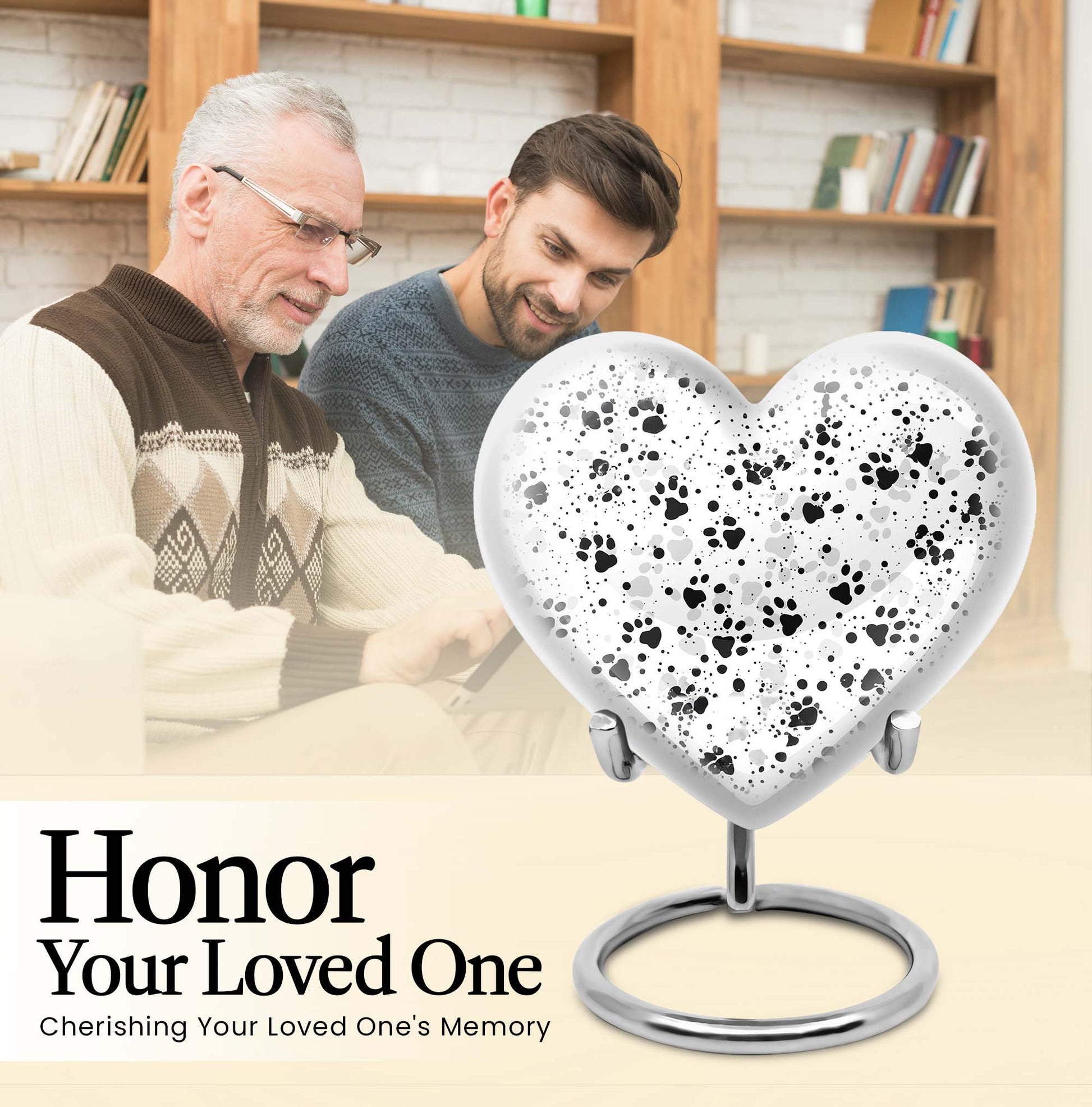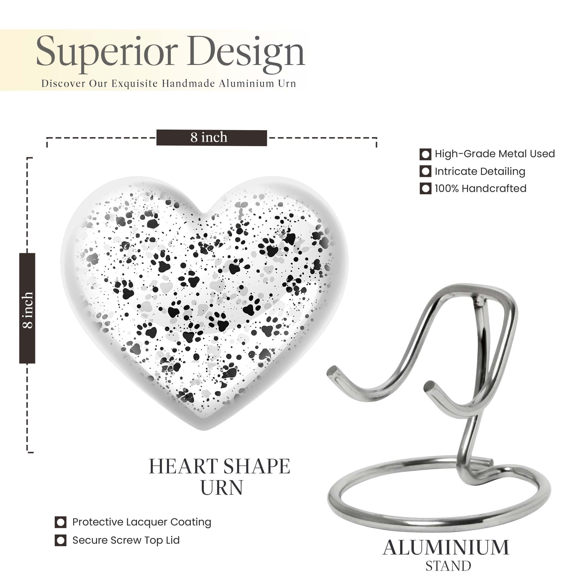 Embrace the compassionate spirit of remembrance with our meticulously designed, 10-inch PAWS Urn. Crafted from resilient aluminium, this dignified large urn indeed serves as a lasting tribute to the cherished life of your loved one. Its robust construction weighs 3.3 pounds, providing an enduring vessel for preserving their treasured essence. This memorial urn for women ashes holds an ample capacity of up to 200 cubic inches, demonstrating its utility for ground burial or in-home remembrance. Our product encompasses heartfelt sentiment, depicted via an abstract heart urn theme. Additional customization allows for personalized engraved names, reinforcing its sentimentality. The purchase includes a velvet pouch, offering delicate containment for the ashes. Prime keywords suitable for search optimization in the religious and ceremonial category include 'cremation urn', 'women urns', 'Urn for Ground Burial', and 'urns for human ashes'. Incorporate these terms when searching to enhance product relevance and visibility online. Note: Our product description intentionally eschews unoriginal terminology, ensuring an inclusive understanding for the senior and adult demographic.