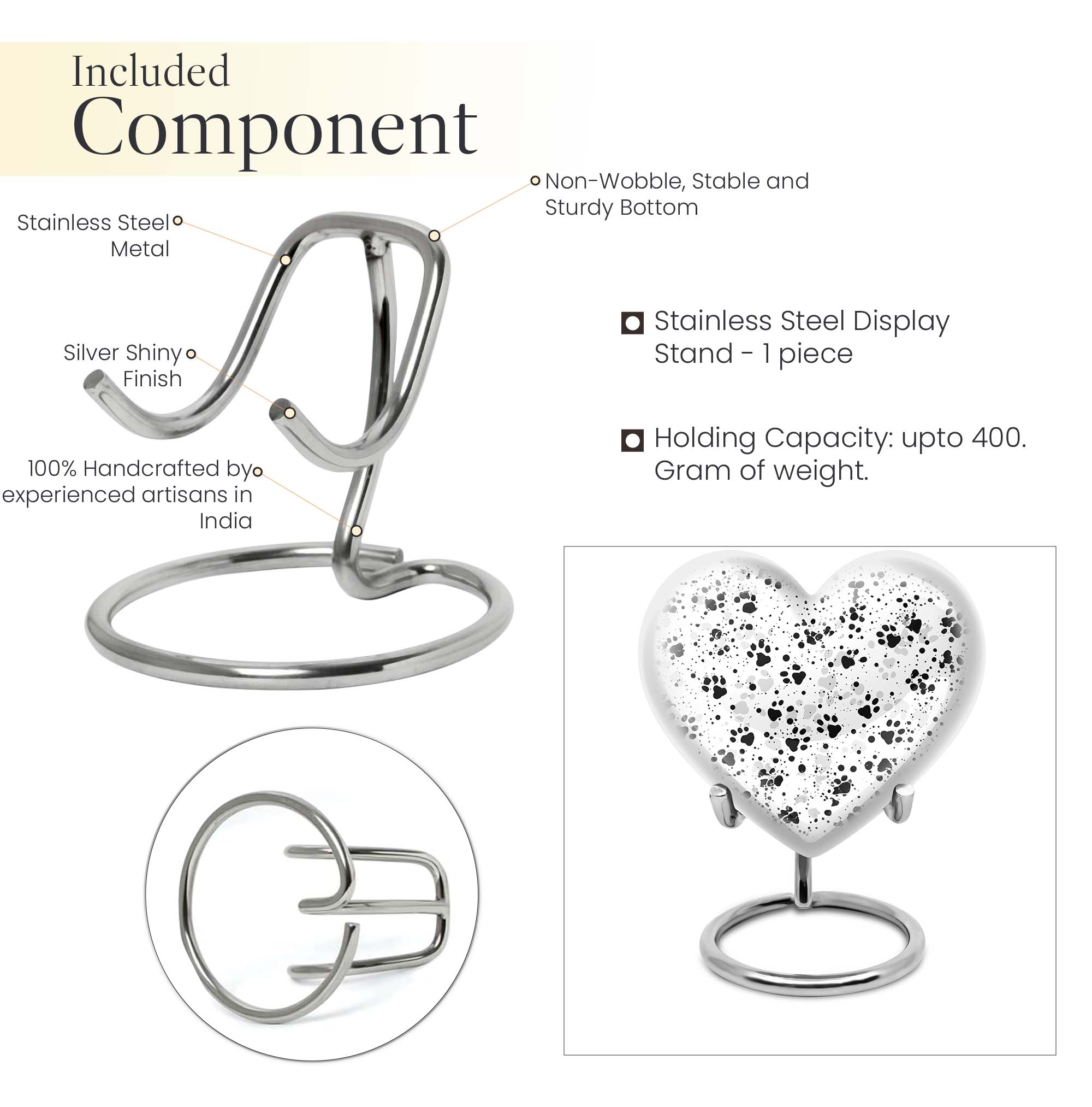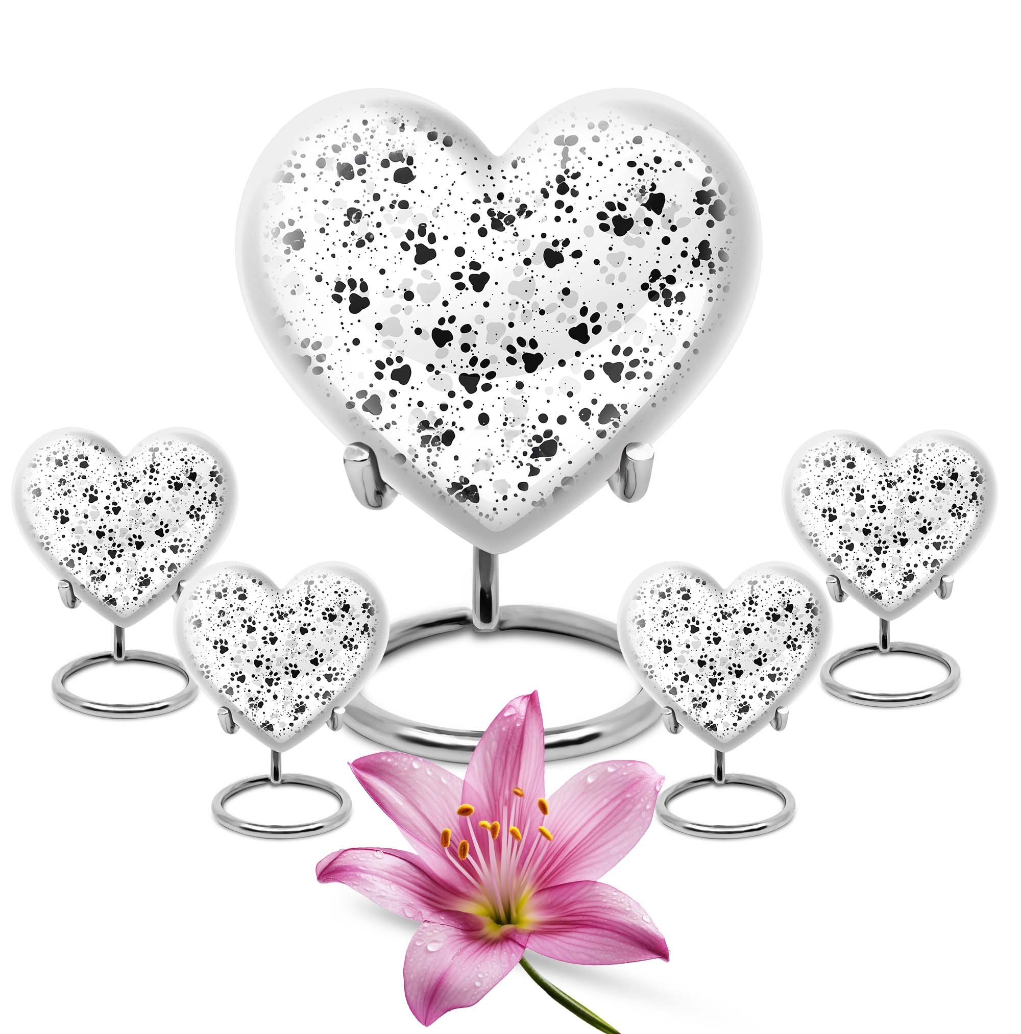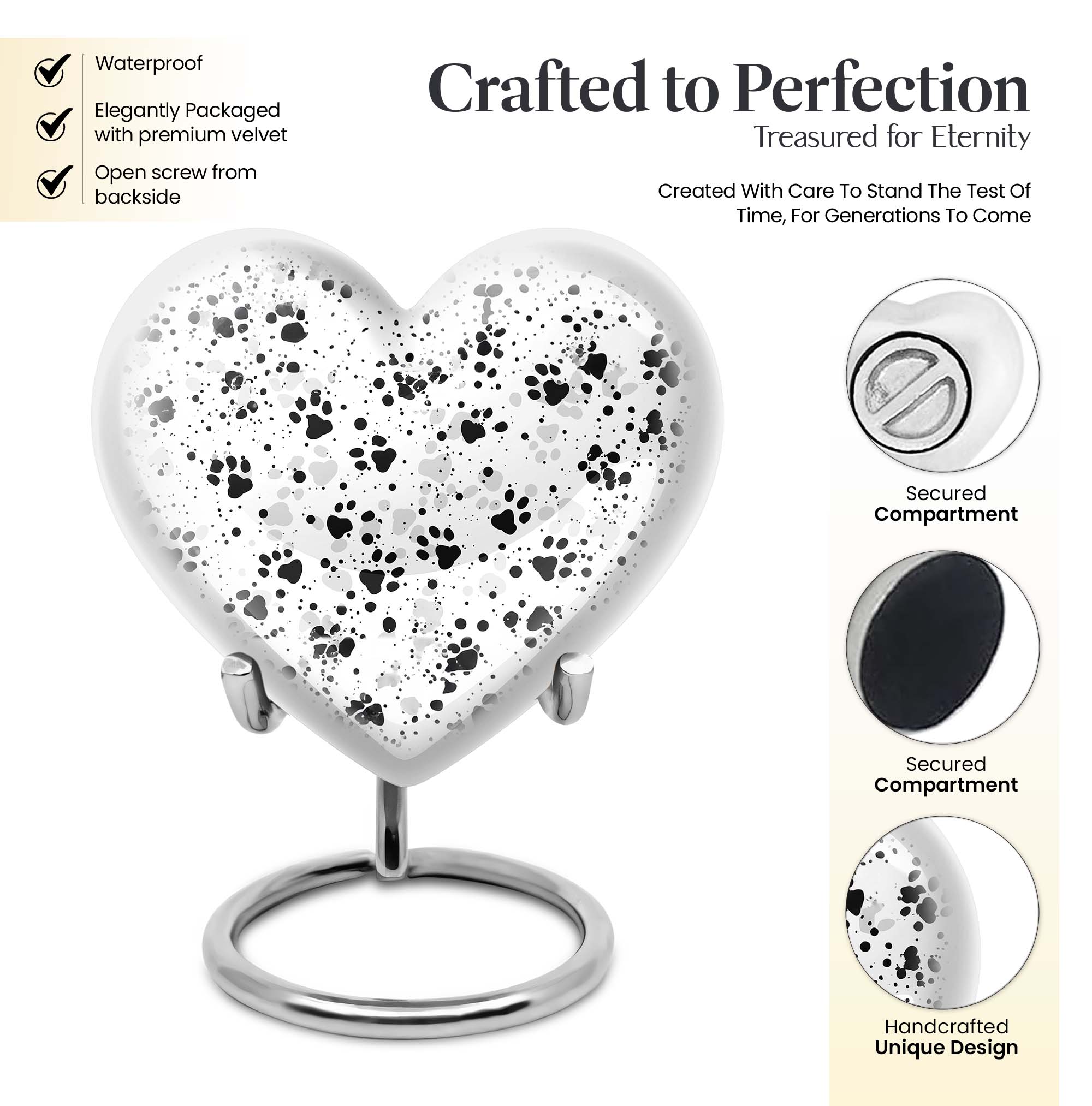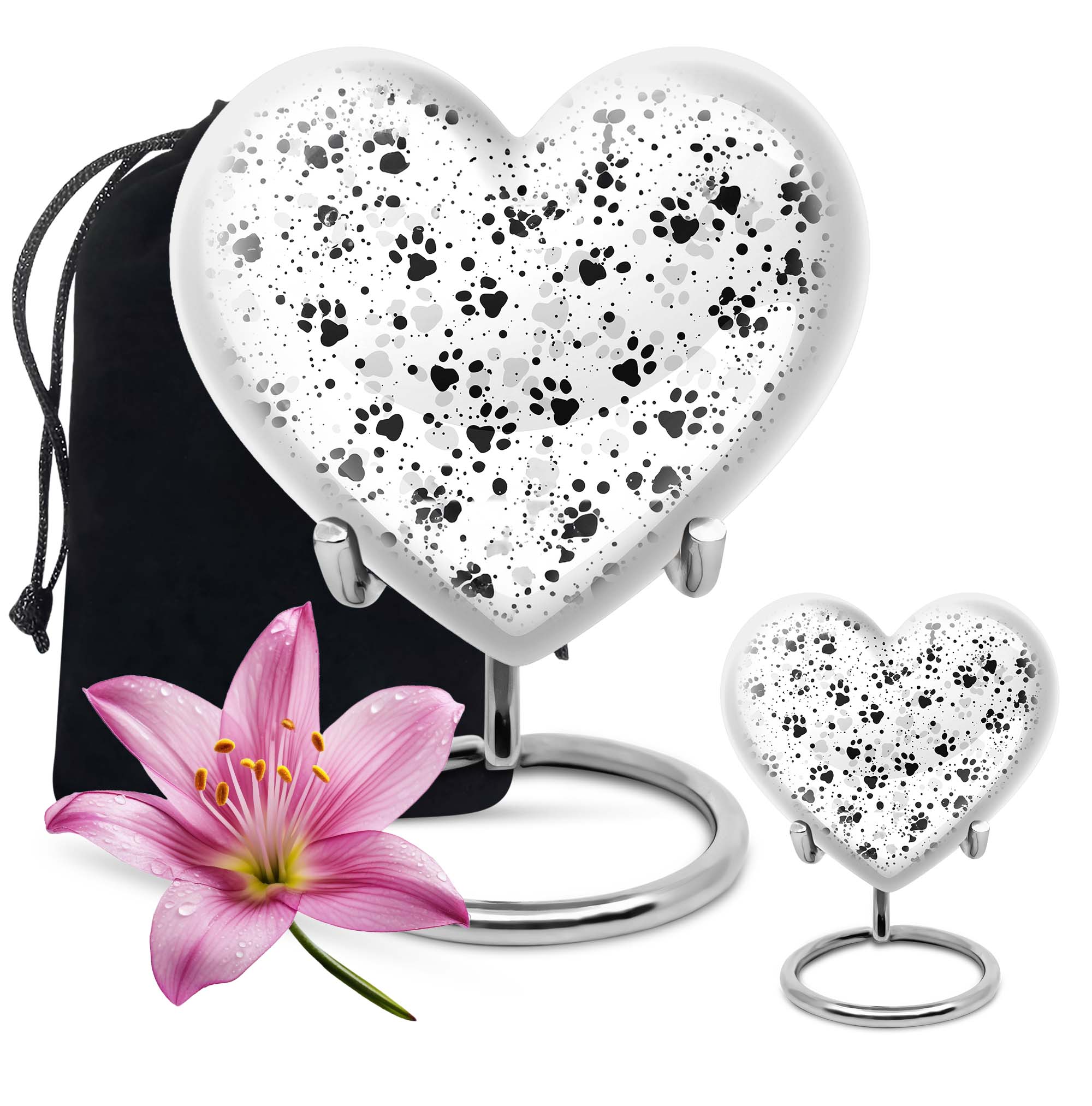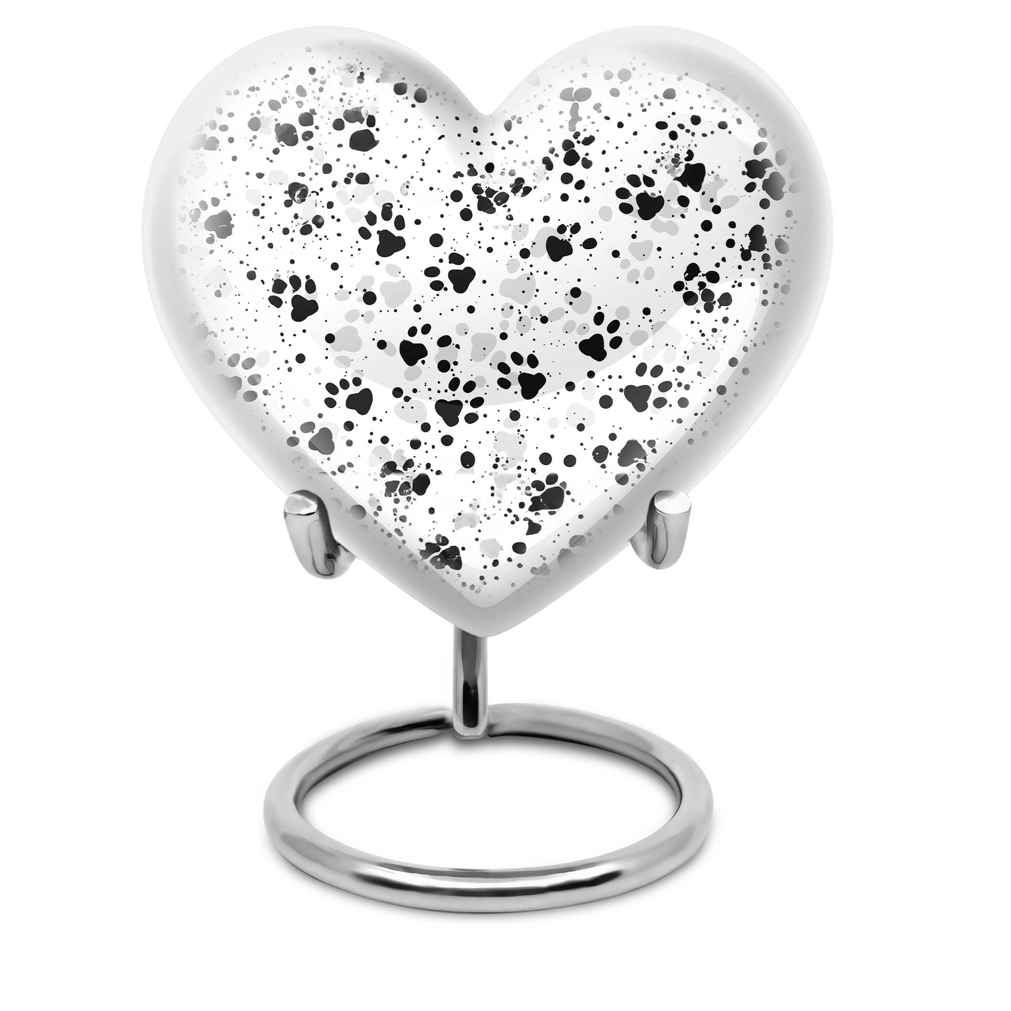 Discover the PAWS Urn, an impeccably crafted funeral keepsake designed for male adults. Tailored with an abstract theme, this large urn is precisely constructed with the highest standard aluminium to serve as a treasured memorial. Holding a generous capacity of 200 cubic inches, its robustness is further highlighted by its 10-inch stature and a weight of 3.3 pounds. The urn's quaint customization feature allows you to personalize it with engraved names, adding a touch of intimate remembrance. Its unique 'heart urn' design sways away from traditional urn forms, providing an endearing aesthetic. The product also comes with a plush velvet pouch intended for the safeguarding of ashes. While primarily specified as a 'cremation urn' for males, it is not limited as such. Our collection also includes female urns and Companion Urns for Two Adults. Please note that irrespective of its use, every single urn is crafted with the highest level of dedication, symbolizing love, honor, and respect.