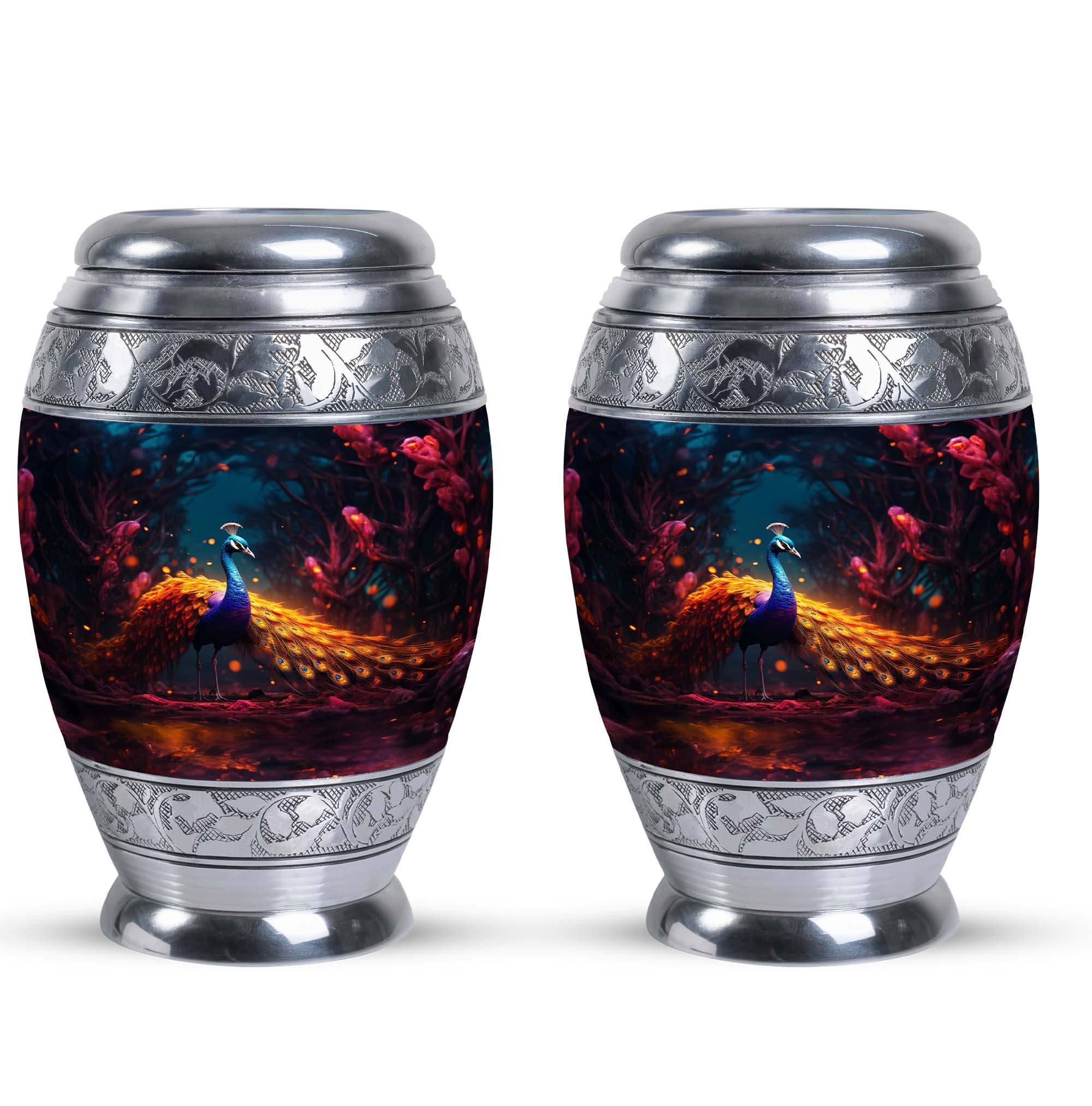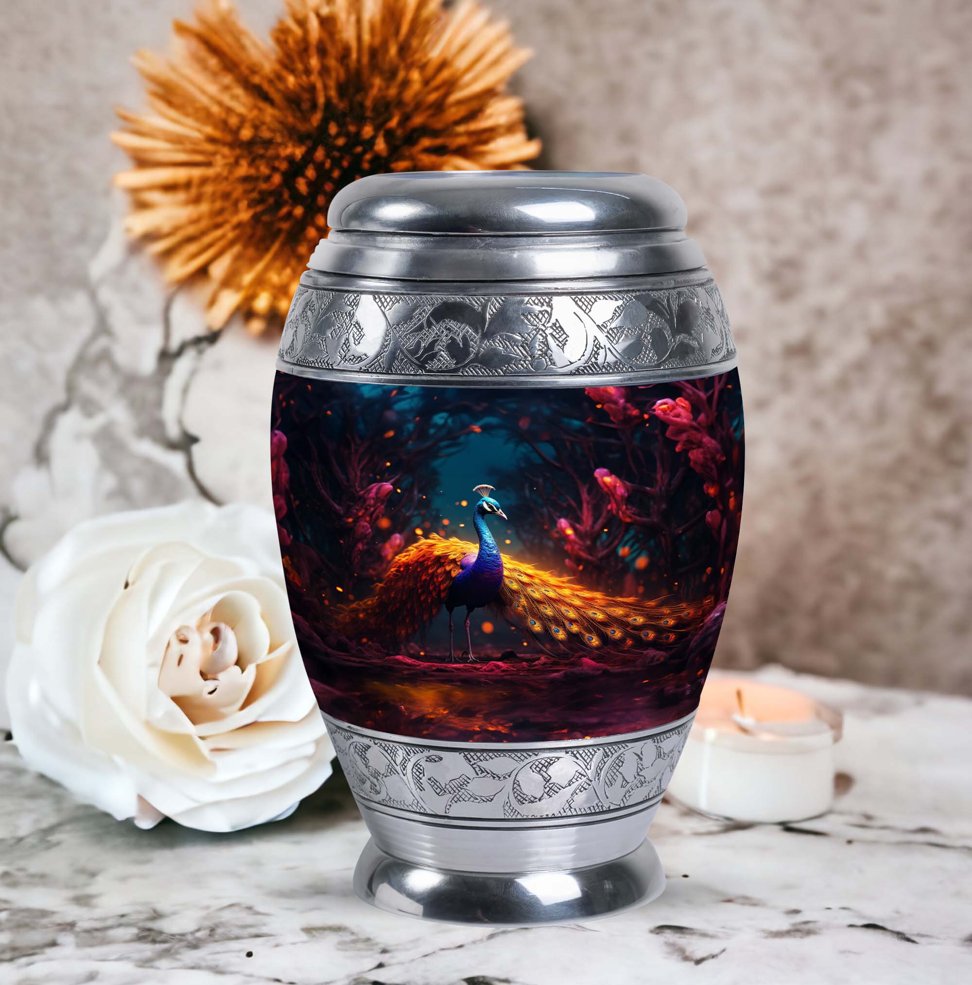 Presenting our meticulously crafted Blue Peacock Aluminum Urn for human ashes - an eloquent tribute and resting place for your loved one. Encompassing a striking blue peacock hue, this large urn exhibits a timeless, classic urn design apt for fitting remembrance. This personalized urn offers a generous capacity of 200 cubic inches, ample space for preserving the ashes of a cherished soul. Its robust construction of high-quality aluminum ensures longevity while keeping the urn's weight at a manageable 3.3 pounds. Standing at 10 inches in height, it adds an imposing yet tranquil presence to any room decor. Accompanied by a soft velvet pouch for dedicated containment of ashes, it enhances the sense of honor, fostering easy transport or storage when needed. Unique secondary keywords like 'Metal Cremation Urns', 'Urns for Human Remains', add to the uniqueness of our product, catering to those in search of memorable memorial ceremony supplies. Enrich the remembering process with our custom urns, crafted for personalized comfort and heartfelt memories, allowing individuals to personalize with engraved names. A comforting commemoration for adults and seniors alike.