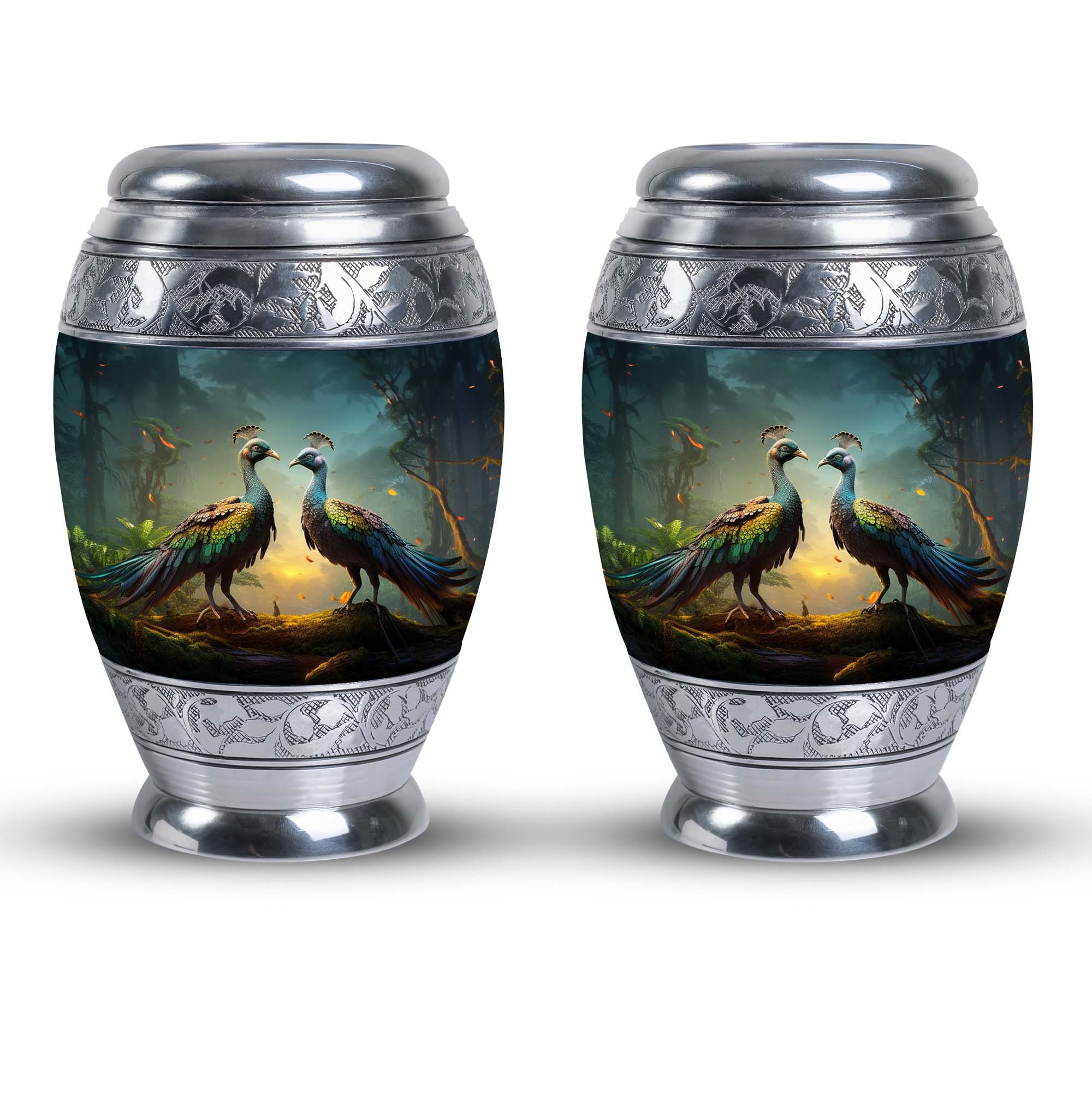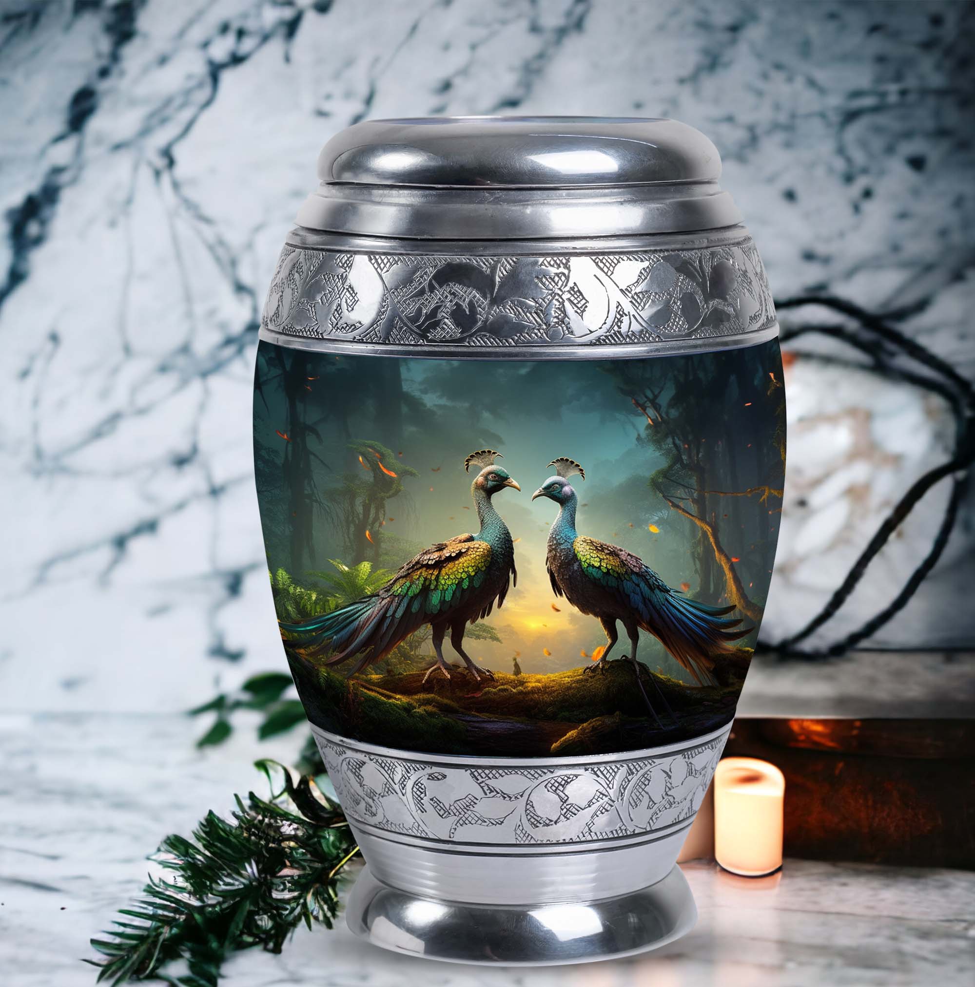 Introducing our resplendent Peacock Urns for Human Ashes, their exquisite design is an ideal homage to your loved ones. Crafted with utmost precision and high-quality aluminium, these 3-inch keepsake urns are not only elegant but extremely durable. Hefting a manageable 3.3 pounds, they stand at an impressive height of 10 inches and can securely hold up to 200 cubic inches of ash, making them apt for most adults. This classic urn series also offers a personal touch. Customize it by engraving names, bestowed with sentiments and eternal love on these unique Large Urns. Each urn comes complete with a special velvet pouch for containment of ashes, expressing a delicate and respectful approach to the task at hand. Embrace the essence of your beloved with our exceptional range of 'memorial urns' or gift a personal token of remembrance in the form of Urns for Men's Ashes. With the Peacock urn, let each ornate feather represent cherished memories, making your farewell as unique as the life lived. Note: Kindly avoid the usage of abrasive cleaning products to ensure longevity.