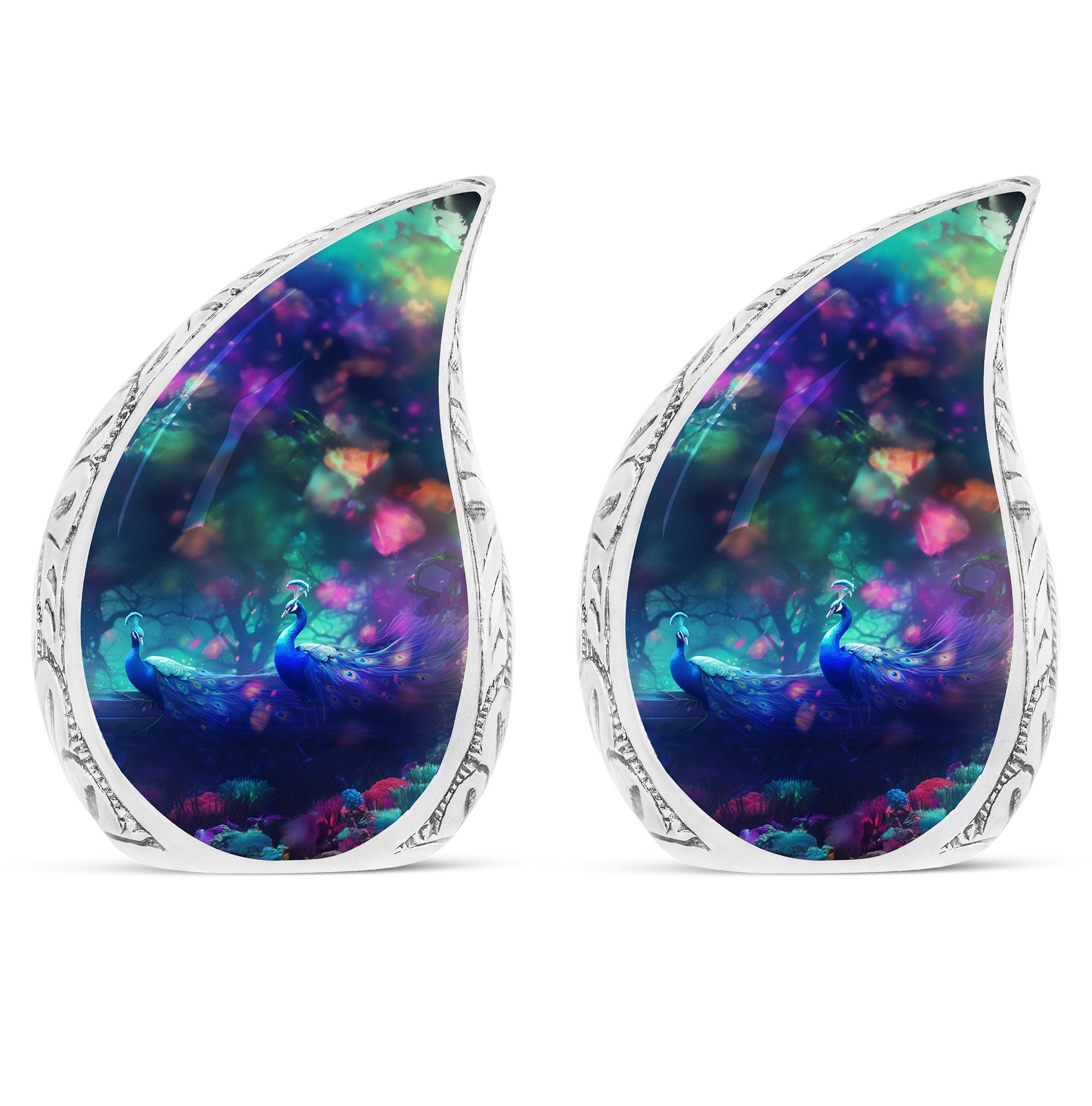 Honor your deceased loved ones and keep their memories alive with our exquisite 'Peacock Urn'. This large urn is meticulously crafted with great attention to detail from robust and lightweight Aluminium, boasting a superior quality that ensures long-term durability. Its beauty is truly timeless, thanks to the Classic Urn design. The size of this cremation urn is 3 inches, and the urn is sizable at 10 inches in height, with a capacity to hold up to 200 cubic inches of ashes, which weighs approximately 3.3 pounds. Provide an intimate final touch with the option to personalize this urn with engraved names, creating a poignant reminder of your loved one. Each Peacock Urn comes with a plush velvet pouch providing a dignified containment for the ashes. Ideal for honouring your beloved mom, or other cherished family members. The Peacock Urn brings together elegance, simplicity, and personalization, quintessential qualities for a memorial that reflects the uniqueness of your dearly departed.