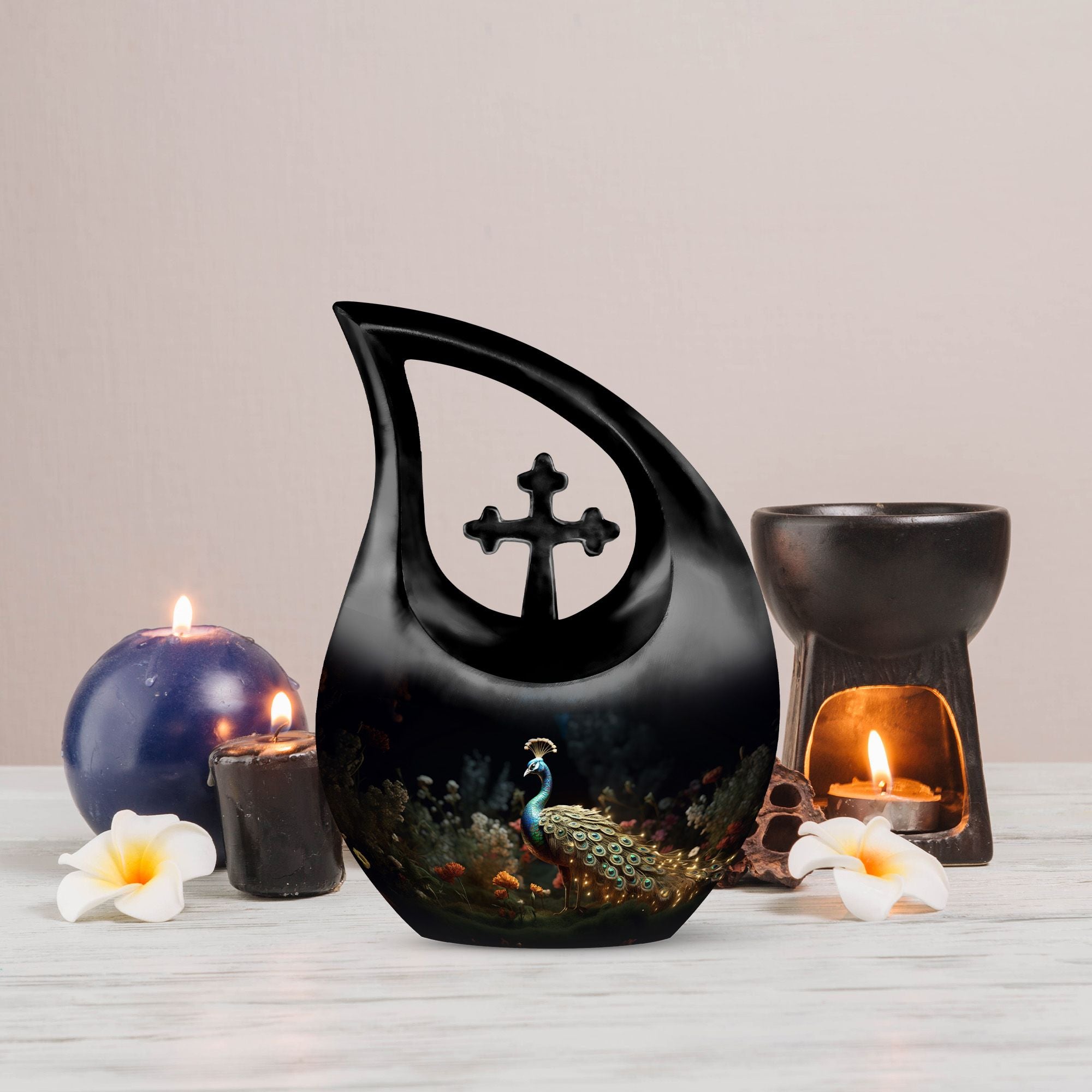 Discover a beautiful tribute to your loved one with this large Peacock Urn. Crafted from sturdy aluminium, it stands 10 inches in height, adding a celestial presence to any space. Its weight of 3.3 pounds contributes to a solid, tangible sense of stability. The Cross Drop urn design affirms its holy attributes, offering a touching reminder of faith. Its size is perfect for commemorating, able to hold up to 200 cubic inches of ashes. Each purchase comes with a plush velvet pouch, further elevating the prestigious aura it emulates. Add a personal touch through customization; engrave the names of your dearly departed, ensuring that their memory is forever etched. Not just a memorial urn, but a centerpiece of remembrance. With its graceful Peacock theme, it's more than just a large urn for human ashes - it's a work of art. Navigate the journey of loss with elegance, without compromising on affordability, with this exquisite piece. Rarely found in the market of miniature urns for ashes, it makes the task of remembrance less daunting and more divine.