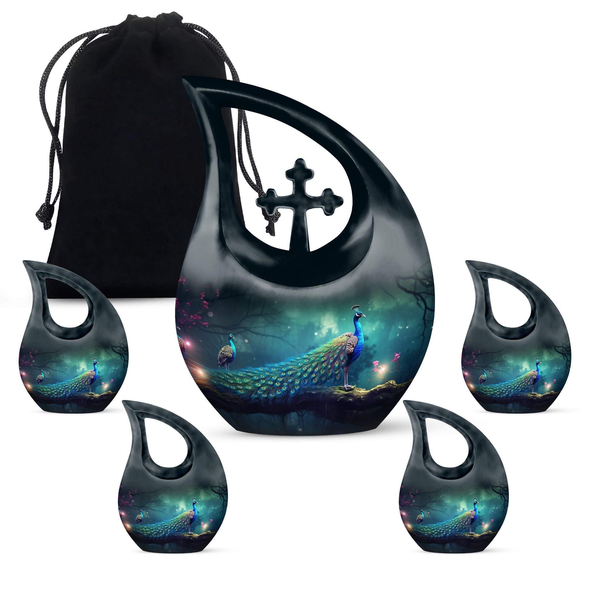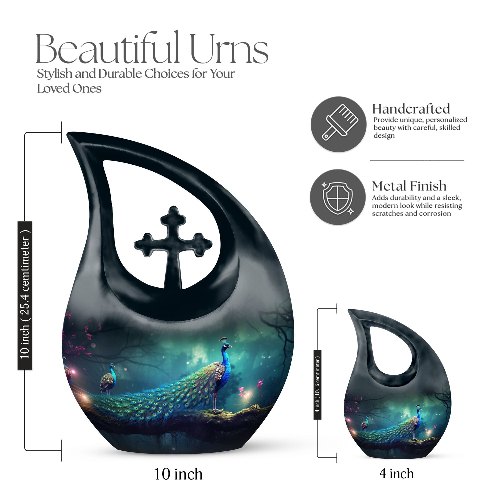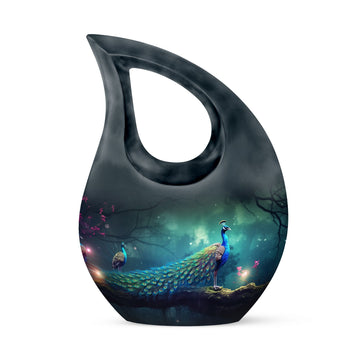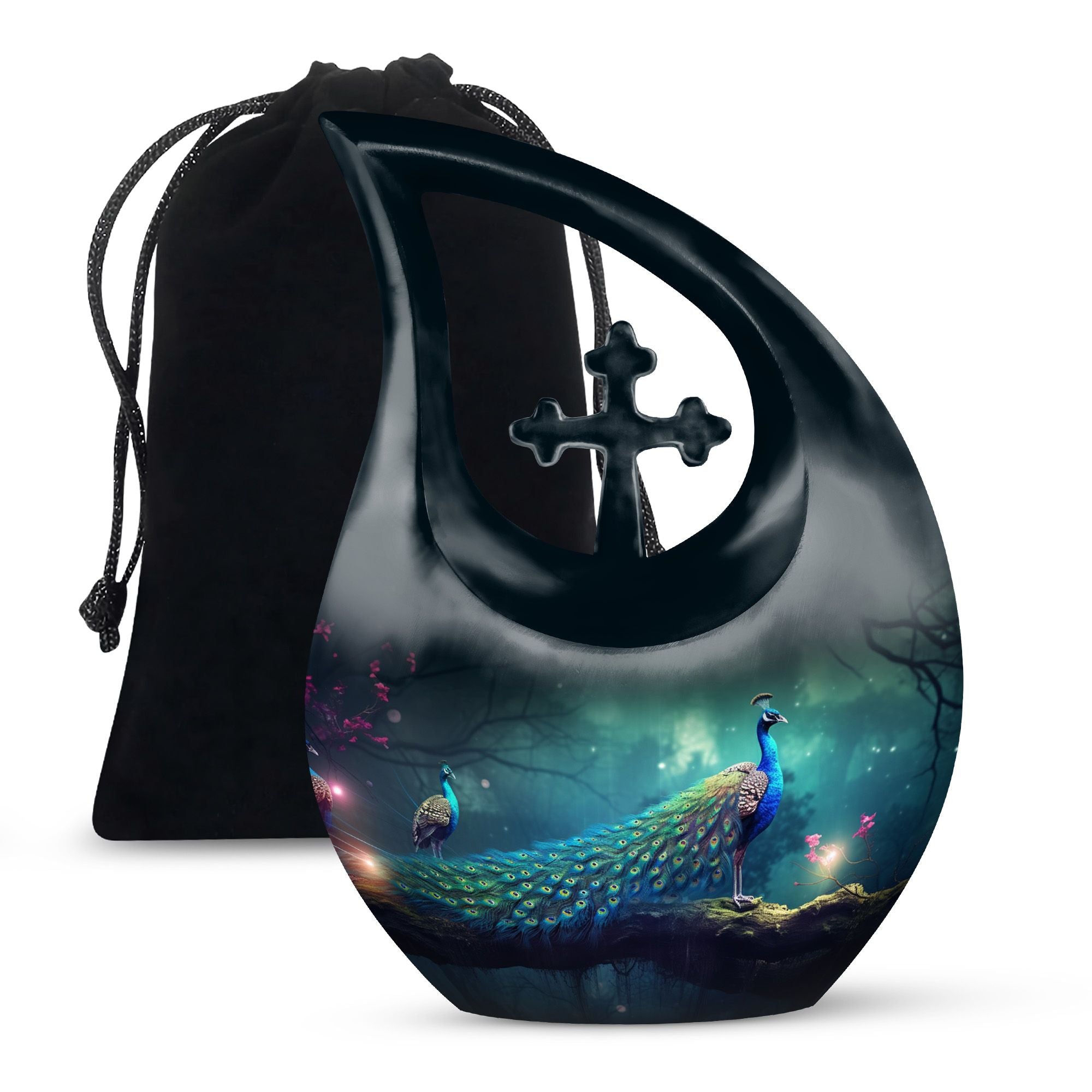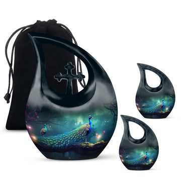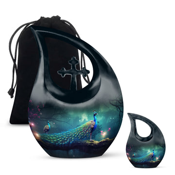 Celebrate your loved one’s eternal journey with the Black Cross Design Urn with Peacocks and Magical Lights. This striking adult funeral urn blends faith, symbolism, and artistry, offering a meaningful way to preserve cherished memories. The radiant peacocks represent peace and eternal life, while the glowing cross detail evokes hope and divine protection — a truly unique urn for human ashes that comforts the heart and uplifts the spirit.