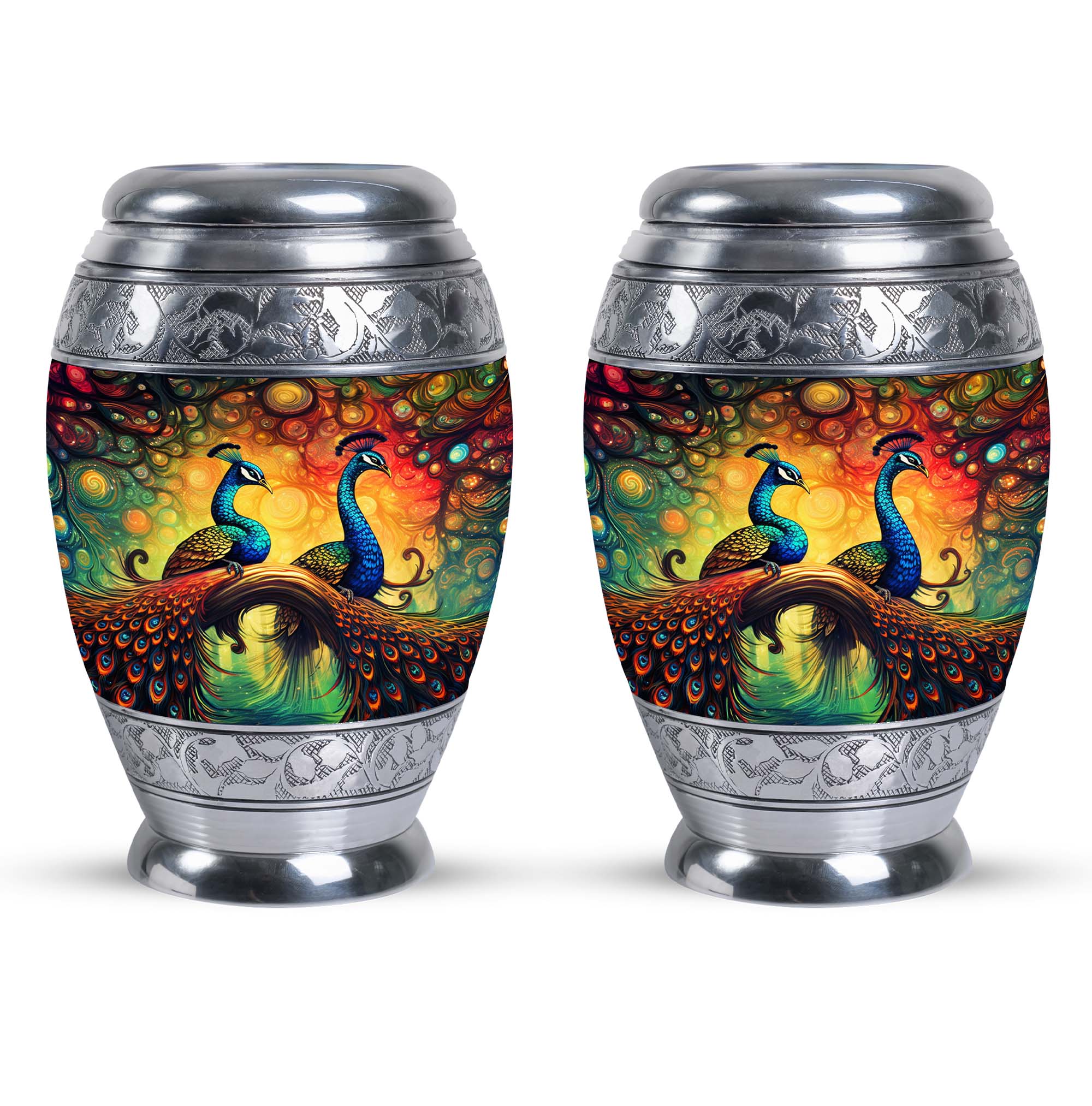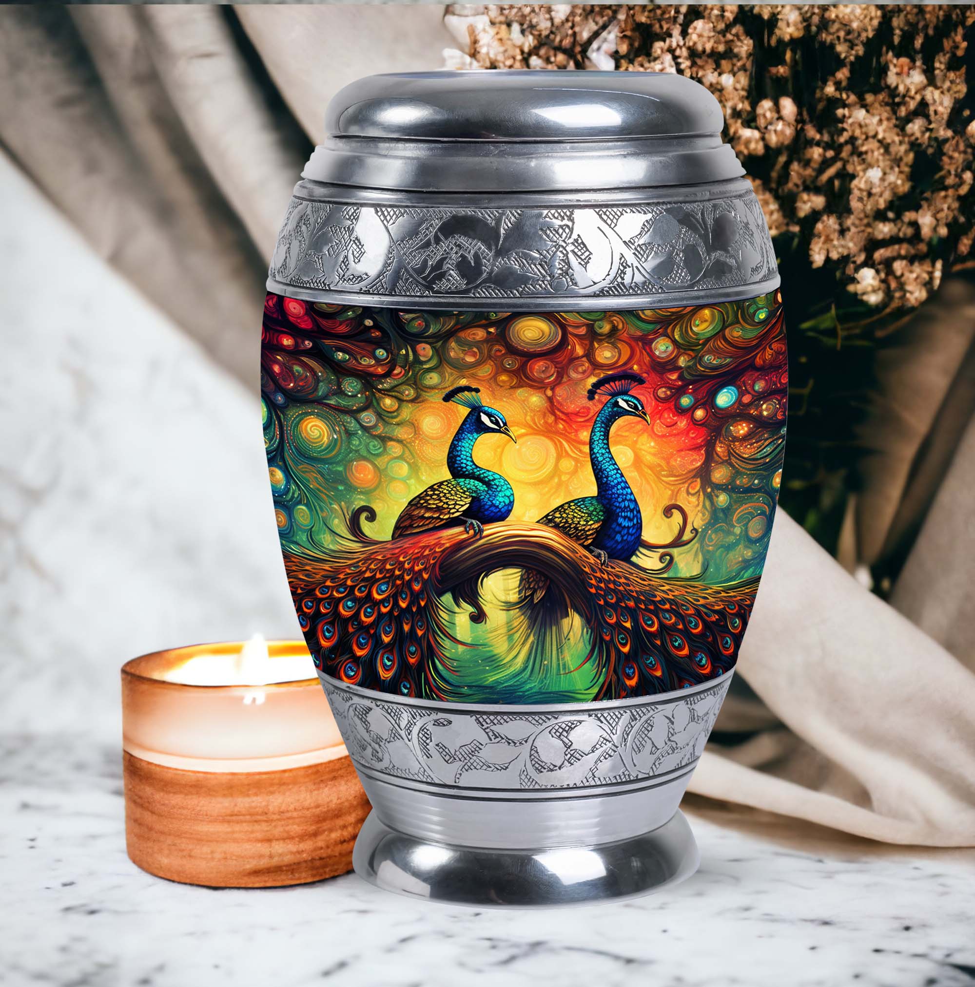 Render your heartfelt condolences with this elegant Classic Urn, a fitting memorial cremation urn designed diligently with the fine craftsmanship. Sized at 3 inches, it exudes grace while providing ample 200 cubic inches capacity for ashes. This robust urn, despite weighing just 3.3 pounds, stands tall at 10 inches, from its base to its peak. Meticulously shaped out of durable aluminium, it serves as a long-lasting tribute to your beloved. Along with this tasteful urn, we provide a soft velvet pouch for proper containment of the ashes, adding a layer of respect and dignity. To make this Peacock Urn for Ashes more personalized and special, it accommodates the possibility of engraving names. It is more than an urn - it's an honor-laden focal point that echoes the words, 'sorry for your loss.' Explore our range of metal urns, including unique urns for dad, cool urns for ashes, large urns, and cremation containers for ashes that help to meticulously memorialize your departed ones.