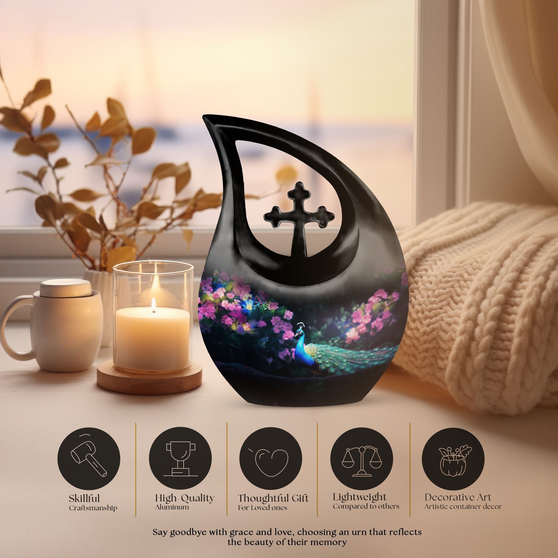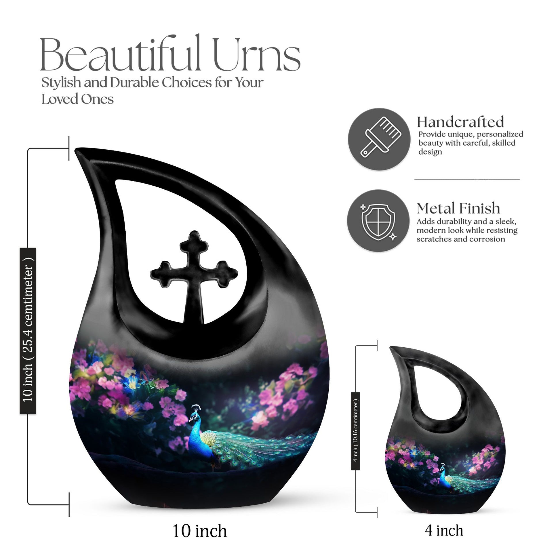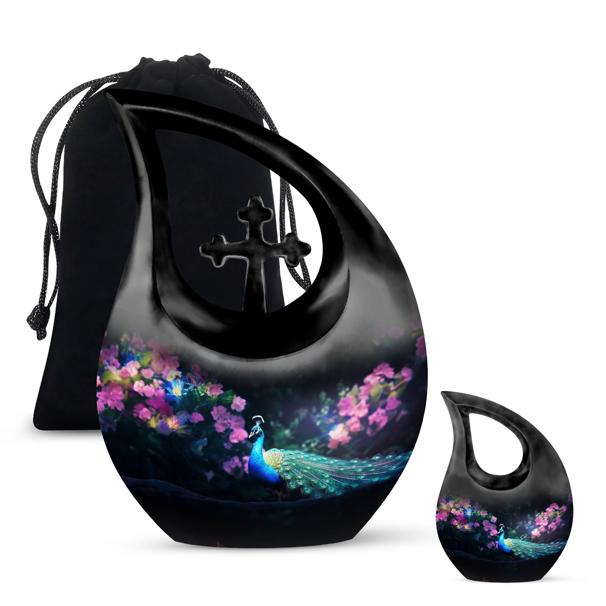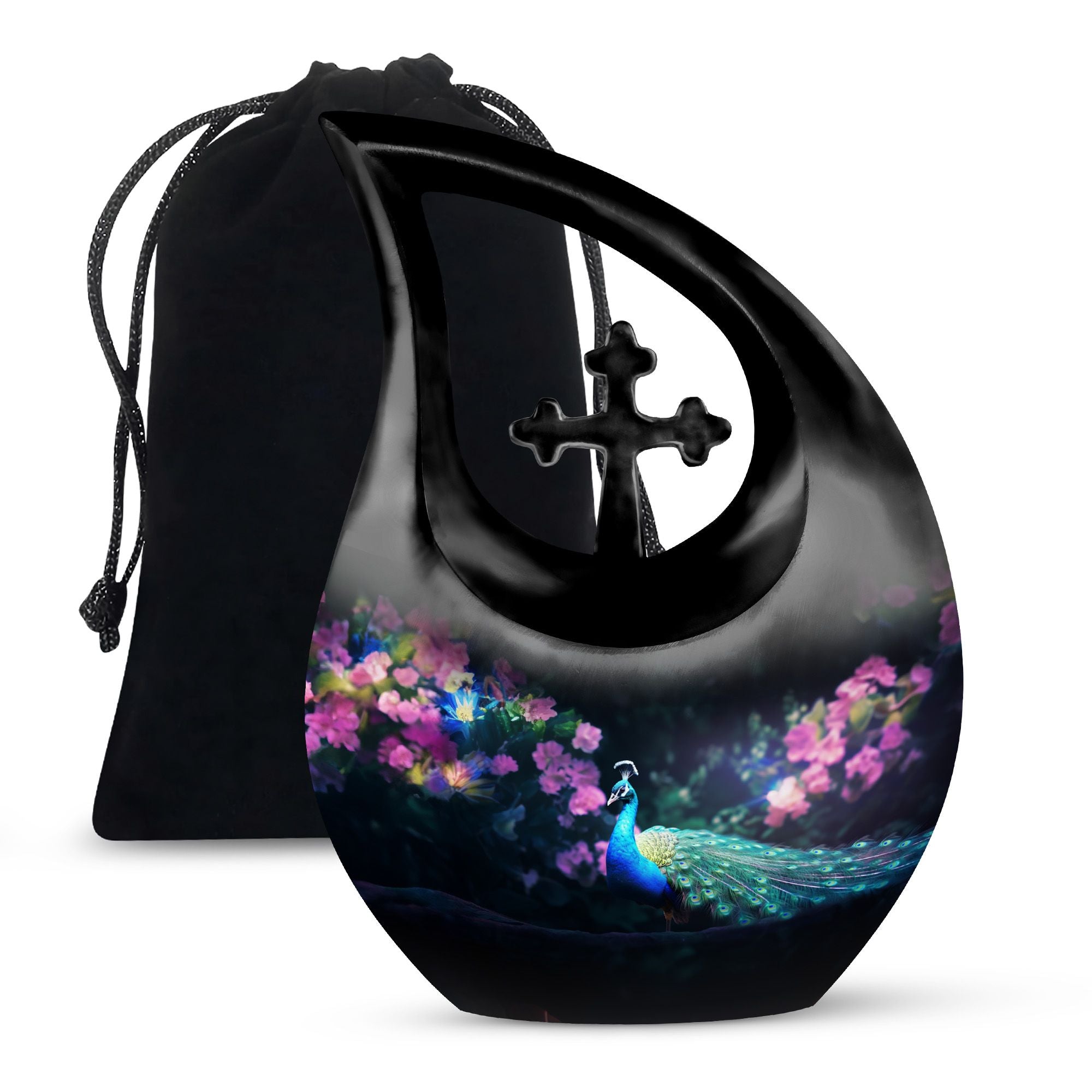 Express your warmth and remembrance with our stunning Peacock Urn, a reverence-inspired piece to honor your dearly departed. Crafted with excellence, this large cremation urn stands at 10 inches high, designed meticulously with a symbolic Cross Drop theme. Made from durable aluminium, it proves to be a lasting keepsake. The urn offers an ample capacity of 200 cubic inches, suiting the personal needs of most individuals. A lightweight treasure at 3.3 pounds, it is accompanied with a delicately textured velvet pouch, perfect for containment of ashes. Elevate its sentimentality by personalizing it with engraved names, catering to your commemorative essence. Distinct yet affordable, this urn aligns with your memorial urns related searches and serves as a heartfelt addition to any sacred space. Discover comfort in remembering your loved one with a touch of elegance and reverence.