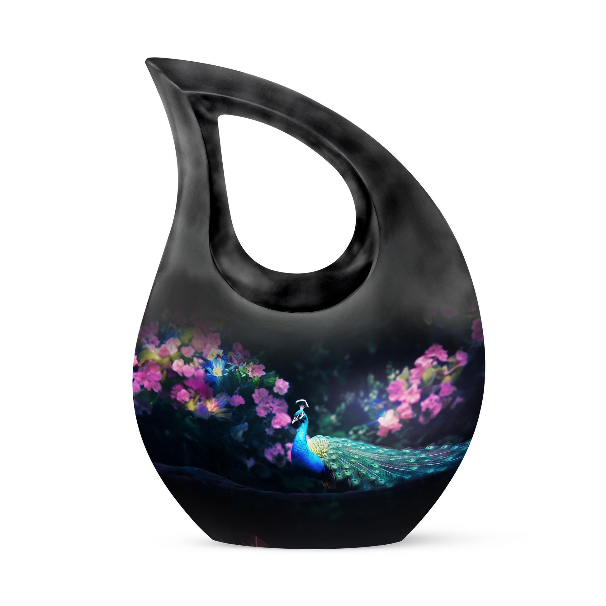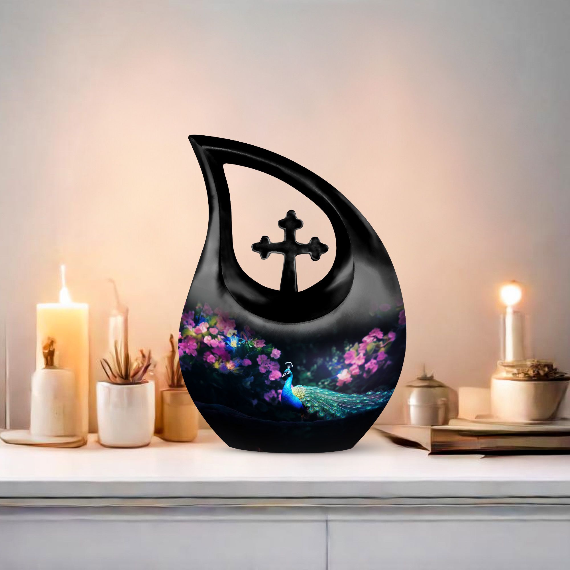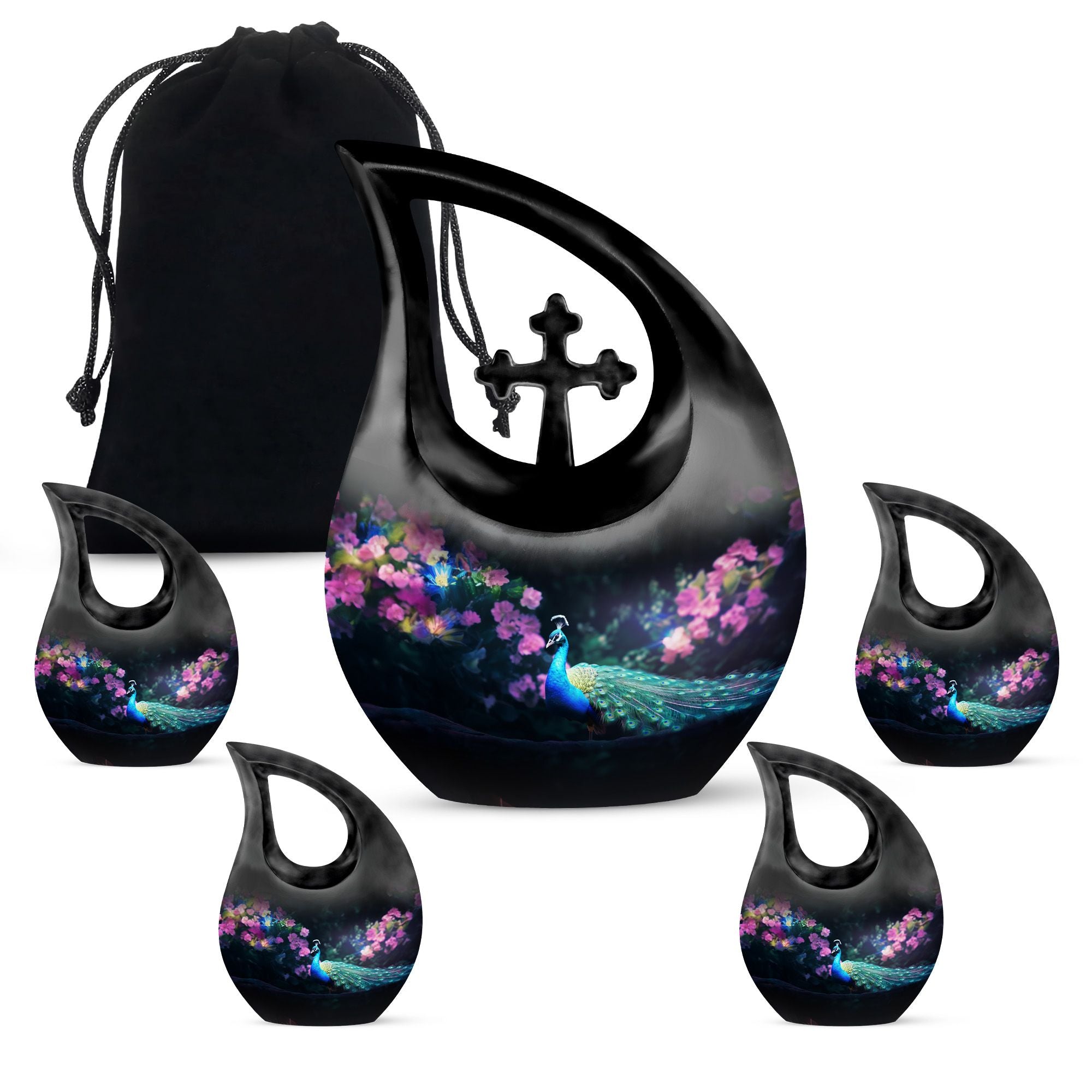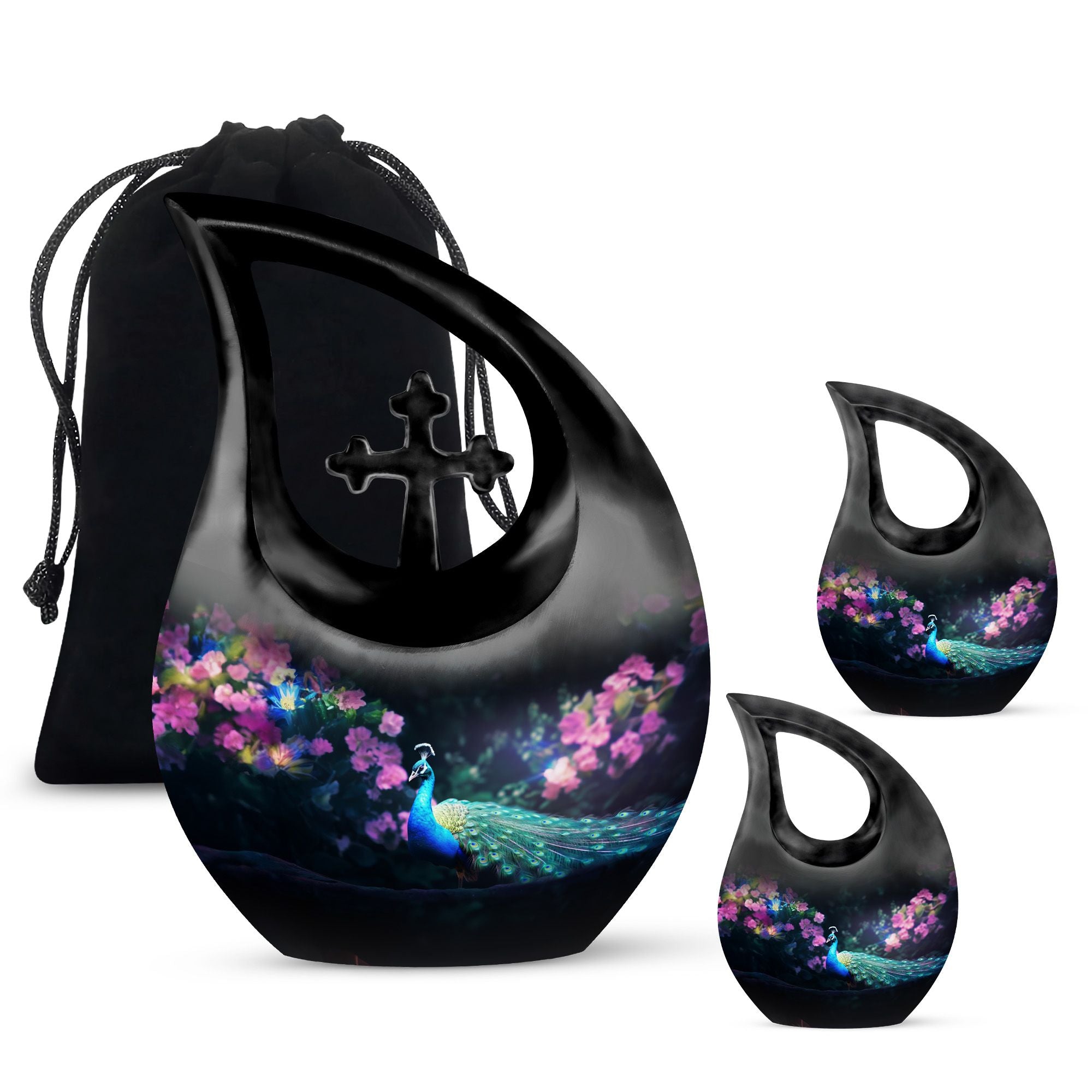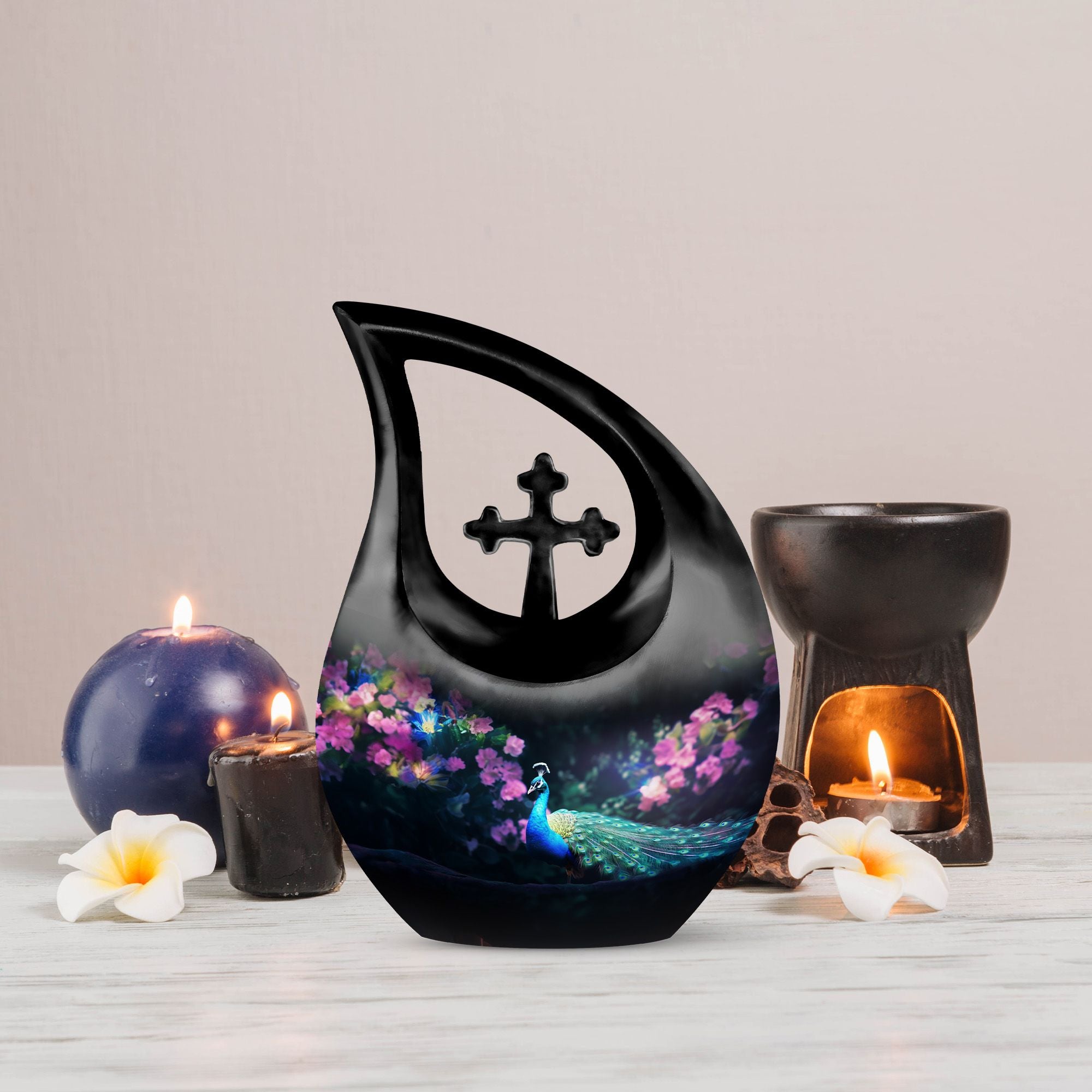Express your warmth and remembrance with our stunning Peacock Urn, a reverence-inspired piece to honor your dearly departed. Crafted with excellence, this large cremation urn stands at 10 inches high, designed meticulously with a symbolic Cross Drop theme. Made from durable aluminium, it proves to be a lasting keepsake. The urn offers an ample capacity of 200 cubic inches, suiting the personal needs of most individuals. A lightweight treasure at 3.3 pounds, it is accompanied with a delicately textured velvet pouch, perfect for containment of ashes. Elevate its sentimentality by personalizing it with engraved names, catering to your commemorative essence. Distinct yet affordable, this urn aligns with your memorial urns related searches and serves as a heartfelt addition to any sacred space. Discover comfort in remembering your loved one with a touch of elegance and reverence.