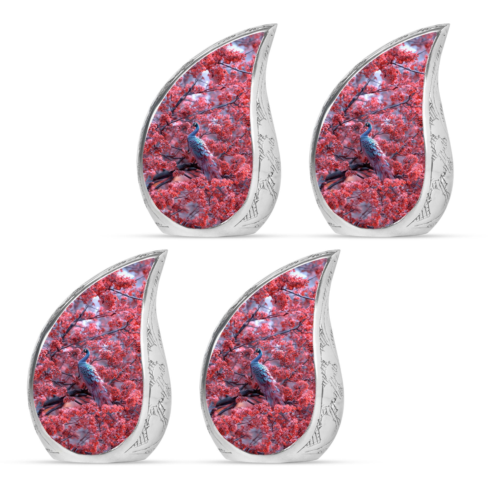 Made from durable aluminum, this urn ensures strength while showcasing an artistic red floral and peacock design. Its compact size makes it suitable as a small cremation urn for ashes, a mini cremation urn for human ashes, or one of several urns for cremation ashes small when families wish to share ashes. With a secure screw-top lid, this cremation urn small provides peace of mind that remains are safe.