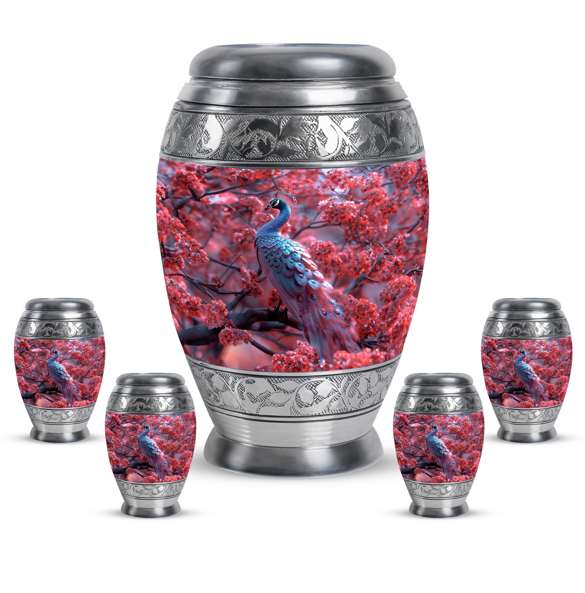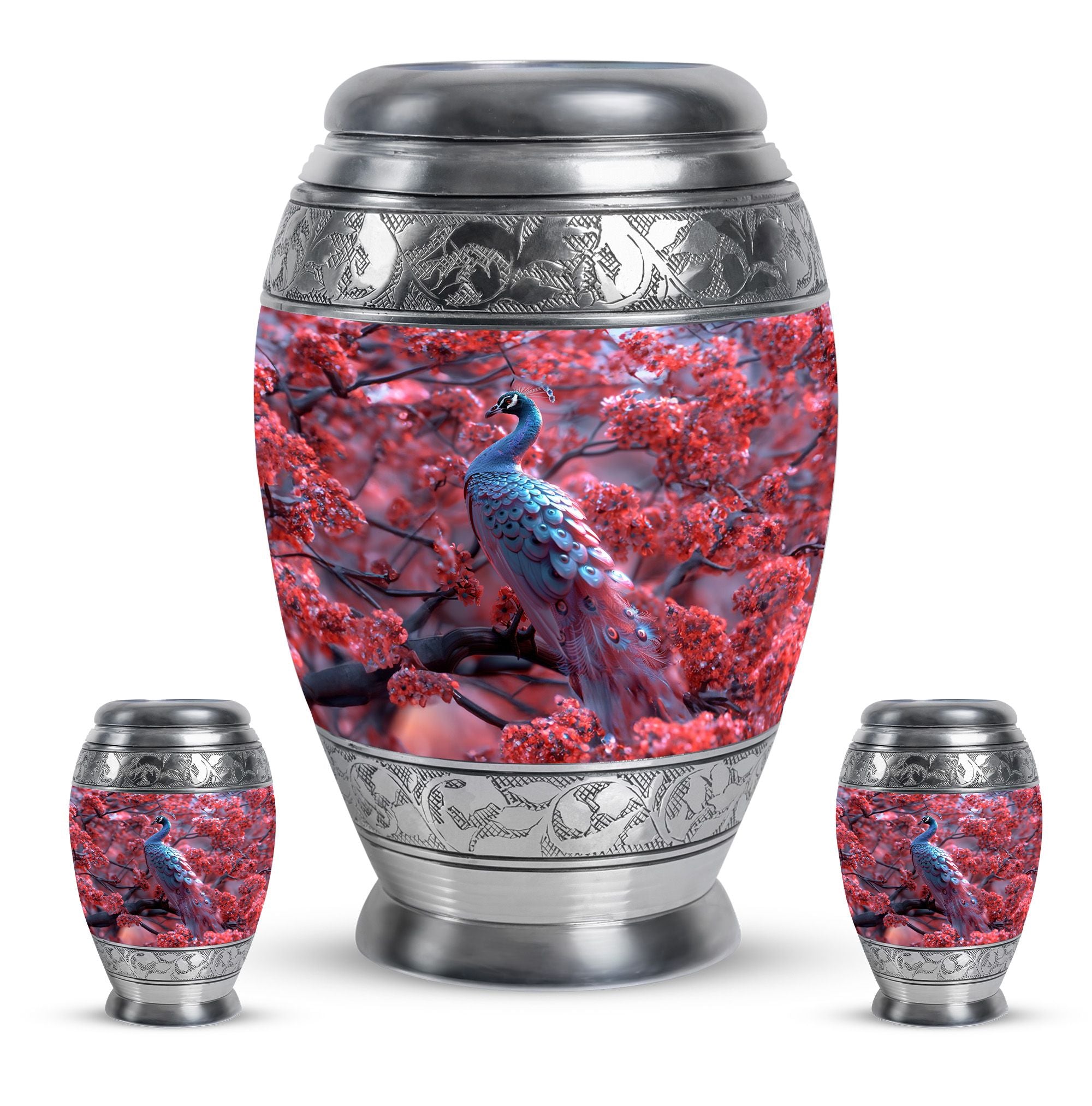 Unique Peacock Cremation Keepsake Urns - Red Floral Urn For Ashes