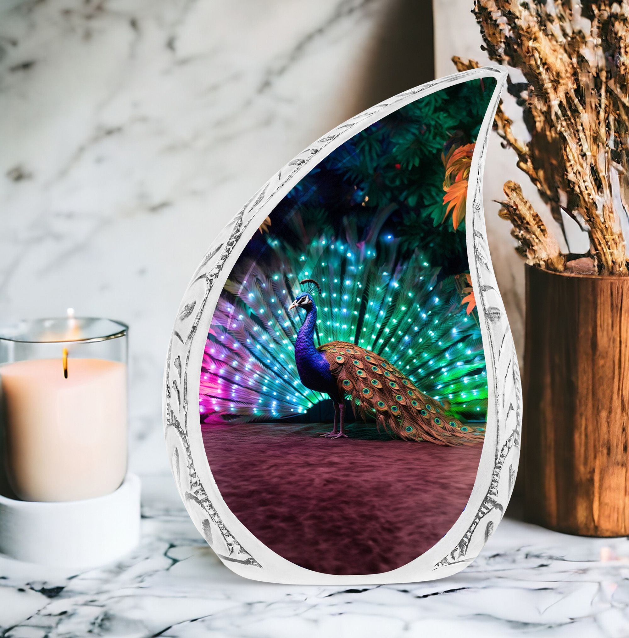 Experience an embodiment of reverence and honor with our meticulously crafted Peacock Cremation Urn. A perfect commemorative piece that offers a dignified resting place for your loved ones. Made from high-quality aluminium, this large urn with dimensions of 10 inches in height, and weight of 3.3 pounds, can capacitate up to 200 cubic inches of ashes. Each purchase includes a lavish velvet pouch for proper containment and solemnity. With its sturdy construction, it guarantees preservation and protection over time. Our urns offer an option to add a personal touch through engraved names, allowing a special way to remember your beloved. This peacock urn does not only serve as a vessel but also resonates the adoration and respect we have for our departed. Please note that these urns for people comply with all guidelines and standards necessary for such items. Perfect for those searching for 'cremation urn', 'customized urns for ashes for adults', or 'urn container'.