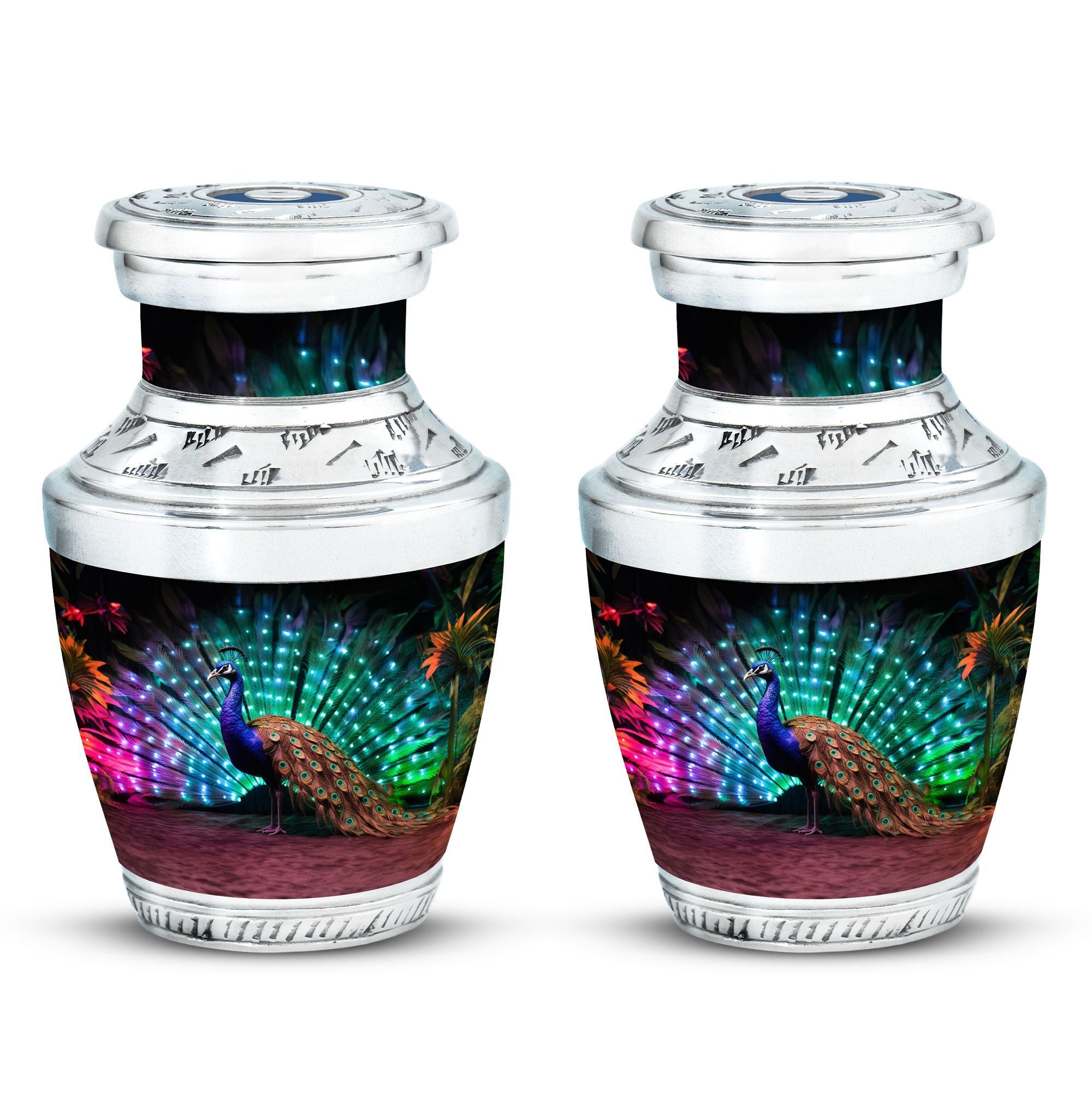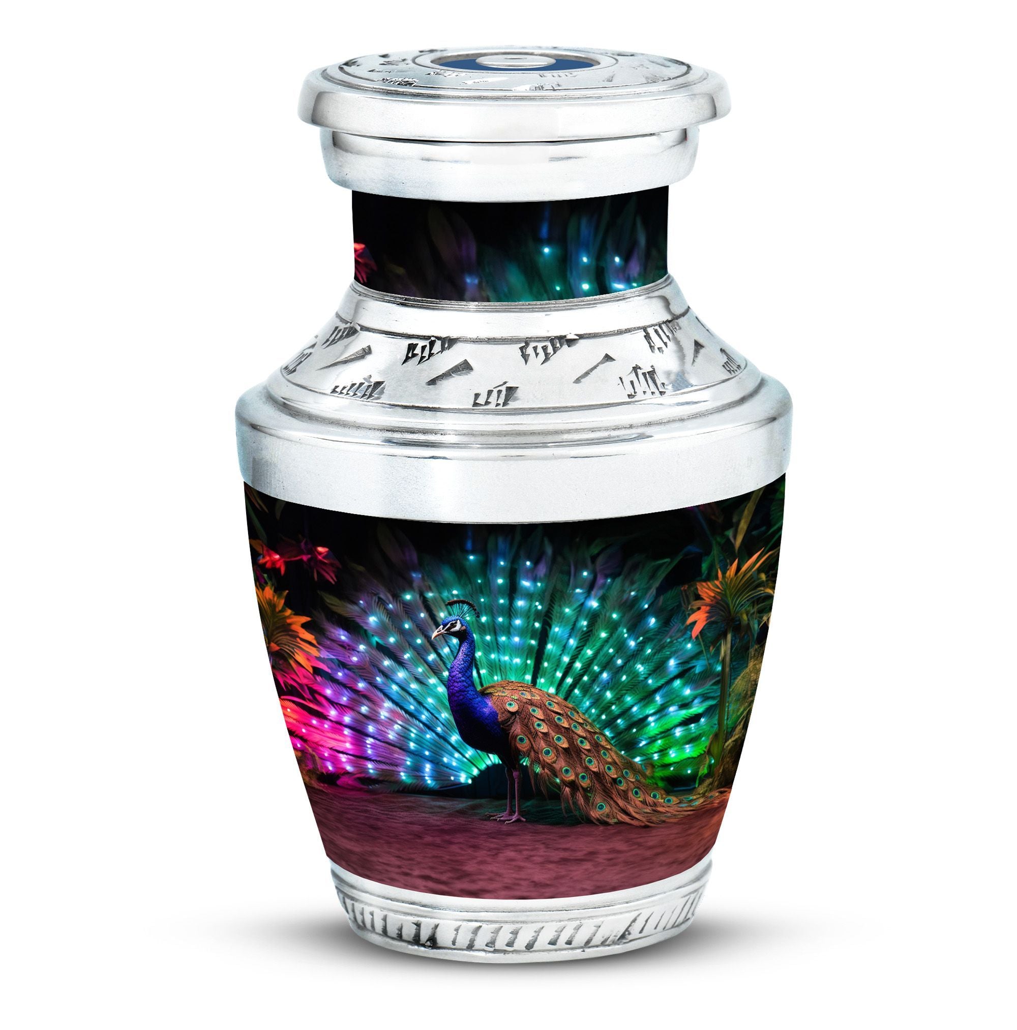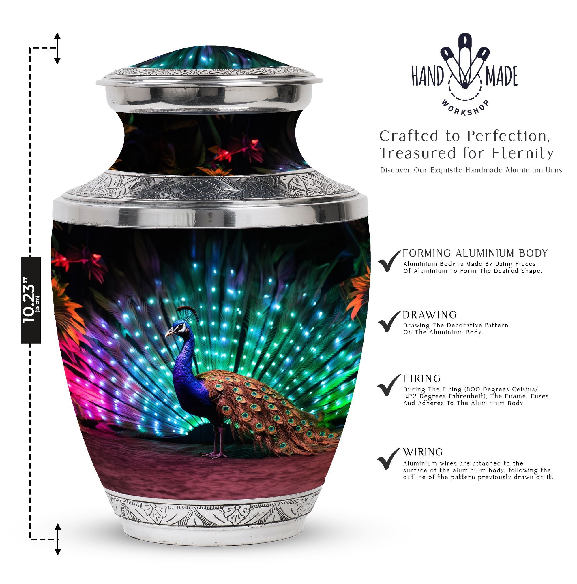 Honor the memory of your loved ones with the Peacock Cremation Urn, delicately crafted to hold cherished ashes. This Large Urn, sculpted from durable Aluminium, stands 10 inches tall and weighs a sturdy 3.3 pounds. The urn container features a noble capacity of 200 cubic inches, gracefully accommodating the remains of an adult. Each purchase includes a regal velvet pouch to ensure the secure containment of ashes. Its 3-inch size makes it both unobtrusive and conspicuous, appealing to your senses while silently honoring the departed. Inherently vigilant to the nuances of preserving precious memories, we offer personalization services, allowing the engraving of names to make the urn truly unique. Examine our customized urns for ashes, designed to pay heartfelt respects to the departed. Shun ordinary urns for people and embrace the Classic Urn. Our product collection ensures that you find something beyond the typical 'cremation urn.' Note that Sensitively tailored towards the needs of seniors and adults, ours are human urns with a difference. Kindly place your order and etch an eternal remembrance.