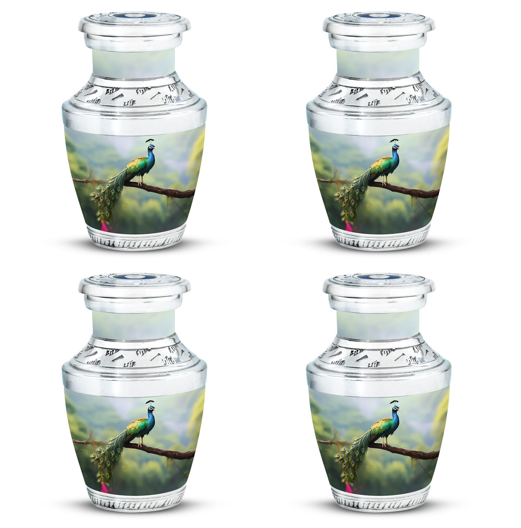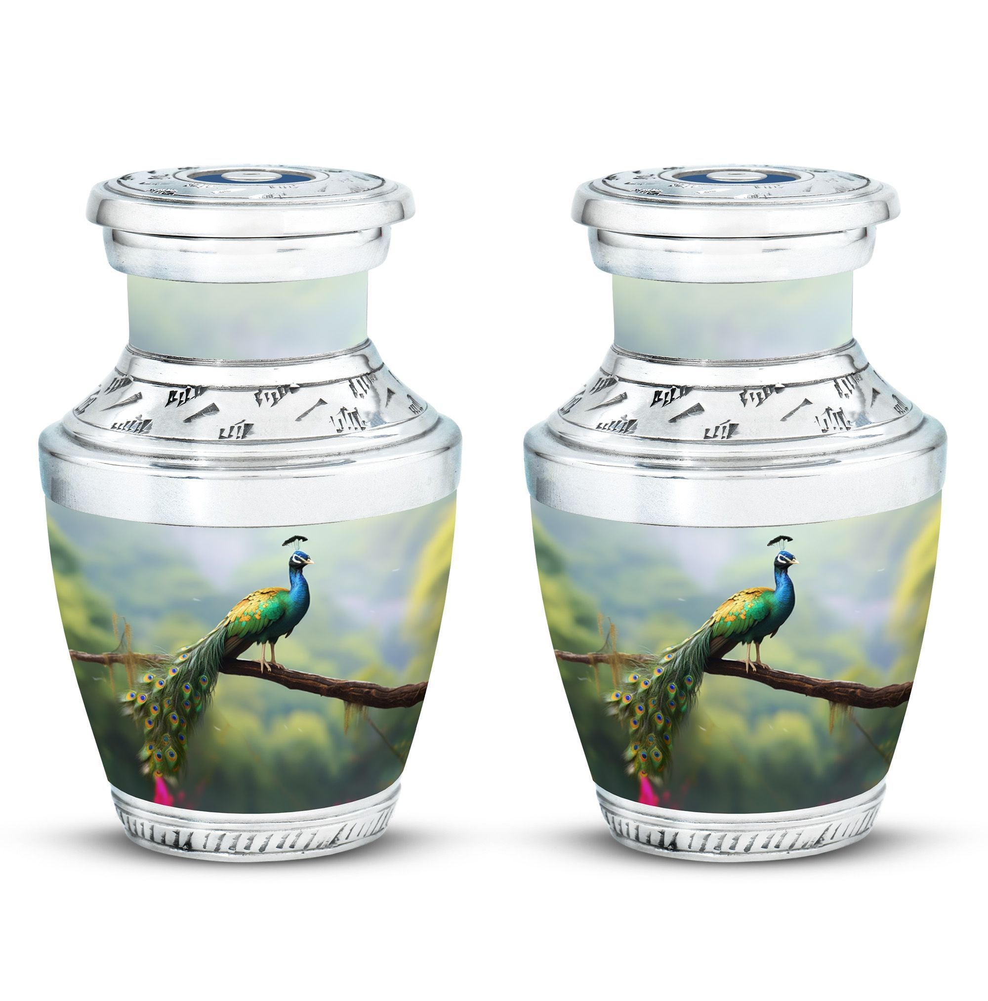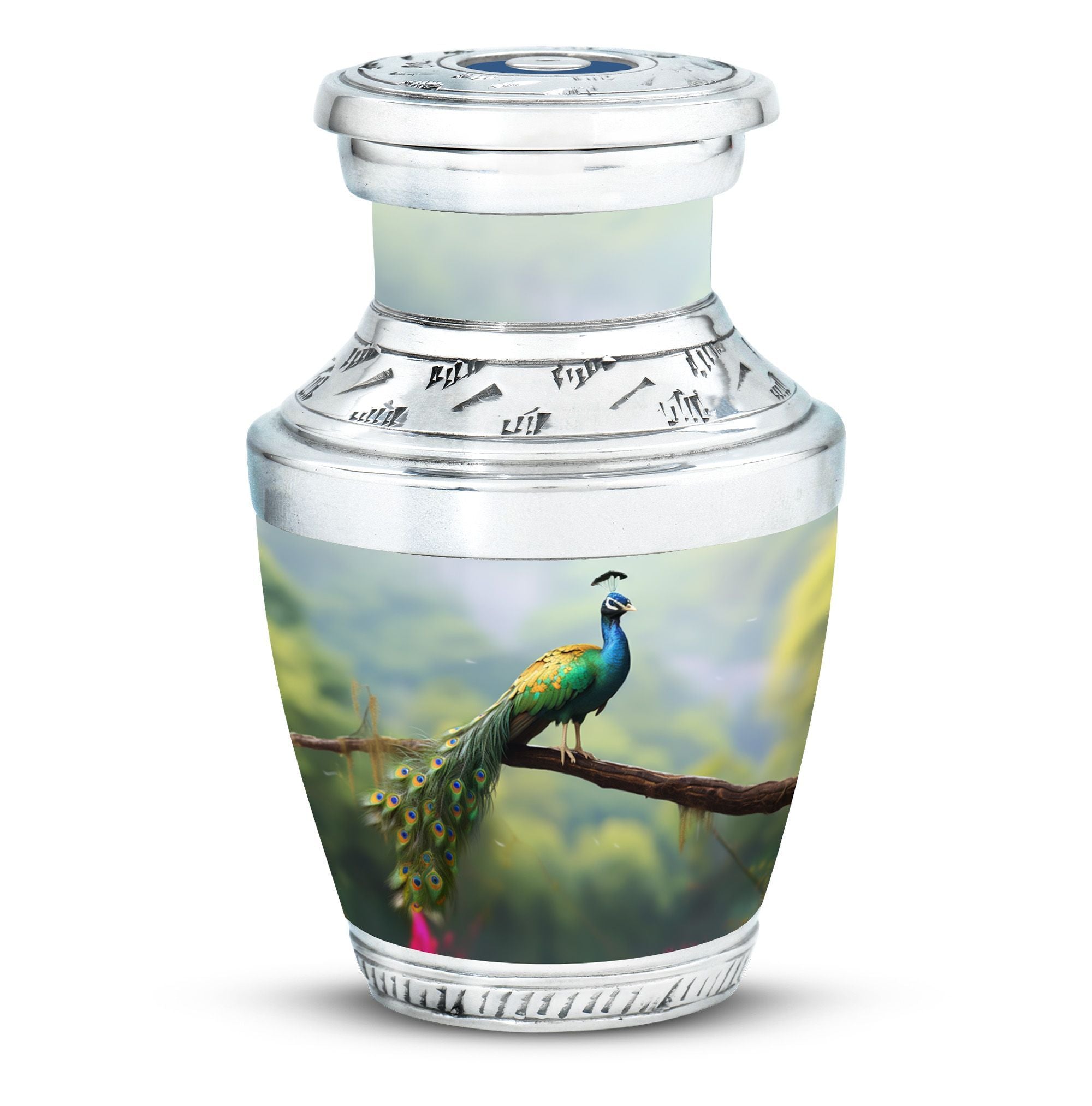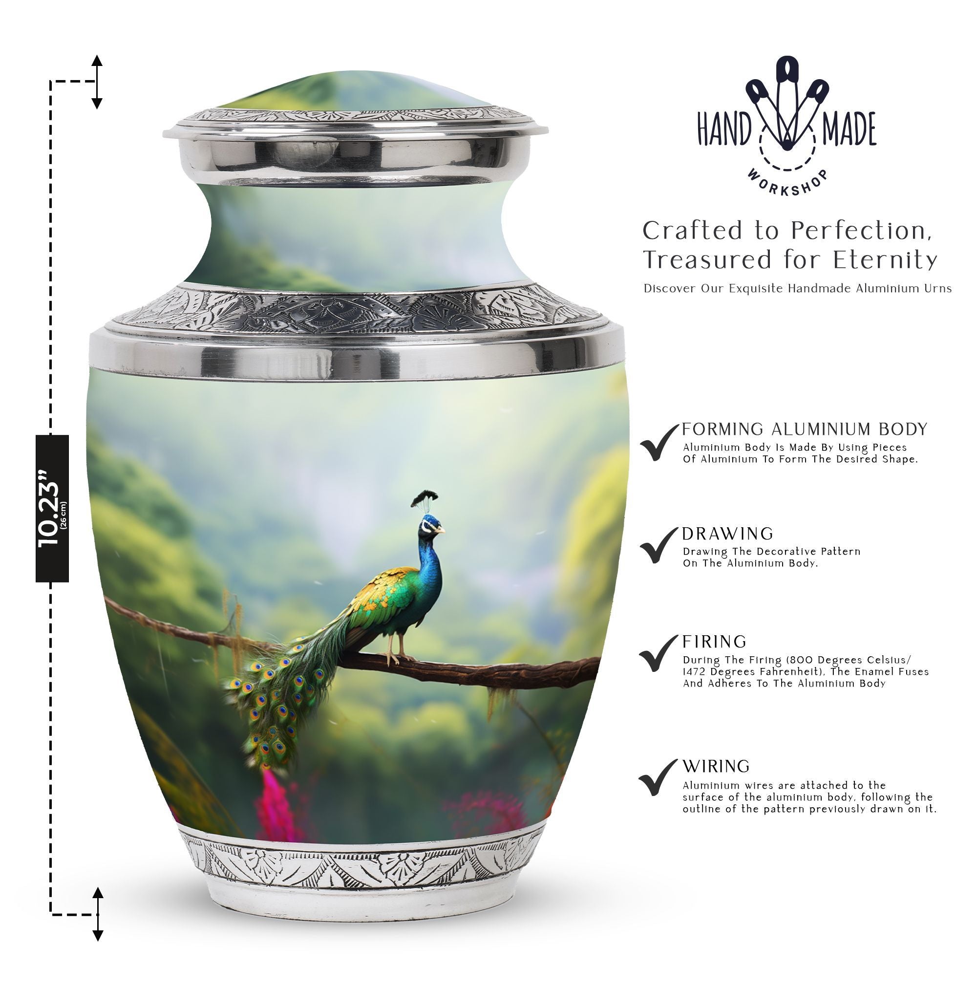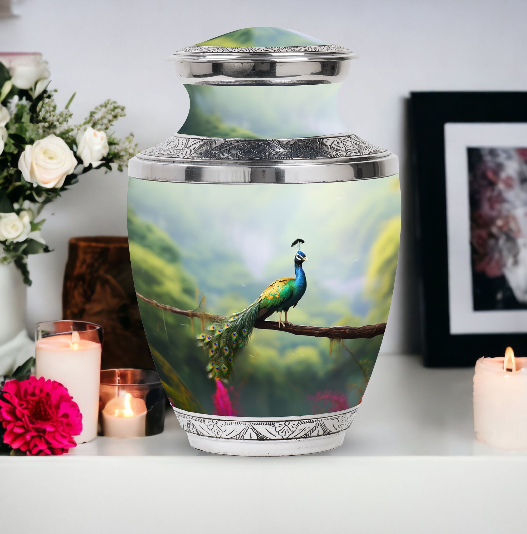 Journey with your loved one's memory in our 'Large Aluminum Peacock Urns for Ashes'. Capturing the solemn dignity of the memorial ceremony, these urns are designed with great thoughtfulness, perfect for 'urns for ashes for adults'. This comforting 'cremation urn' stands 10 inches tall and can hold up to 200 cubic inches. It is not a typical classic urn. It has a robust weight of 3.3 pounds, speaking of its solid, durable nature. The urn comes with a soft velvet pouch, a respectful containment for the ashes. Of note is the opportunity to personalize this large urn with engraved names, adding a touch of intimacy to the remembrance while using 'Urns for Human Remains'. Even better, 'Urn for Ashes for Dad' and 'Decorative Urns for Ashes' make personalized urns a unique gift for a friend or a poignant piece for yourself. Seize this 3-inch quintessential memorial product to pay tribute to those you've cherished.