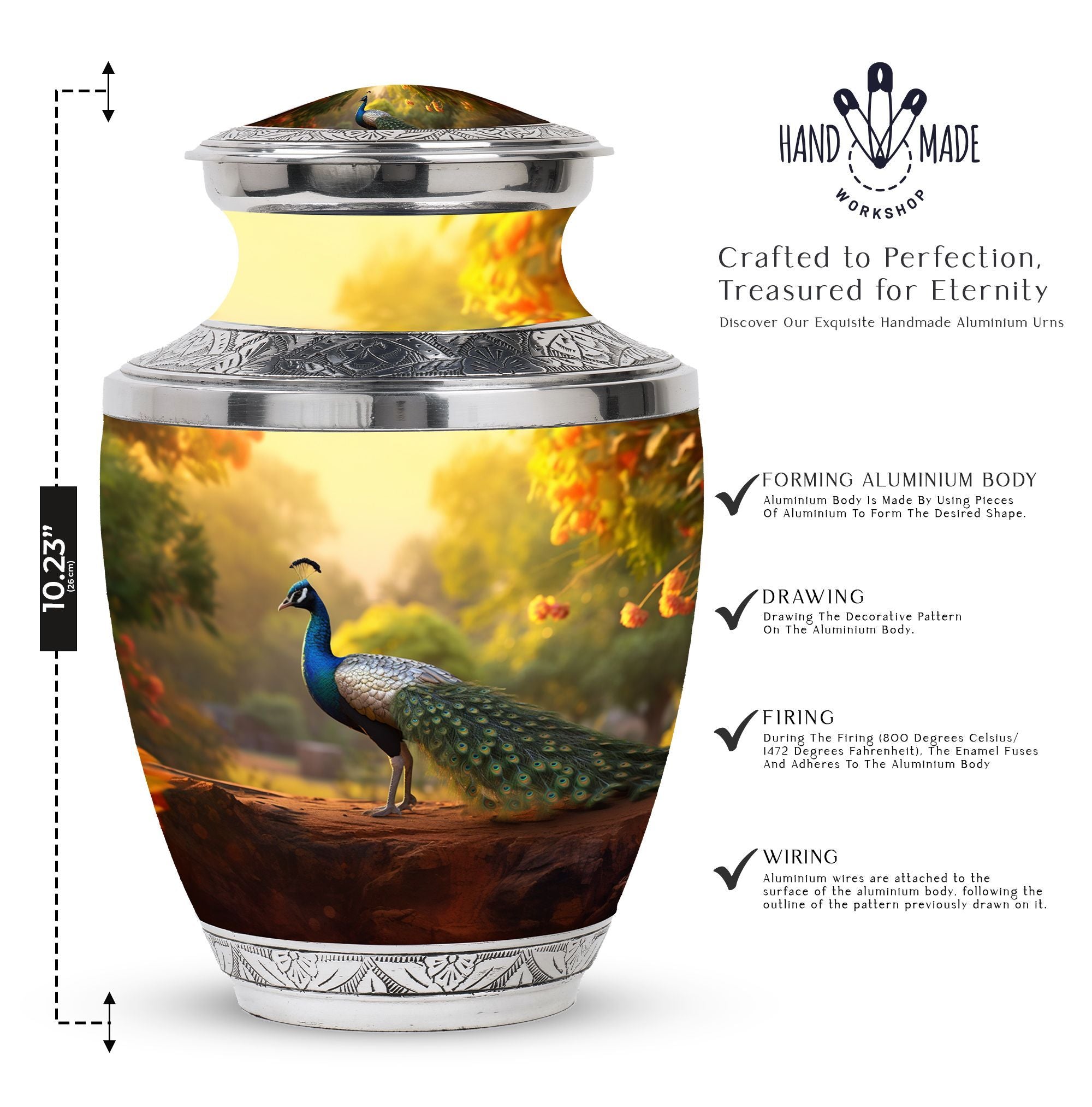 Preserve memories of your loved ones with our Peacock Urn. A cherished piece of memorial gift, this aluminum cremation urn adds a touch of solemnity and peace to the memorial service. This classic urn is 10 inches in height and has a size of 3 inches, with a substantial weight of 3.3 pounds. Its spacious interior can comfortably contain 200 cubic inches of ashes. The urn comes in a protective velvet pouch that provides a dignified containment of ashes. Further, to add a personal touch to this large urn, there is provision to engrave names on it. The Peacock Urn is also an ideal choice for anyone pursuing Human Cremation Urns, Modern Urns for Human Ashes, Ashes Holder, or Burial Urns for Ashes. Remember your loved ones in the most distinctive way with our Peacock Urn.