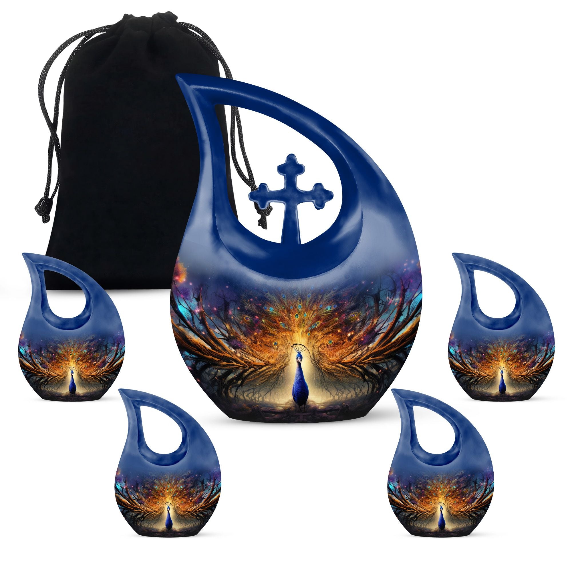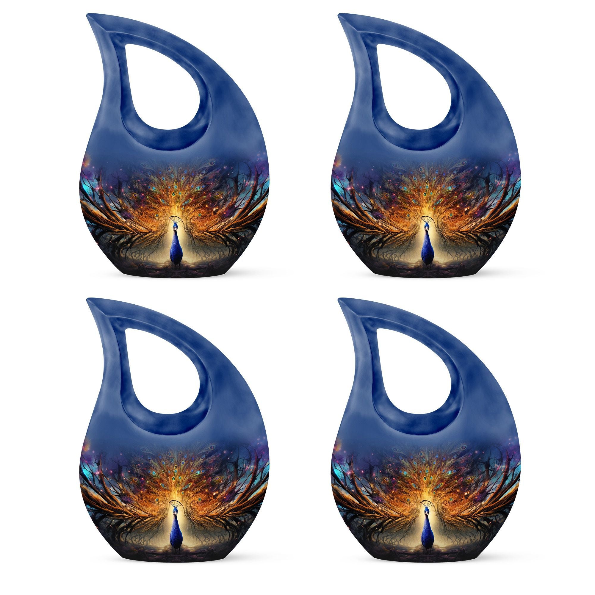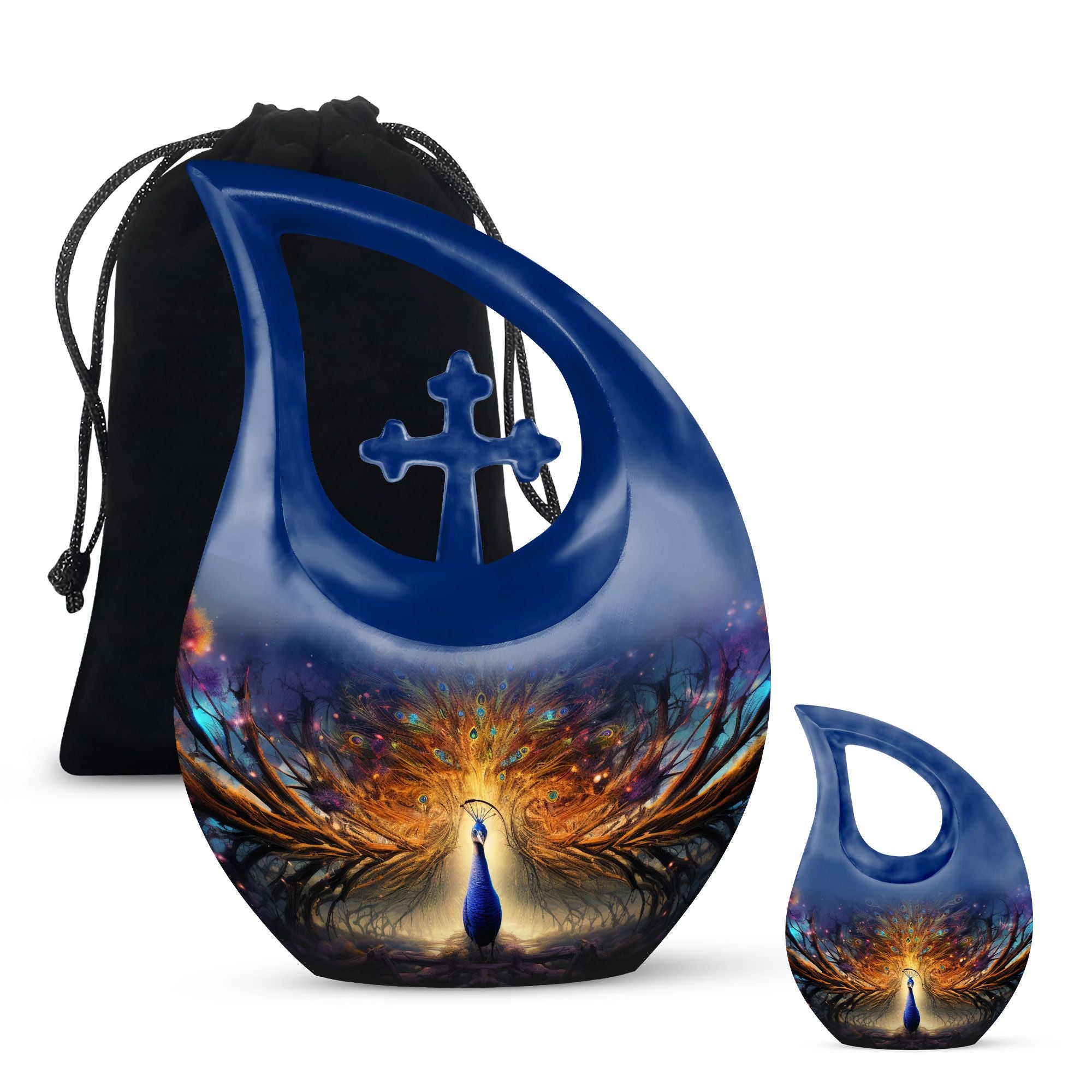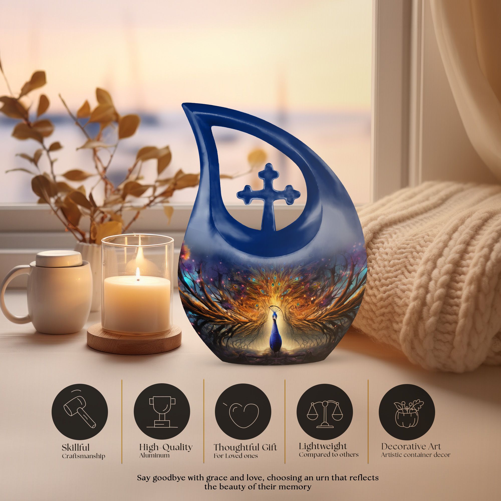 Preserve solemnity and peace with this magnificent 10-inch Peacock Urn - an exquisite find within our collection of memorial urns. This cremation container resonates with serenity, boasting a 'Cross Drop' motif, making it a fitting tribute to a life well-lived. Handcrafted with the utmost care from durable aluminium, it is designed to last, maintaining its dignified appearance over time. This 3.3-pound memento offers a capacity of 200 cubic inches, providing ample space for safely storing ashes. It comes with a complimentary velvet pouch, ensuring the contained ashes stay secure. Also, the feature to personalize it with engraved names adds a touching note of individuality to this large urn. Make this unique Peacock Urn your choice to conscientiously honor your departed loved one. Additional related terms that you can search for include 'Best Urns For Ashes', 'Personalized Urns For Ashes', 'Burial Urns', and 'Cremation Boxes'