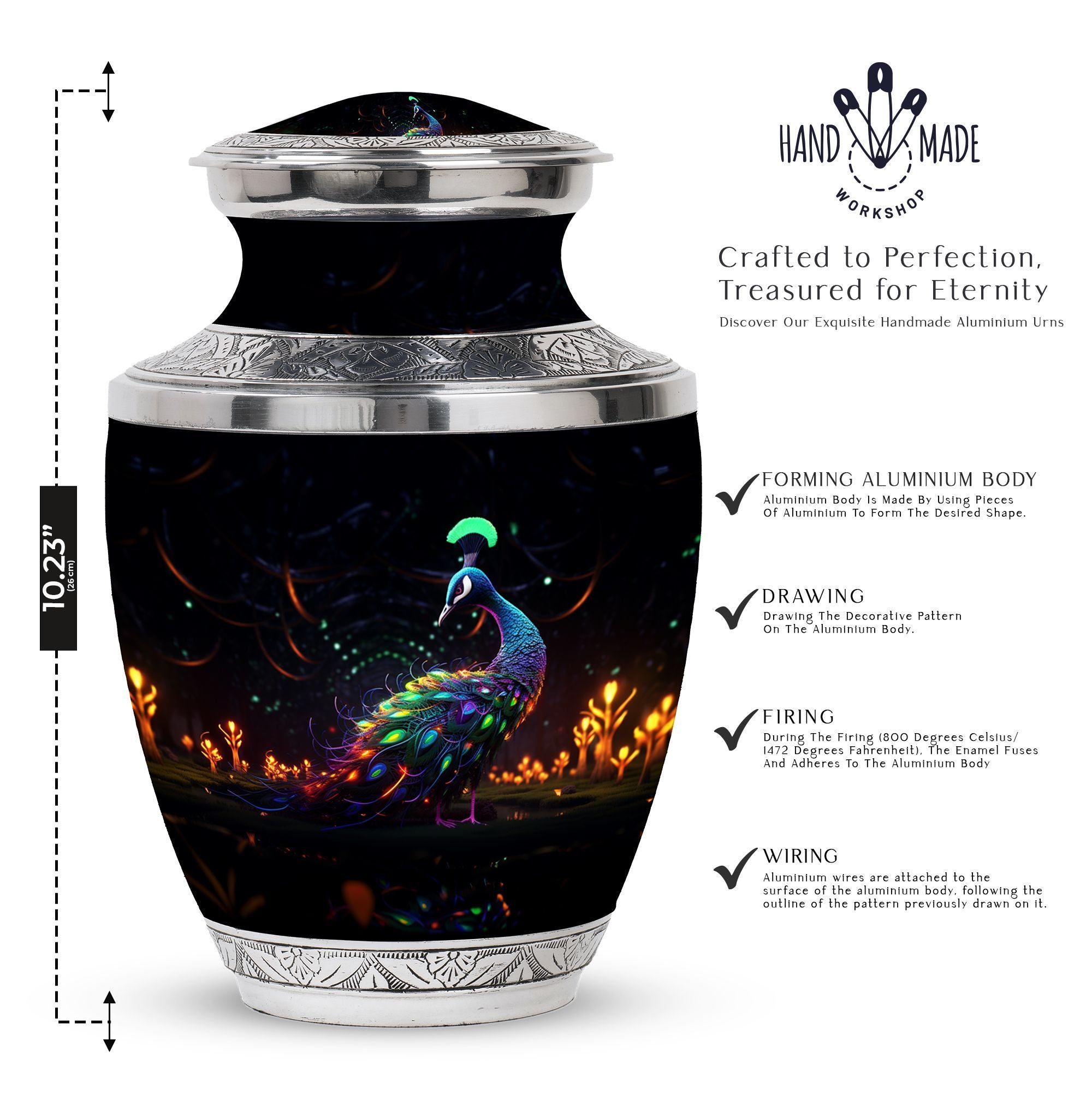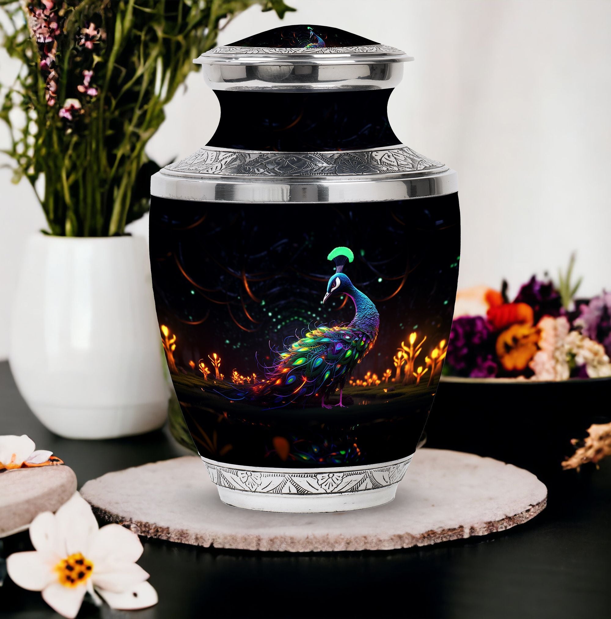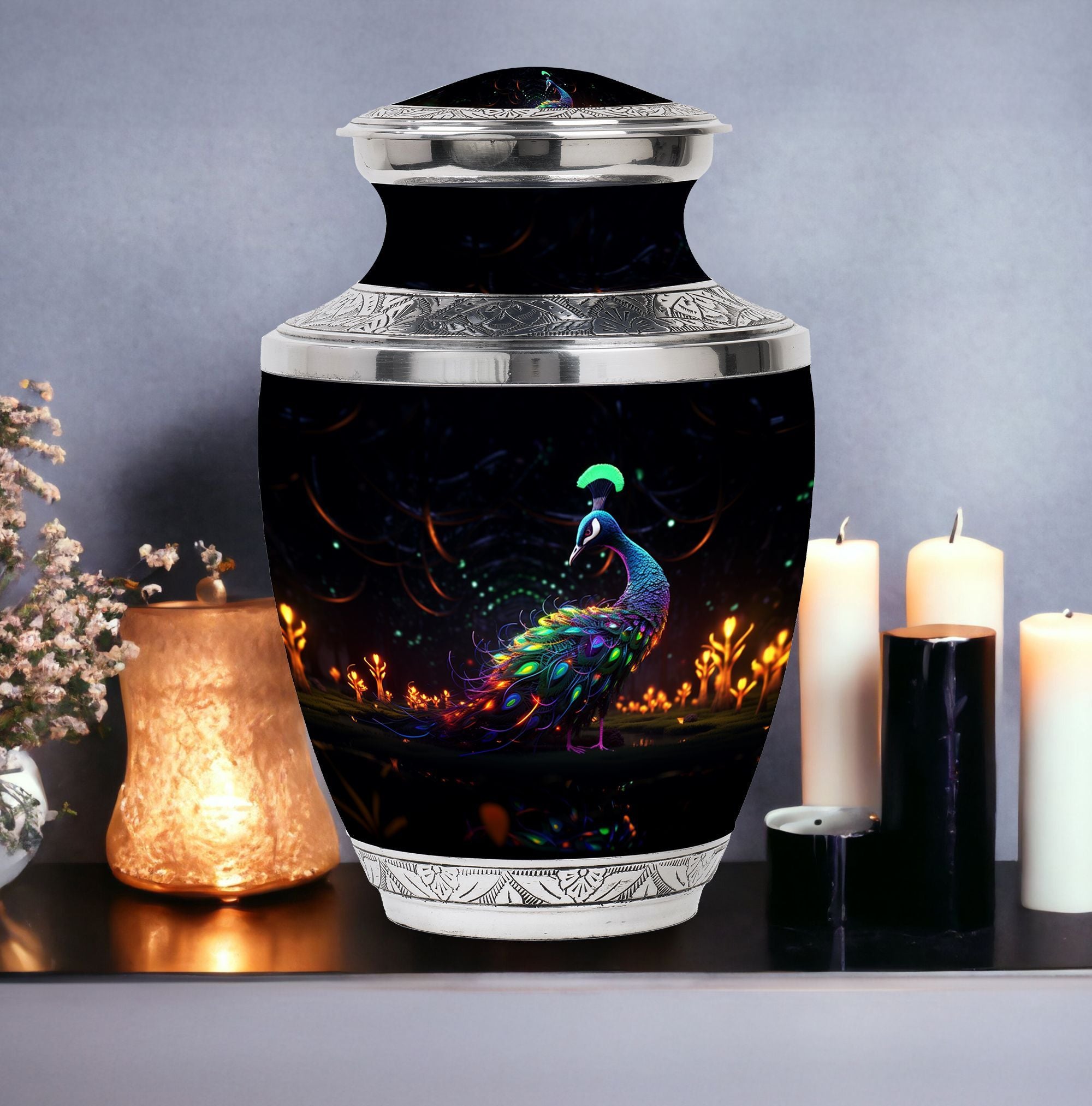 Honor your loved one with our exceptional 'Peacock Urn,' a premium item in our wide array of urns for ashes. Our personalized urn is a large, sturdy container, crafted with attention to detail from high-quality aluminium. With a capacity of 200 cubic inches and dimensions of 10 inches in height, this product provides ample space to hold the ashes of your dear departed. It weighs a substantial 3.3 pounds, ensuring stability and robustness for this memorial icon. The urn's size is conveniently compact with a 3-inch diameter, making it easy to place in your assigned spot. Each urn comes with a velvet pouch for containment of ashes, adding an extra touch of dignity and refinement. You also have the opportunity to customize this urn with engraved names, thus beautifully preserving your memories.