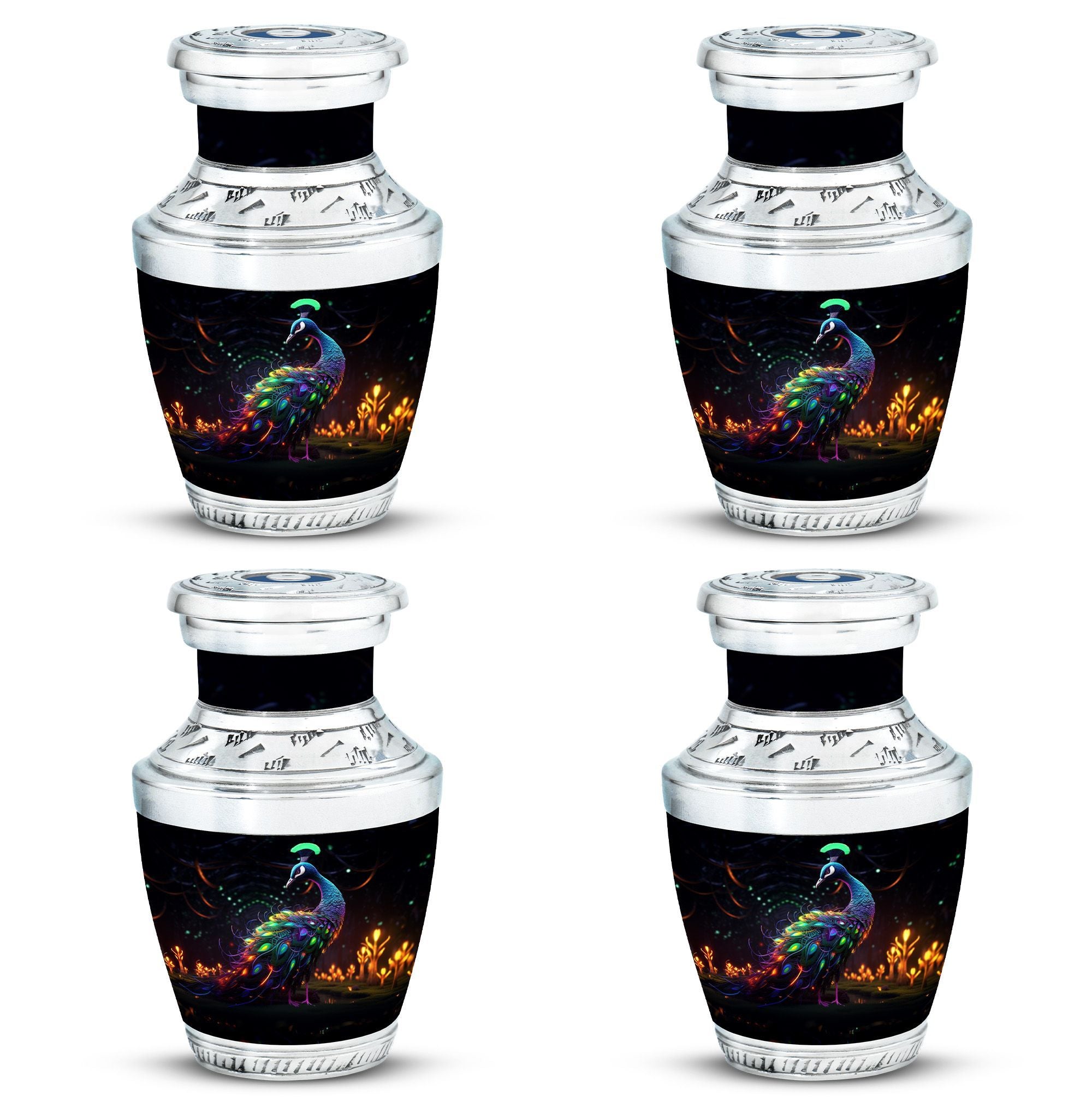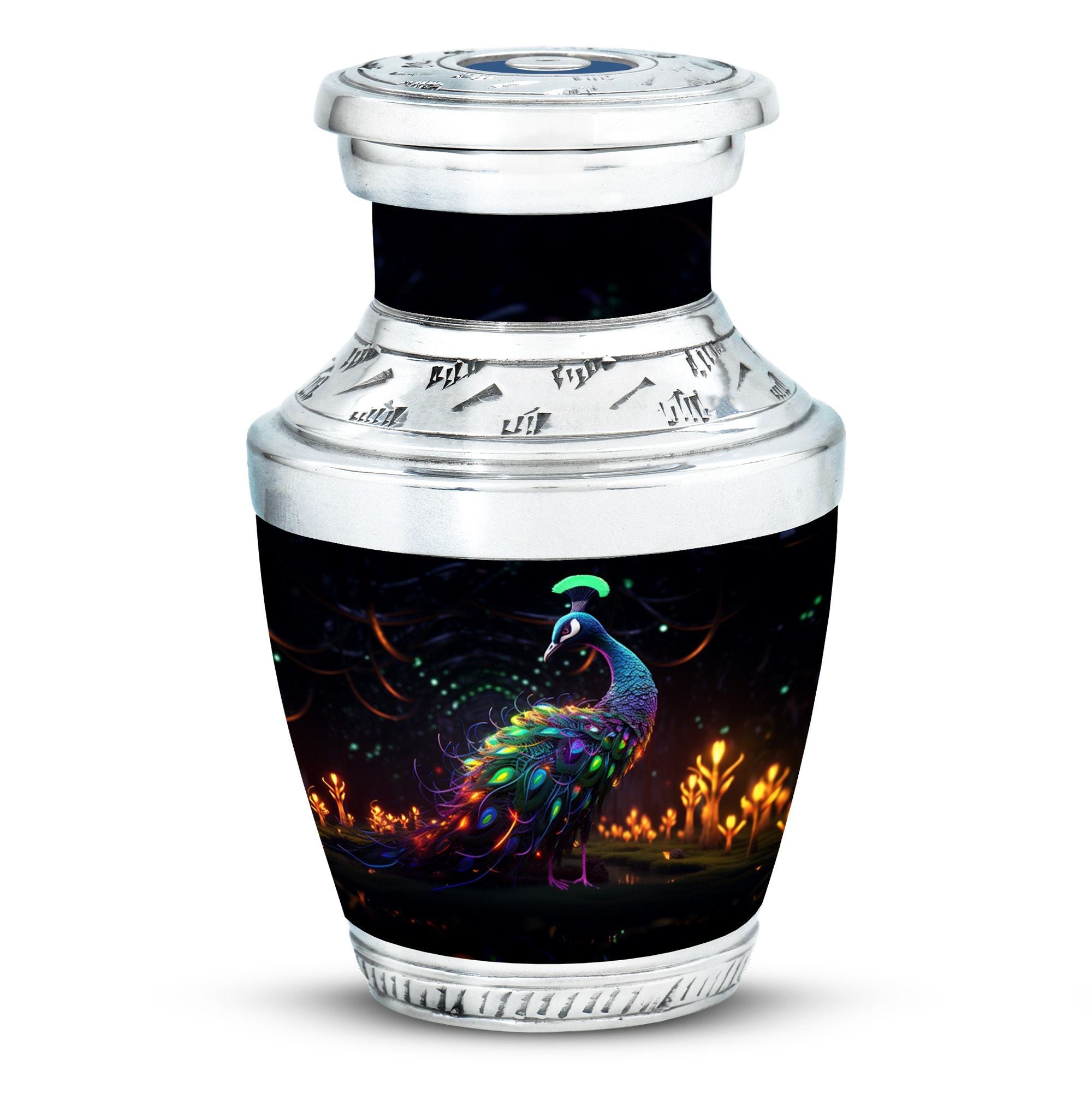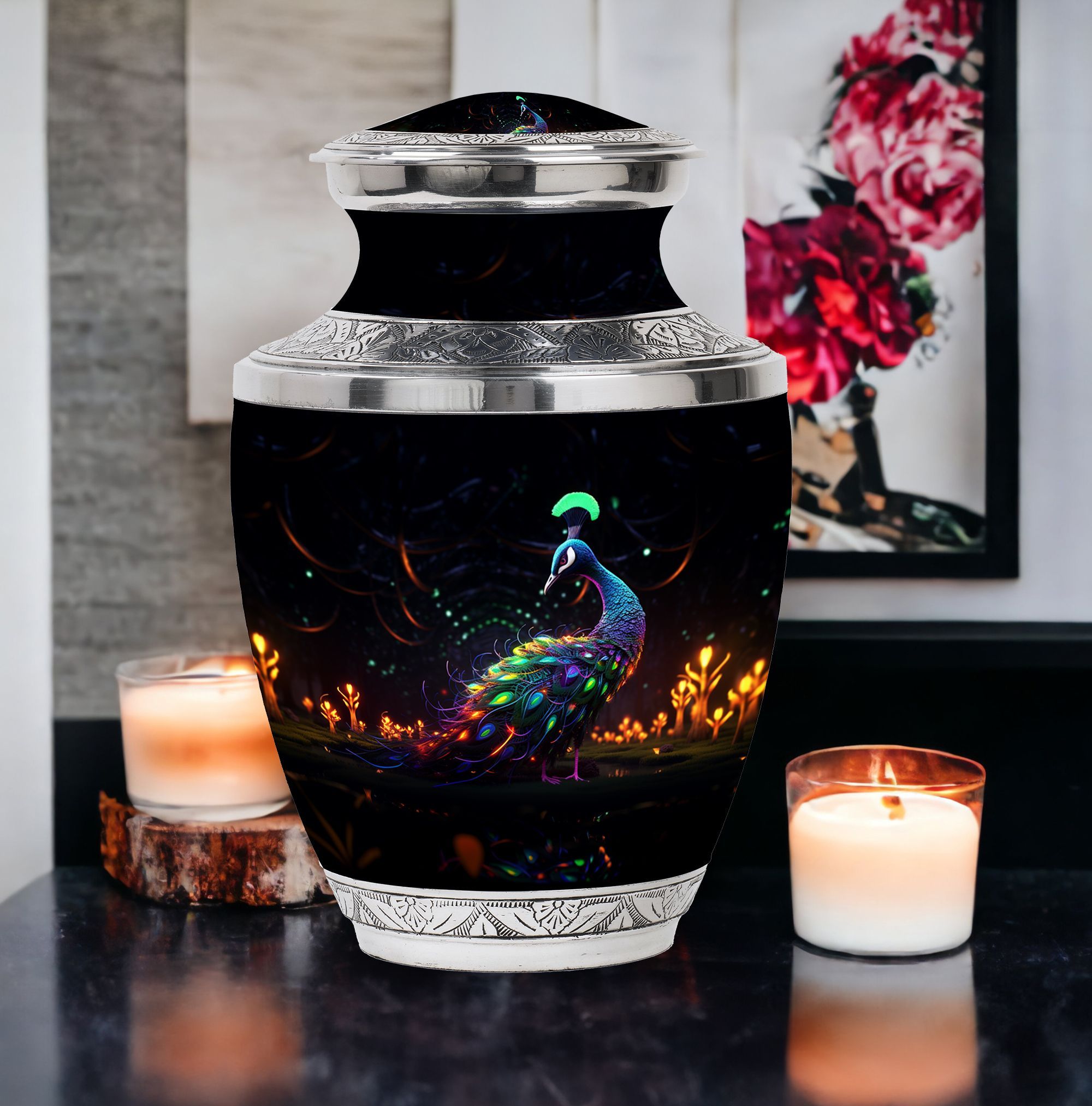 Honor your loved one with our exceptional 'Peacock Urn,' a premium item in our wide array of urns for ashes. Our personalized urn is a large, sturdy container, crafted with attention to detail from high-quality aluminium. With a capacity of 200 cubic inches and dimensions of 10 inches in height, this product provides ample space to hold the ashes of your dear departed. It weighs a substantial 3.3 pounds, ensuring stability and robustness for this memorial icon. The urn's size is conveniently compact with a 3-inch diameter, making it easy to place in your assigned spot. Each urn comes with a velvet pouch for containment of ashes, adding an extra touch of dignity and refinement. You also have the opportunity to customize this urn with engraved names, thus beautifully preserving your memories.