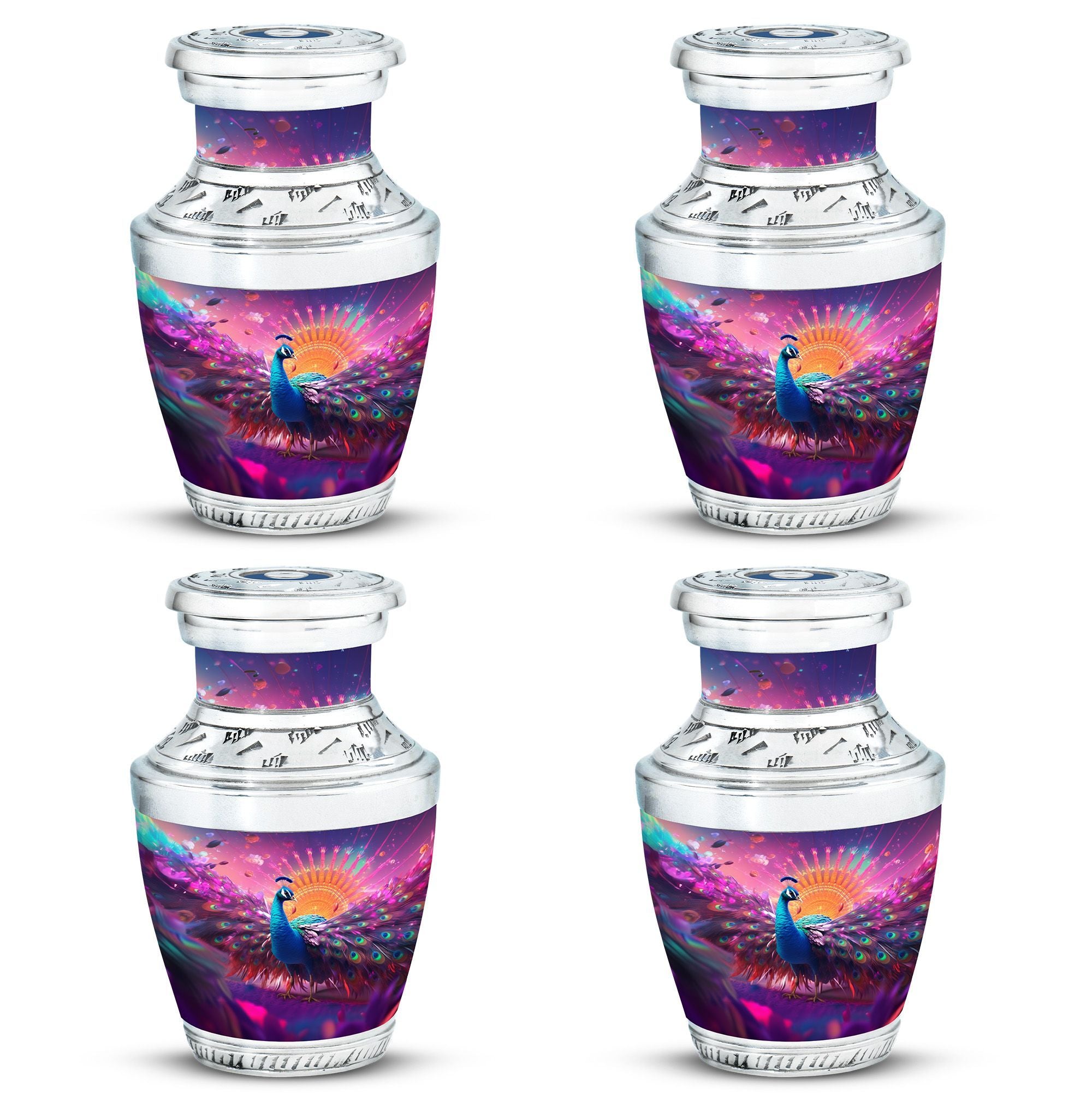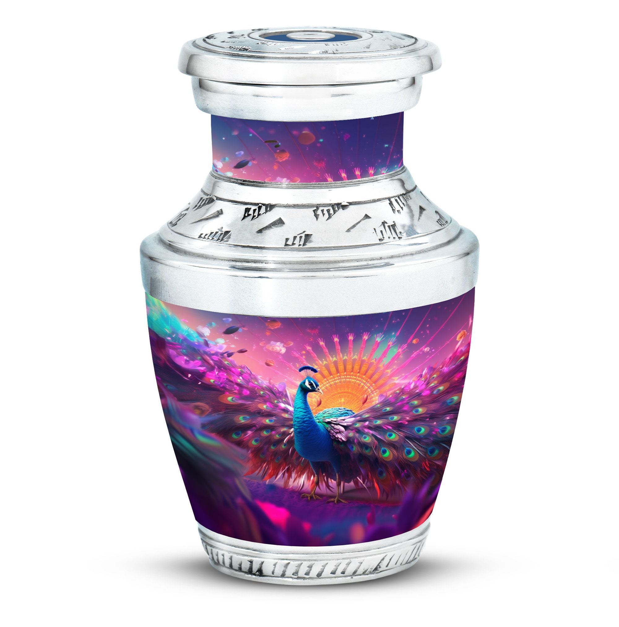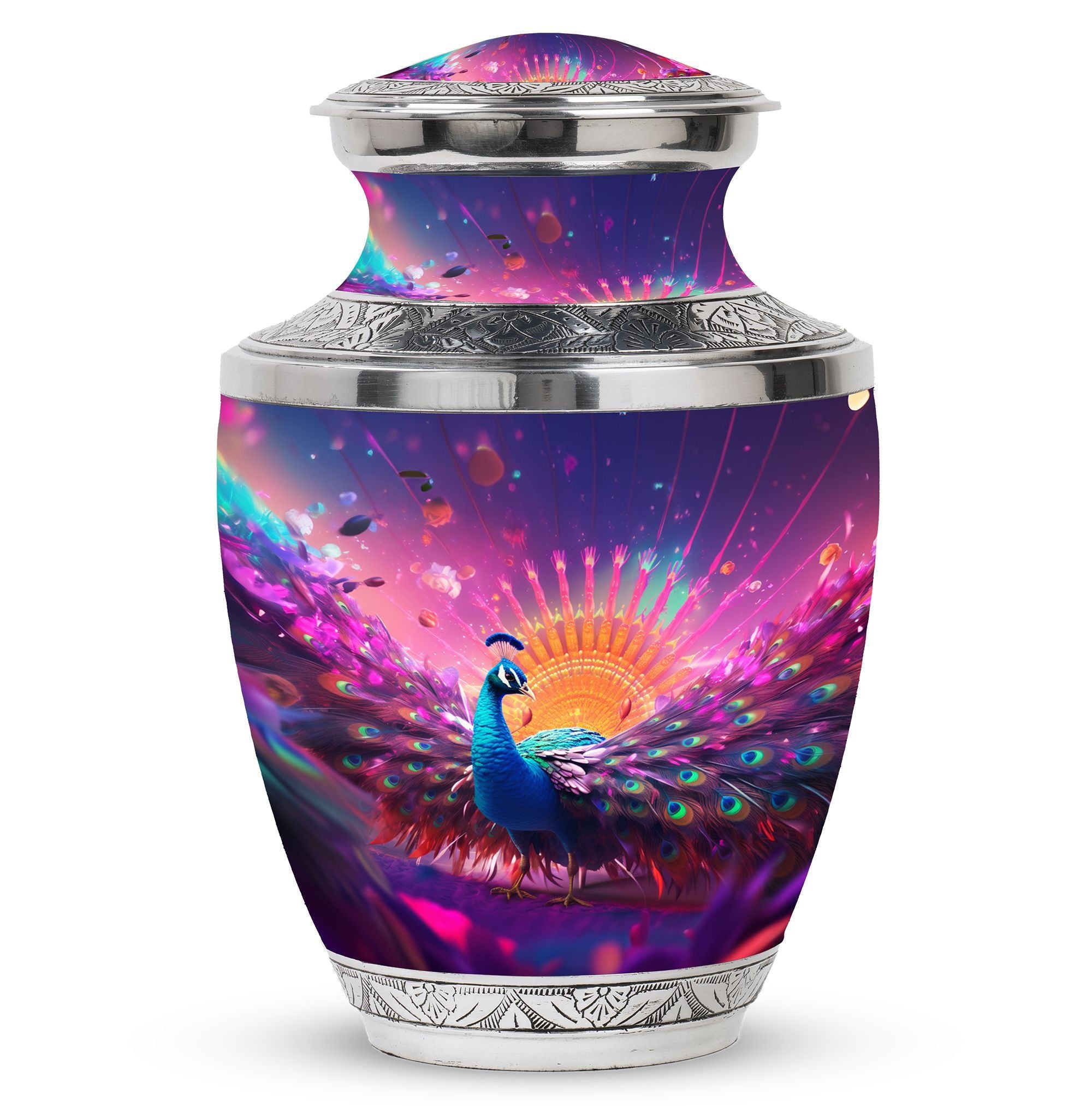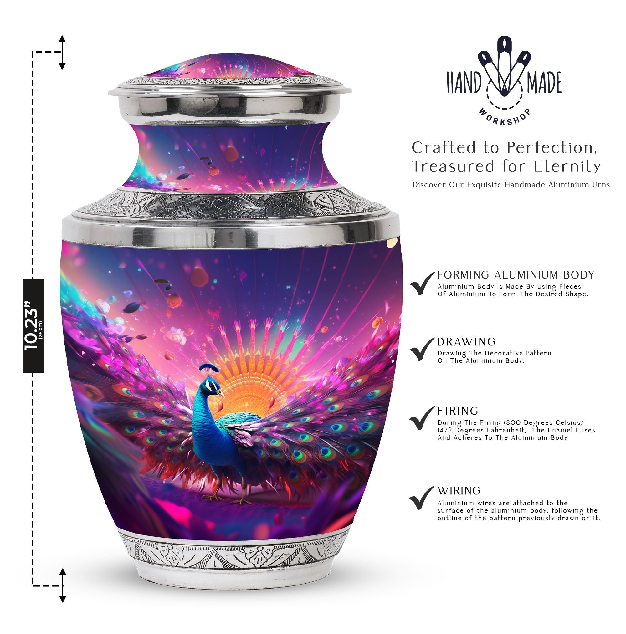 For a timeless and regal manner to pay homage to your loved one, this Peacock Memorial Urn is the ideal choice. Crafted from durable aluminium, it can contain up to 200 cubic inches of ashes, making it a perfect choice for large urns for human ashes. Our urn for ashes weighs a substantial 3.3 pounds and stands 10 inches tall, signifying the dignified presence of your dear departed. Its universal 3-inch size comfortably fits into most niches and offers a serene resting place for the valued remains. Accompanied by a soft velvet pouch for containment of ashes, it ensures a respectful and secure mode of preservation. Elevate the urn for ashes with a personal note by engraving names, thereby adding a touch of intimacy. Although the classic urn design is engaging and noteworthy, it is the emotional significance which makes this memorial urn meaningful. This product, with the versatile keyword phrase 'customized urns for ashes for adults', radiates solemnity aptly. It's an elegant tribute, encapsulating your heartfelt dedication and marking a unique testament of love.
