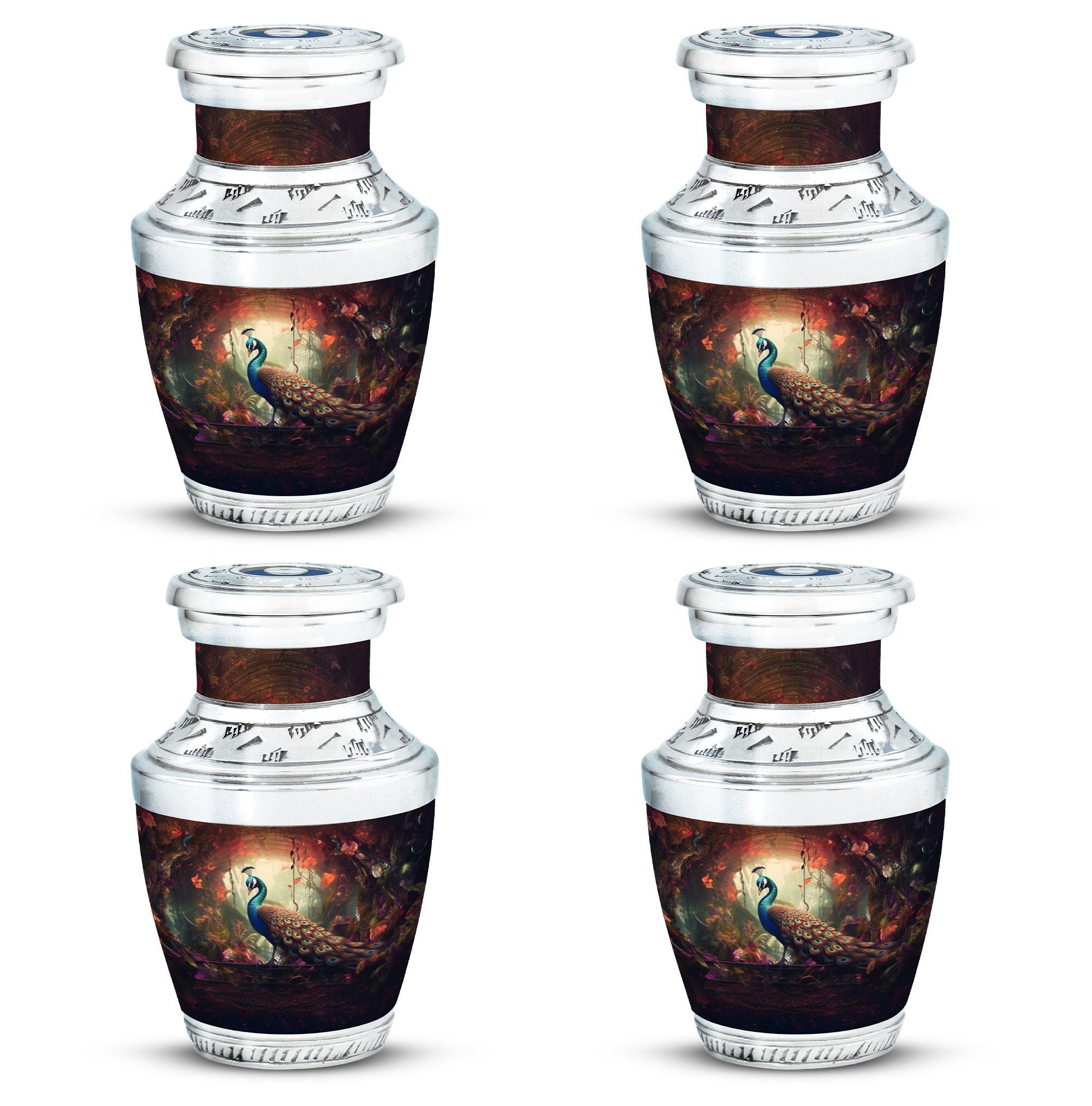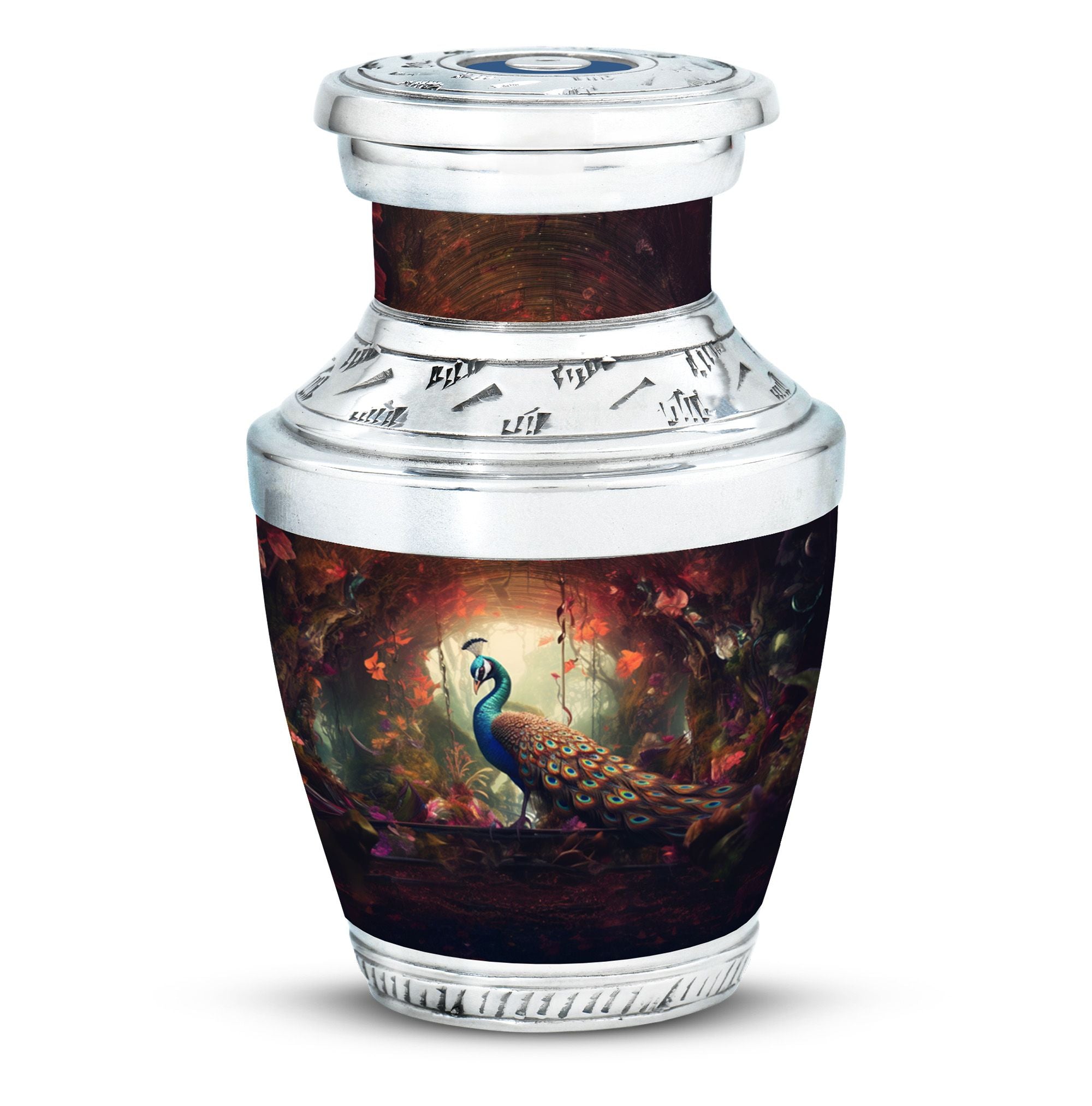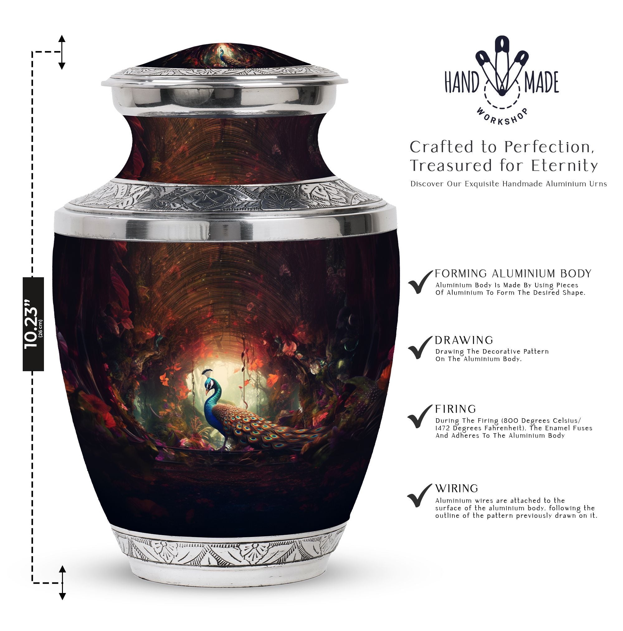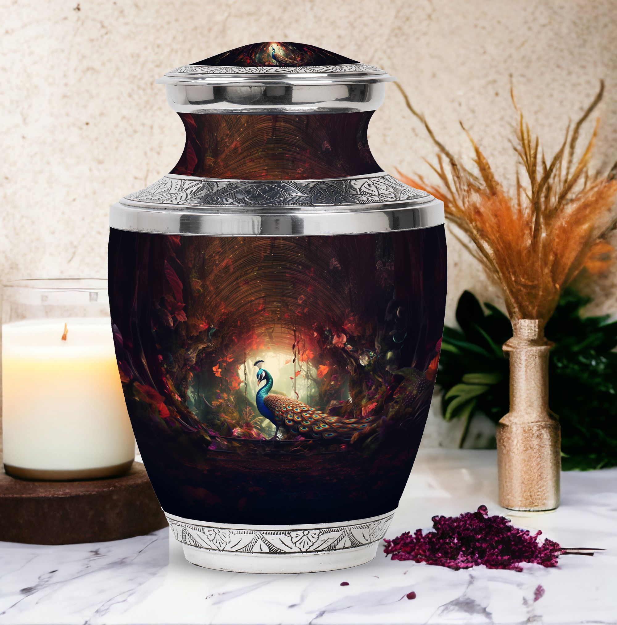 Our large-sized Peacock Memorial Urn offers a distinctive and lasting tribute to a cherished loved one. With its handsome, classic urn design, this high-quality aluminium cremation urn is meticulously crafted to hold as much as 200 cubic inches of ashes. Measuring 10 inches in height and weighing just 3.3 pounds, the urn will seamlessly blend into any decor where it is kept - evoking fond memories while exuding tranquility. A discreet velvet pouch is included in the package for containment of ashes, making it a one-stop solution for memorial urns. Although sizeable at 3 inches in dimension, the urn is handy enough to be transported if required. For a more personal tribute, the urn allows for customizable engravings, making it uniquely yours. This modern cremation urn resonates with personalised urns, setting it apart in its category. Turn your dear one's memory into an enduring legacy with our veteran-approved, reliable memorial urns.