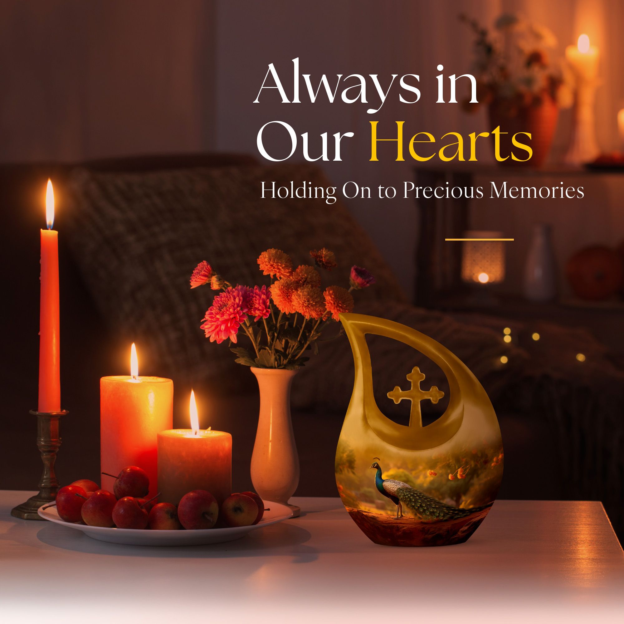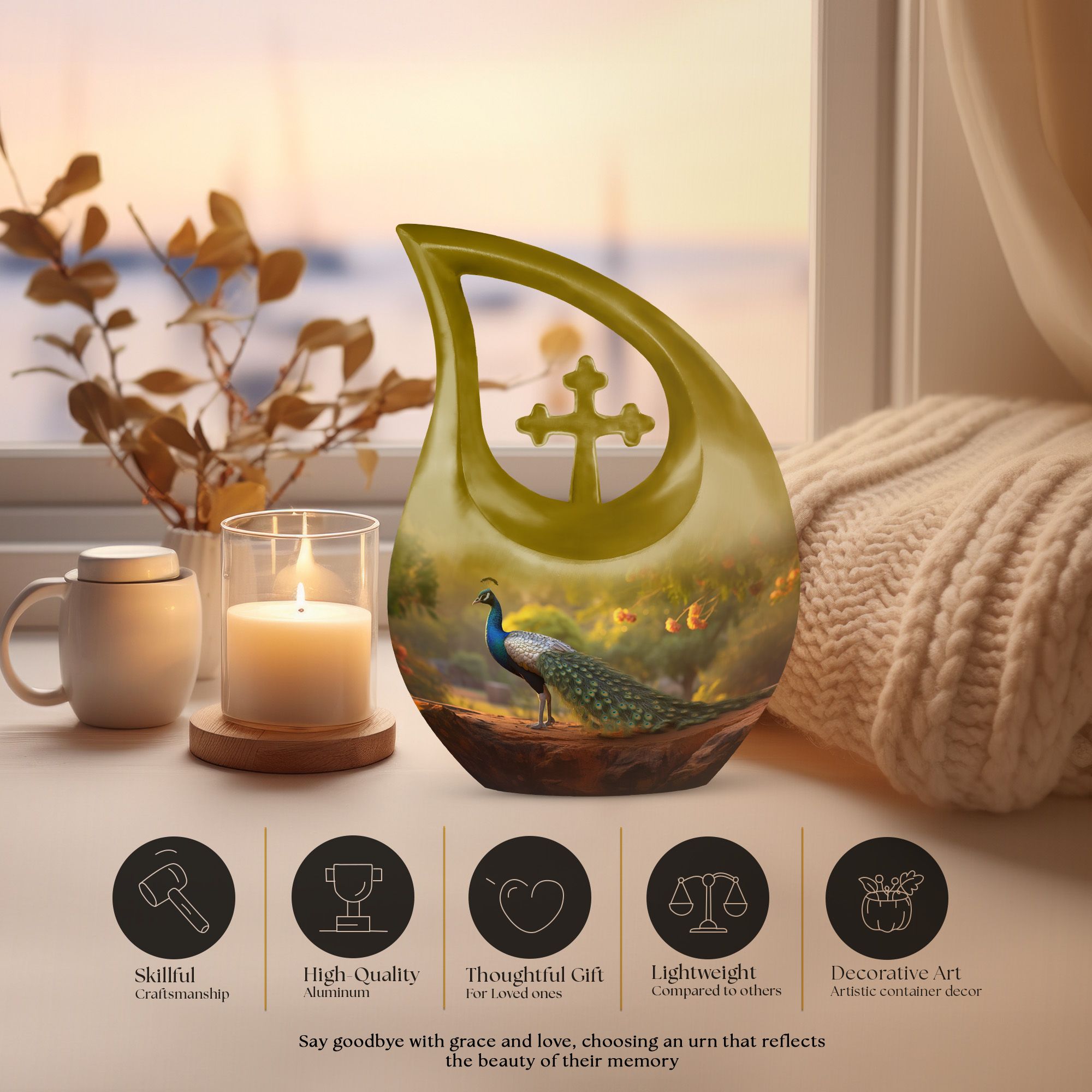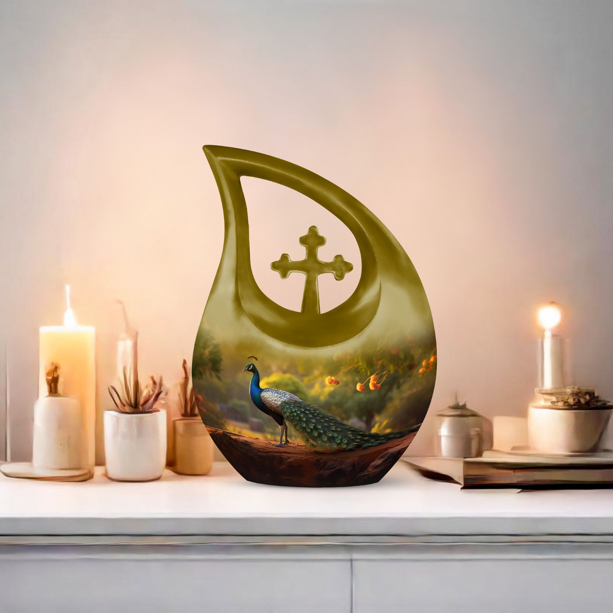 The Golden Peacock Cremation Urn captures the brilliance of a life well lived — a lasting urn for cremation ashes that reflects honor, hope, and the eternal bond shared with your loved one.