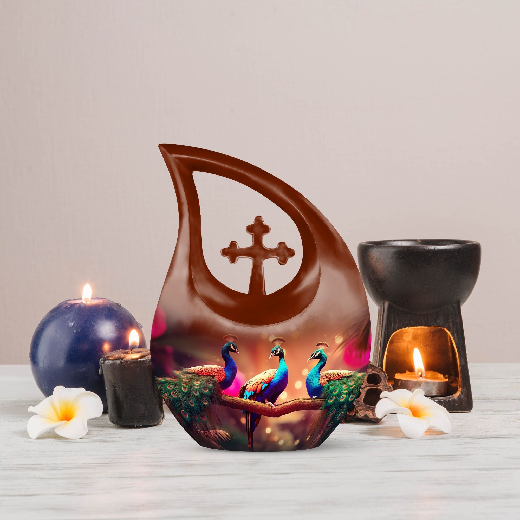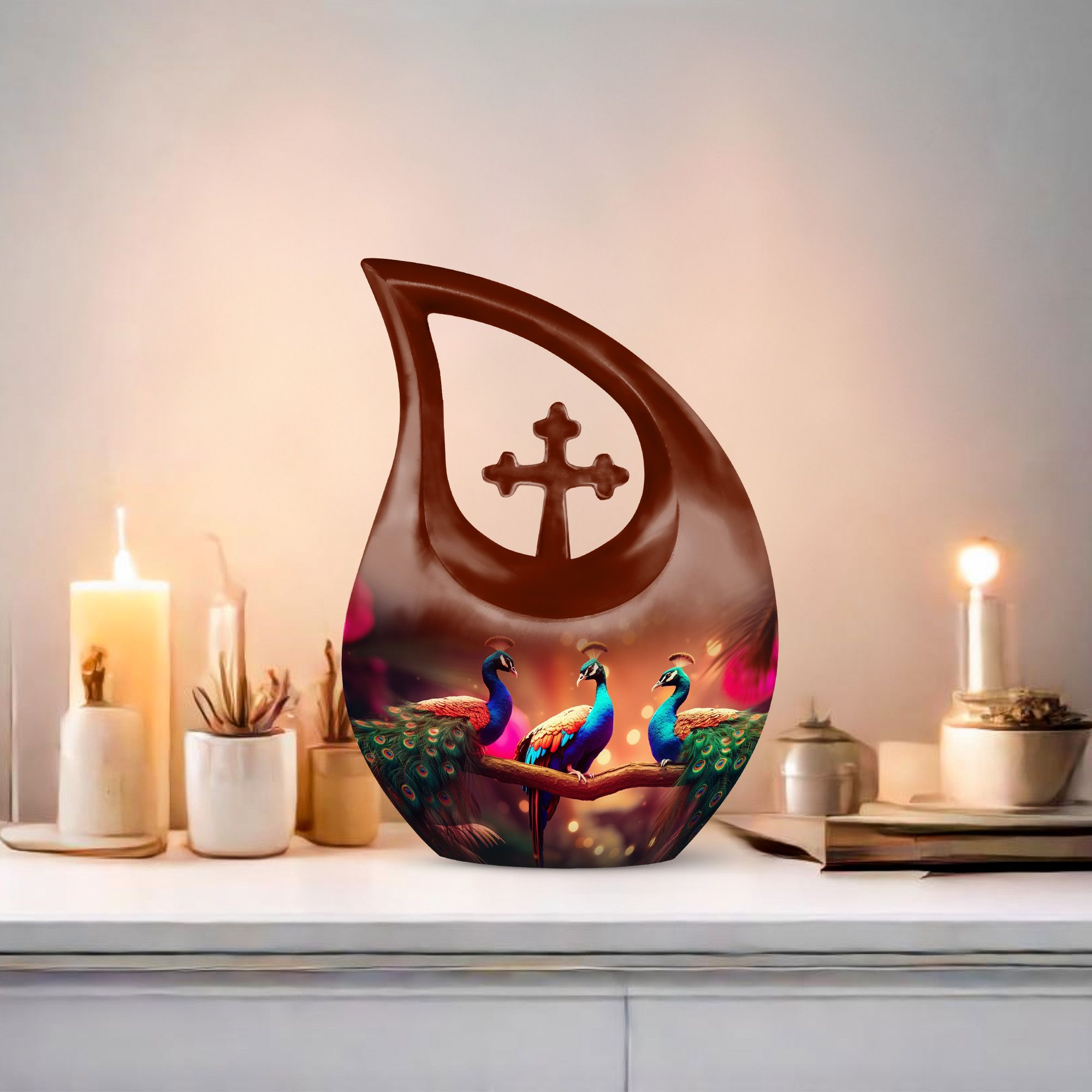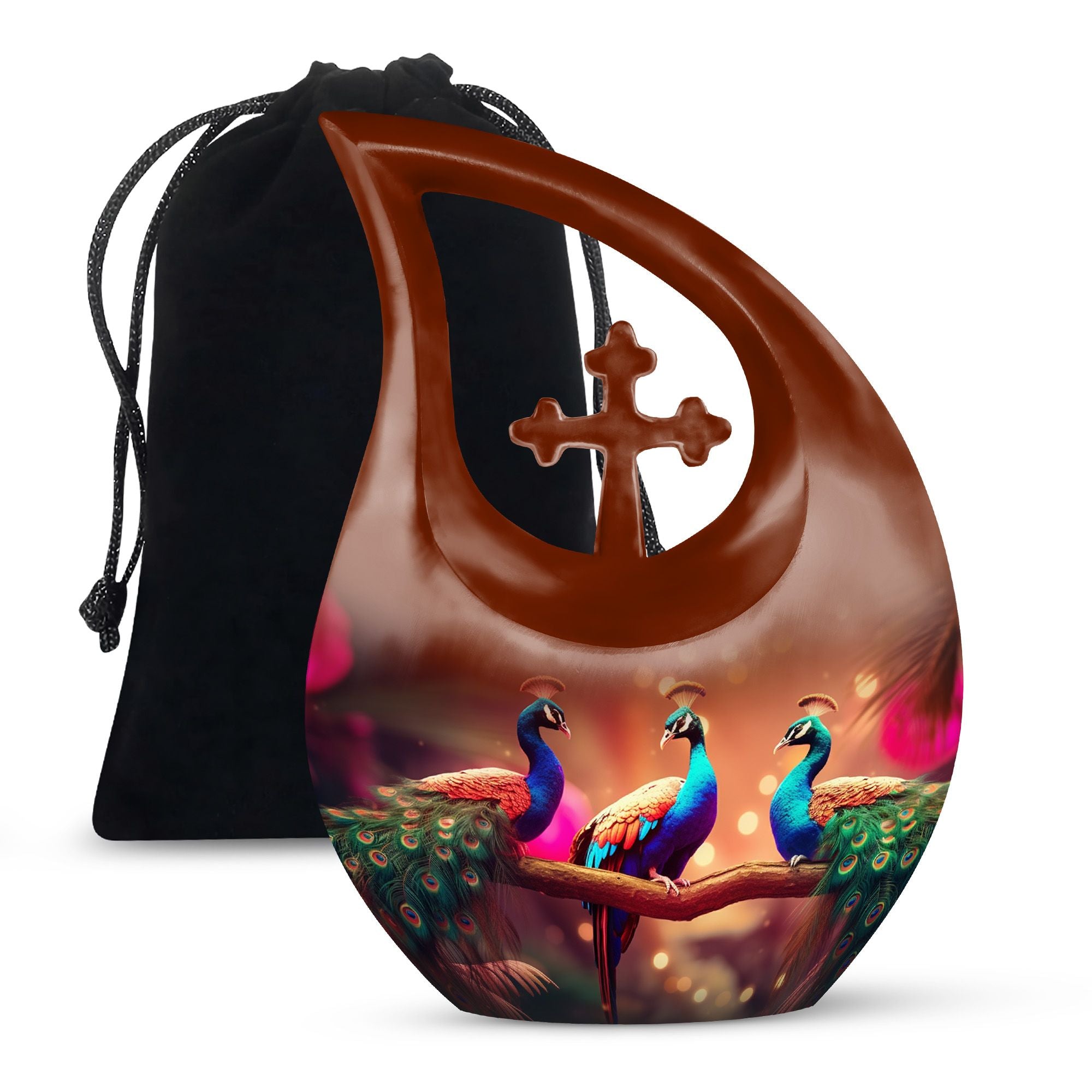 Cherish everlasting memories with the Three Peacocks Cremation Urn for Human Ashes, a breathtaking symbol of love, unity, and remembrance. The elegant brown teardrop design, adorned with three radiant peacocks, represents strength, renewal, and everlasting connection. This urn offers a meaningful way to celebrate your loved one’s life, ideal for those seeking adult cremation urns or cremation urns for ashes for men that blend grace and symbolism.