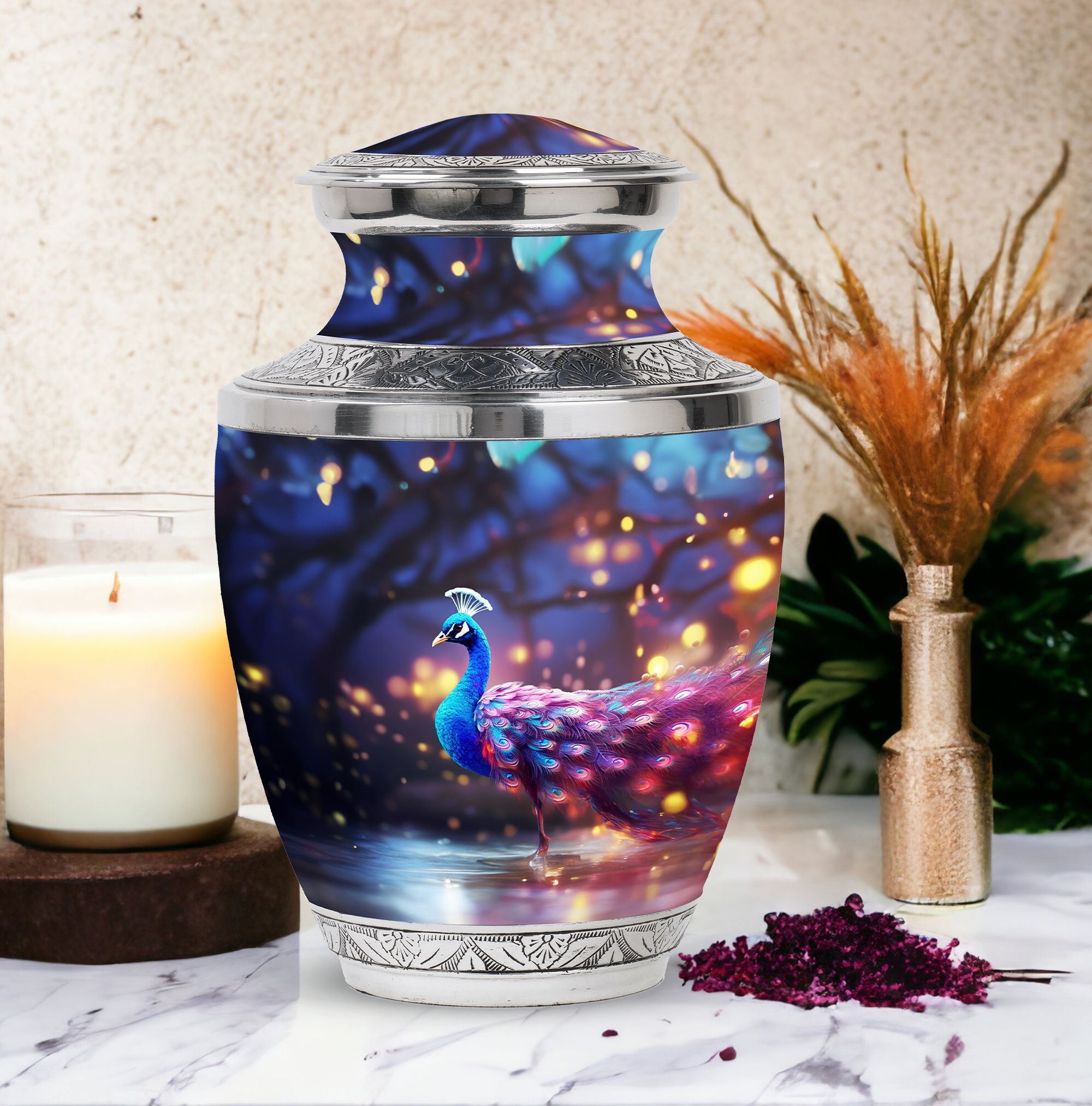 Introducing our exquisite Peacock Urns for Human Ashes, a poignant and dignified option in our collection of Large Urns. These Memorial Urns have a classic design and are carefully crafted from premium quality Aluminum imparting them an elegant and serene look. With a size of just 3 inch, they are purposefully designed to be compact yet have a sizeable capacity of 200 cubic inches. These human cremation urns weigh a modest 3.3 pounds for easy handling and are designed at 10 inches in height offering a substantial presence. The urns come with a velvet pouch for containment of ashes, ensuring a respectful and dignified home for your loved one's remains. An added feature is the customization option that allows you to personalize these decorative urns with engraved names. Poignant and beautifully crafted, these urns are an elegant tribute to your loved one's memories.
