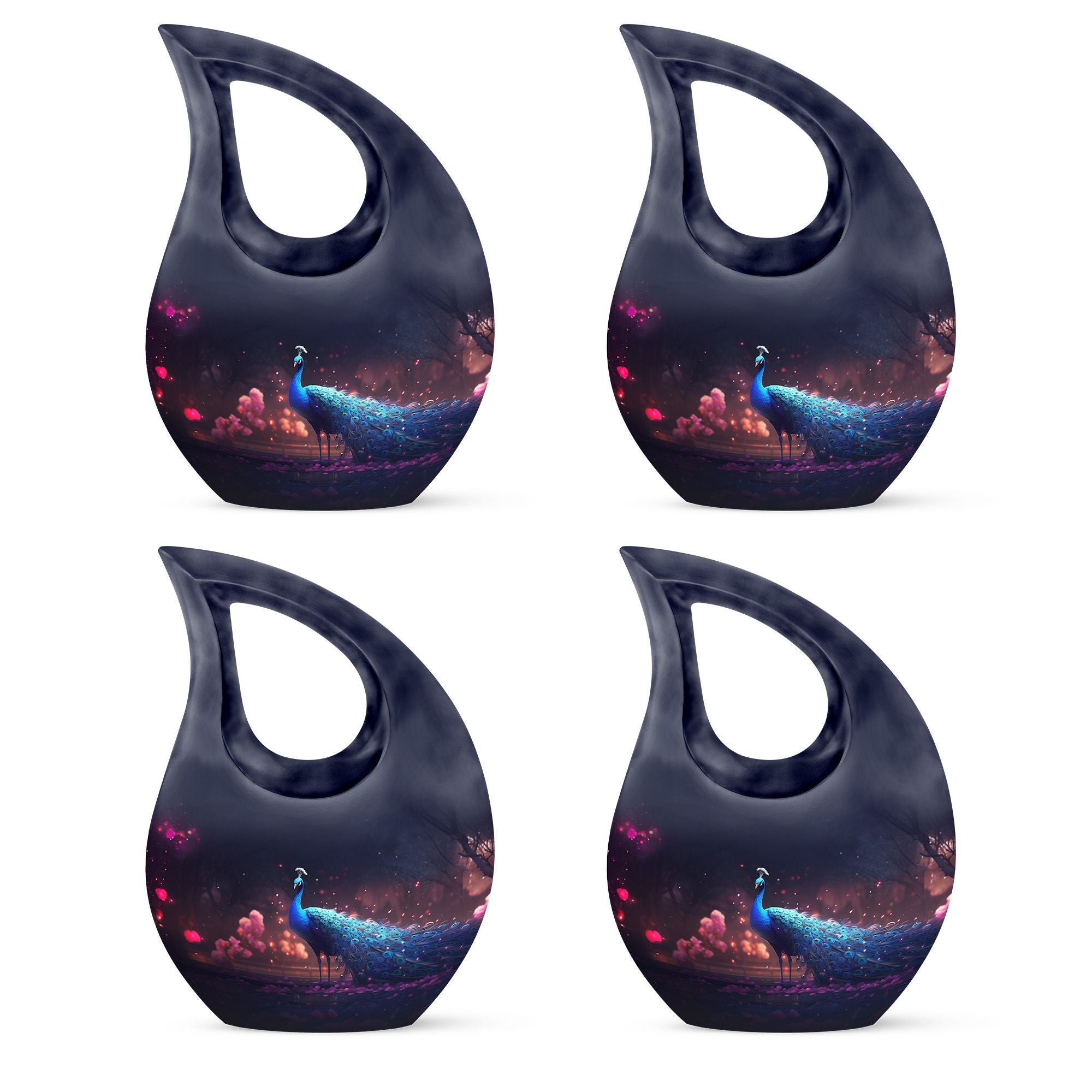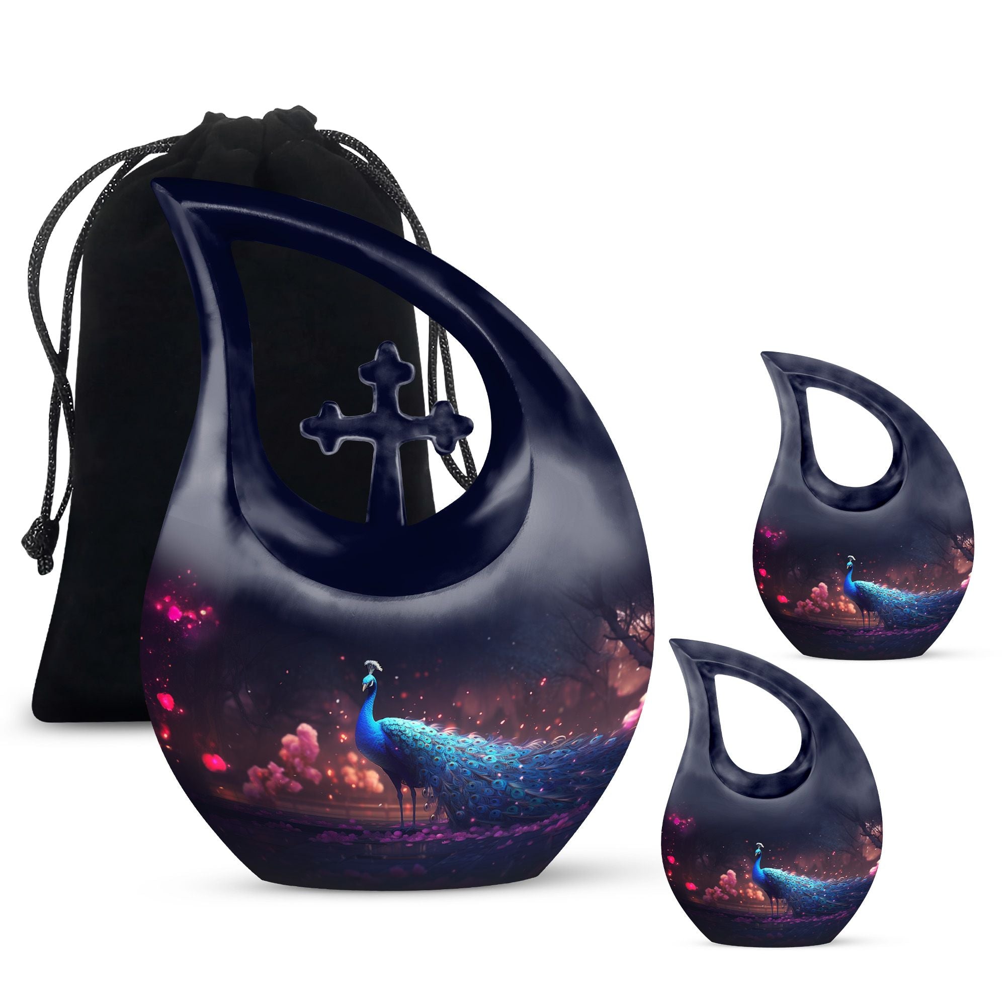 Honor your loved one with our exquisite Peacock Urn, thoughtfully conceived to serve as a dignified resting place for remains, befitting the individuals we treasure. Crafted alluringly from sturdy aluminium, this large urn boasts a striking 'Cross Drop' theme featuring an enchanting Peacock, symbolizing immortality, renewal and beauty everlasting. Measuring a substantial 10 inches in height, the urn accommodates 200 cubic inches of ashes with ease. Weighing a solid 3.3 pounds, its substantial feel mirrors the weight of the love shared and memories created. Our urns can be intimately personalized with engraved names, offering a bespoke tribute to your beloved. Each urn comes with a plush velvet pouch, ensuring well-kept containment of ashes. Perfect as Personalized Urns For Ashes, they also serves as unique garden urns or aesthetics enhancing cremation boxes. Indulge in our affordable urns, immaculately combining reverence with sophistication.