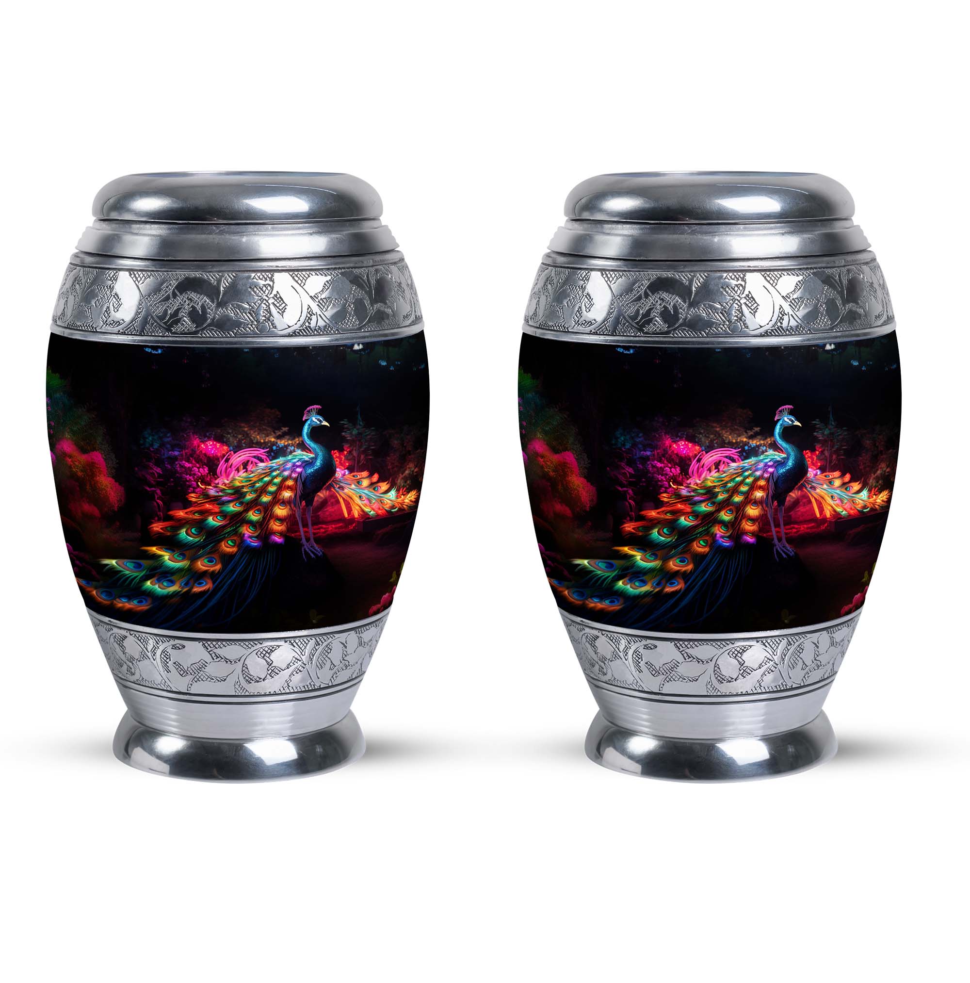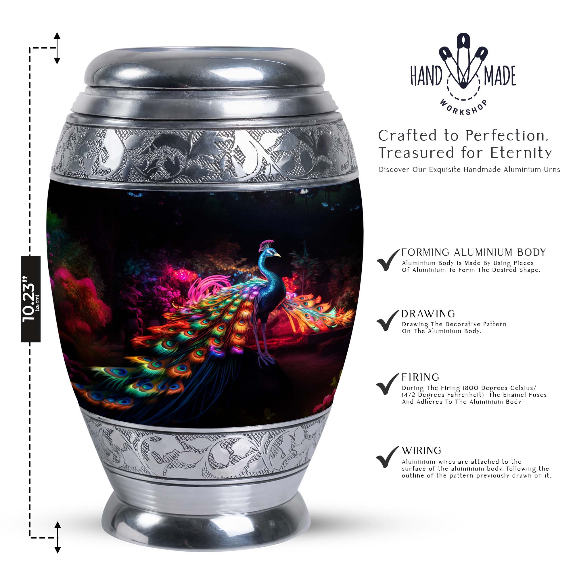 Engage with the traditional elegance and sophistication embodied in the Peacock Cremation Urn, a symbolic resting place for your loved ones. A masterpiece carefully crafted from robust Aluminium, it stands tall at 10 inches with a dignified weight of 3.3 pounds. This piece captures the essence of memorial ceremony supplies, devotedly housing a substantial capacity of 200 cubic inches – fitting for urns for ashes for adults or burial urns for adults. Each Large Urn provides a tangible remembrance, supported by a feature to personalize with engraved names, making it a heartfelt tribute to your departed. The urn offers a secure seal, further complemented by a velvet pouch for dignified containment of ashes. If you're looking for an urn container or urns specifically for dad, this classic urn embraces enduring serenity.