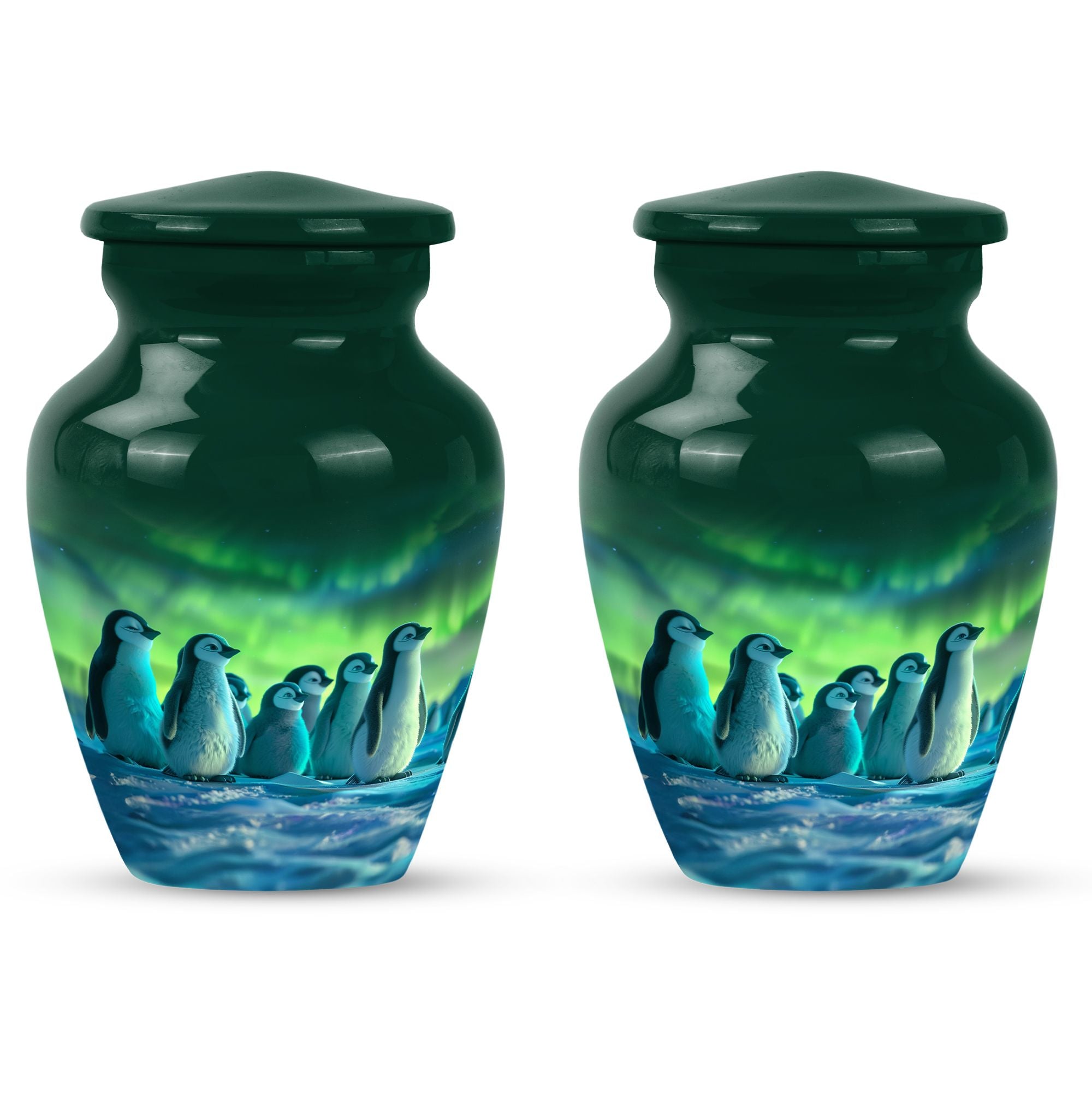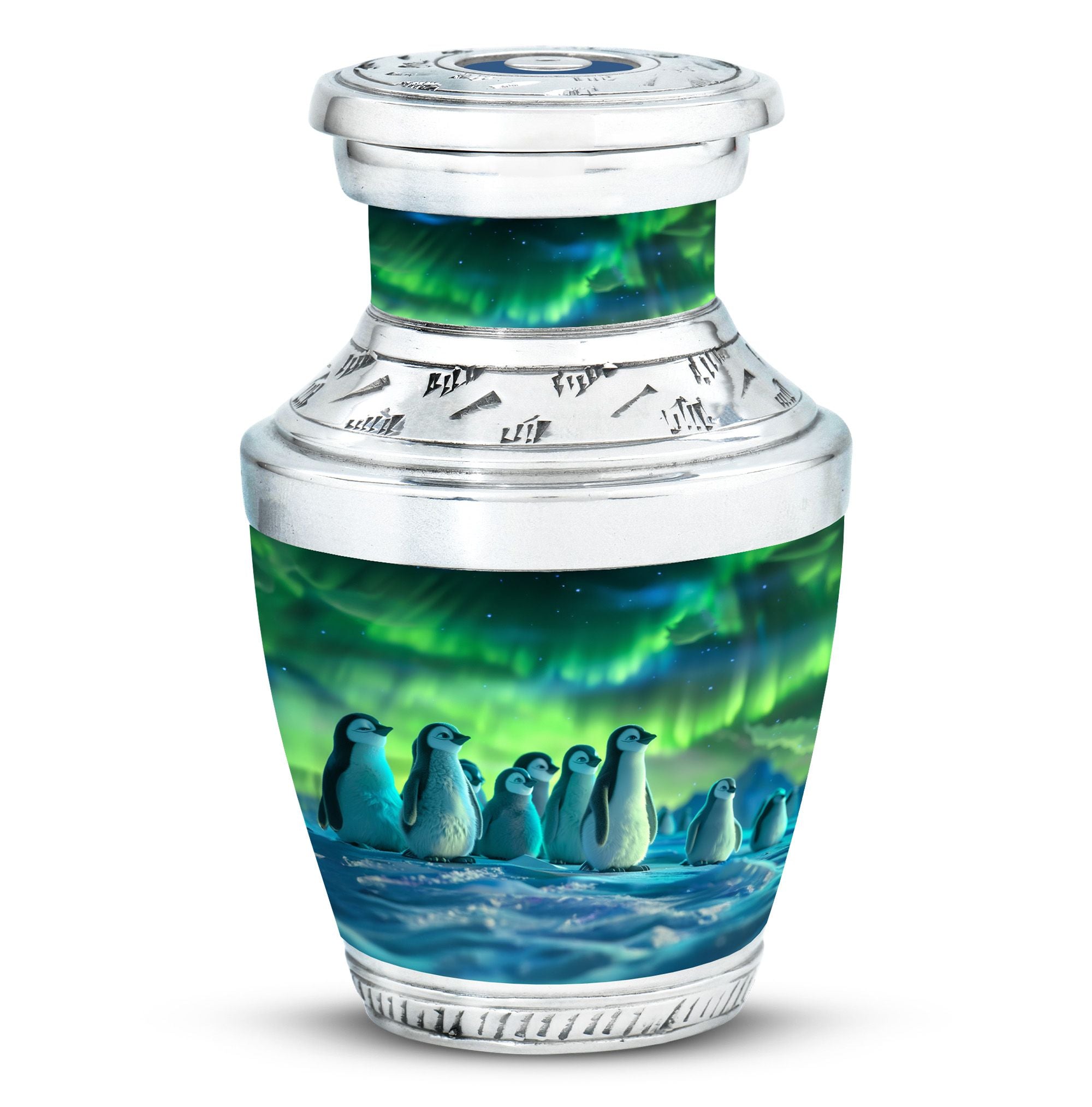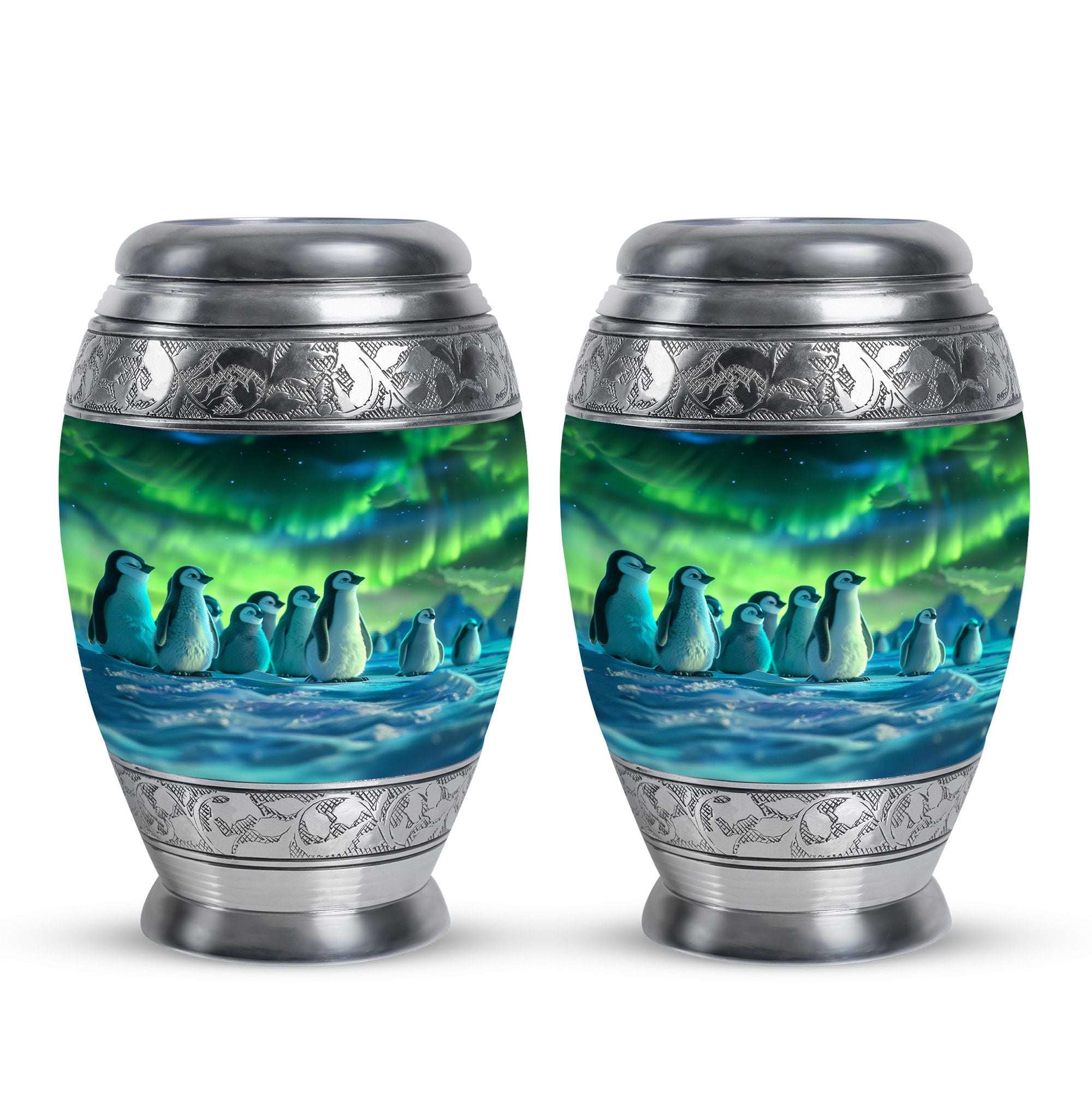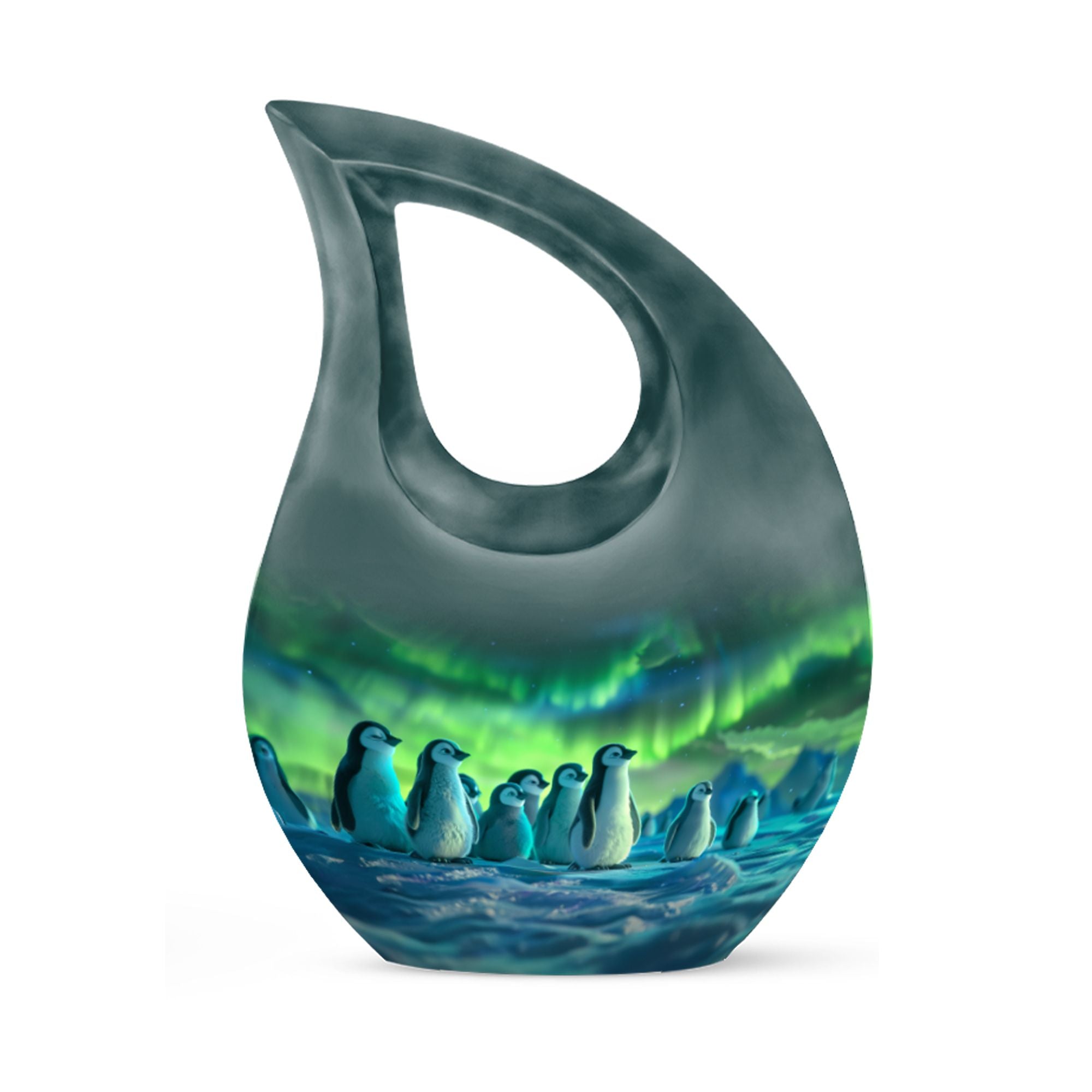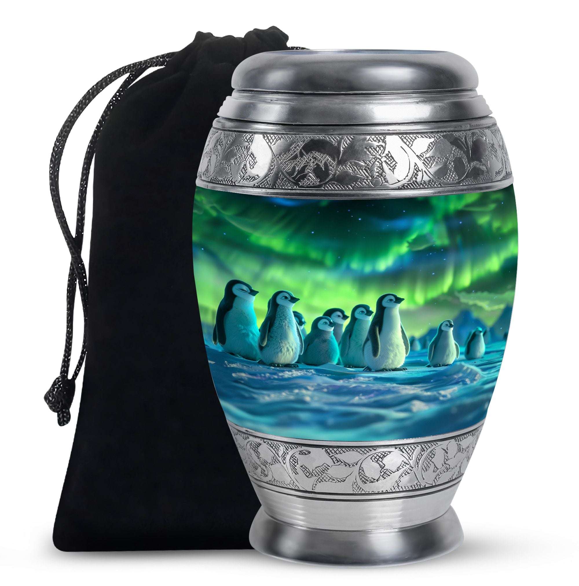Crafted from durable aluminum, this large urn combines strength with artistry. Its penguin motif adds symbolism and beauty, making it one of the most unique urns for ashes available. The secure screw-top lid ensures ashes remain safe, while its 200-cubic-inch capacity makes it an ideal choice among adult funeral urns. Families seeking burial urns for ground or an urn for burial in ground will find this piece both functional and symbolic. For those wishing to share ashes, matching mini keepsake funeral urn or funeral keepsake urns can complement this large memorial urn.