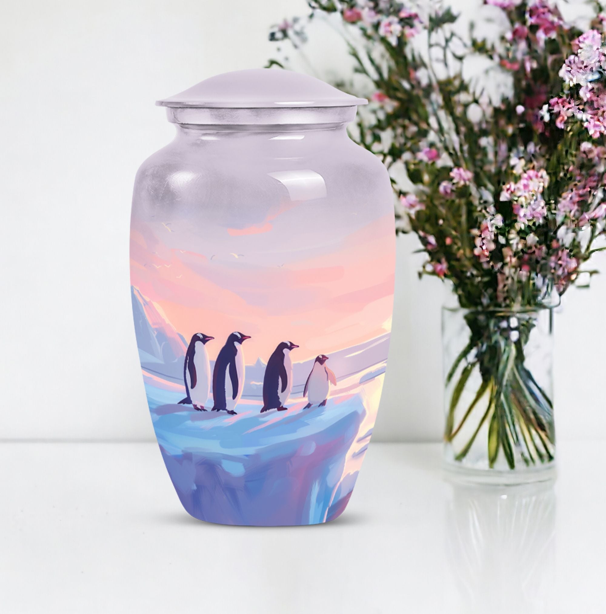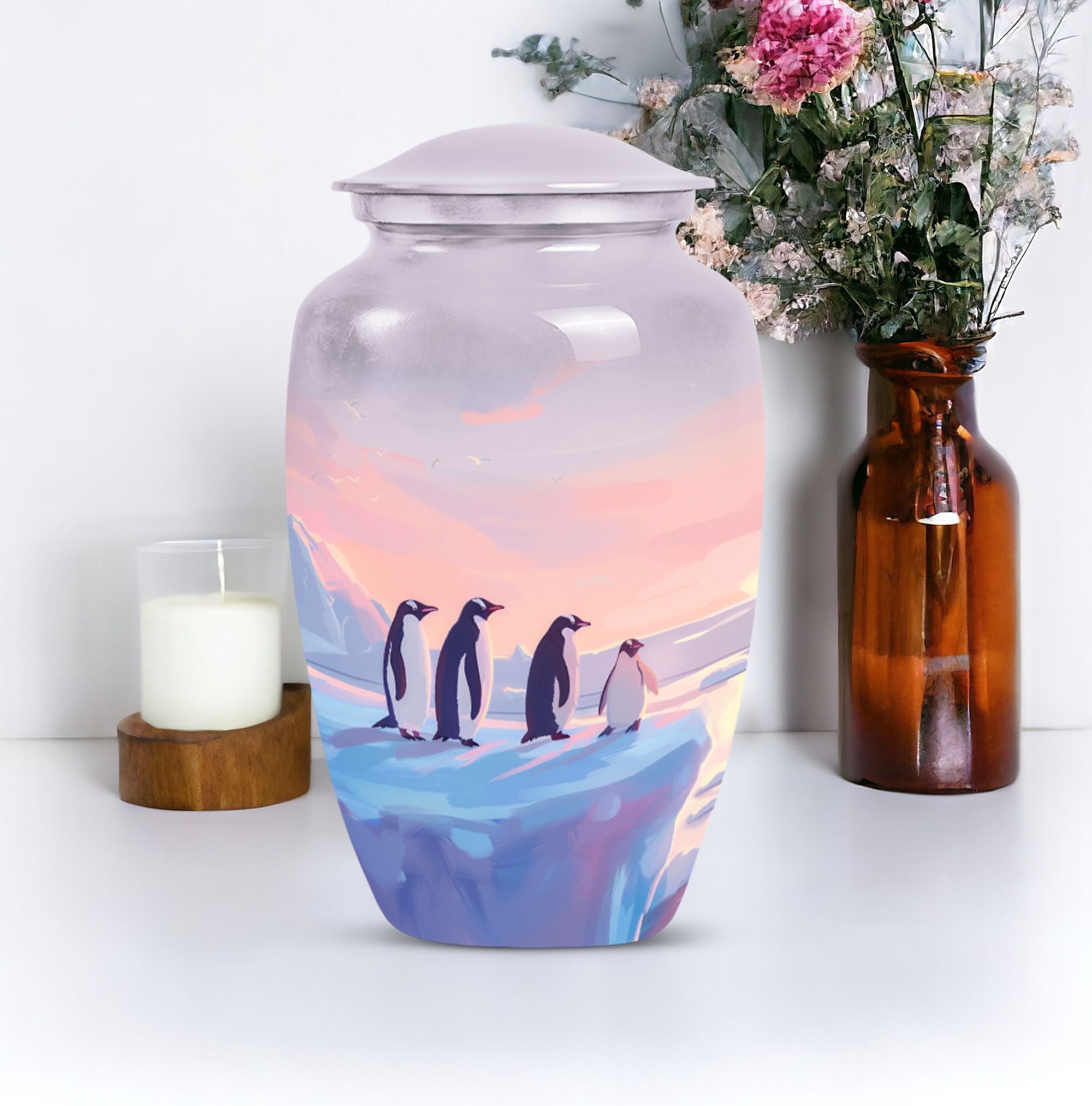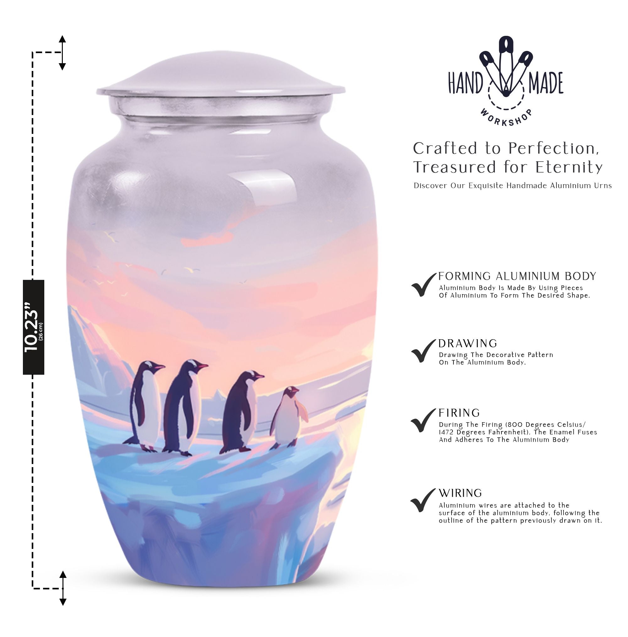 Embark on the tender journey of reminiscence with our exquisitely crafted Penguin Urn. This 10-inch high memorial urn is designed to honor and respect the enduring love you harbor for your departed loved ones. Forming a gentle dwelling for your cherished memories, it can store up to 200 cubic inches of ashes. Each urn weighs 3.3 pounds and is crafted from high-quality Aluminium, ensuring a sturdy and durable sanctuary for the eternal remains. An enchanting butterfly theme graces the urn, beautifully harmonizing the timelessness of spirit and fleeting nature of life. Our product, one of our range of captivating large urns, comes with a complimentary velvet pouch, perfect for containment and safeguarding of ashes. We offer personalization options by engraving names to infuse a personal touch, making it a perfect tribute to your loved ones. This urn perfectly balances craftsmanship and affordability without compromising the essence of memorializing individuals. A synonym to cremation dad urns or burial urns for adult men ashes, it captivates with its iridescent metal sheen. Note: No matter how you perceive it, Penguin Urn is more than just a 'large urn,' it's a loving testament of treasured life moments and eternal affinity.