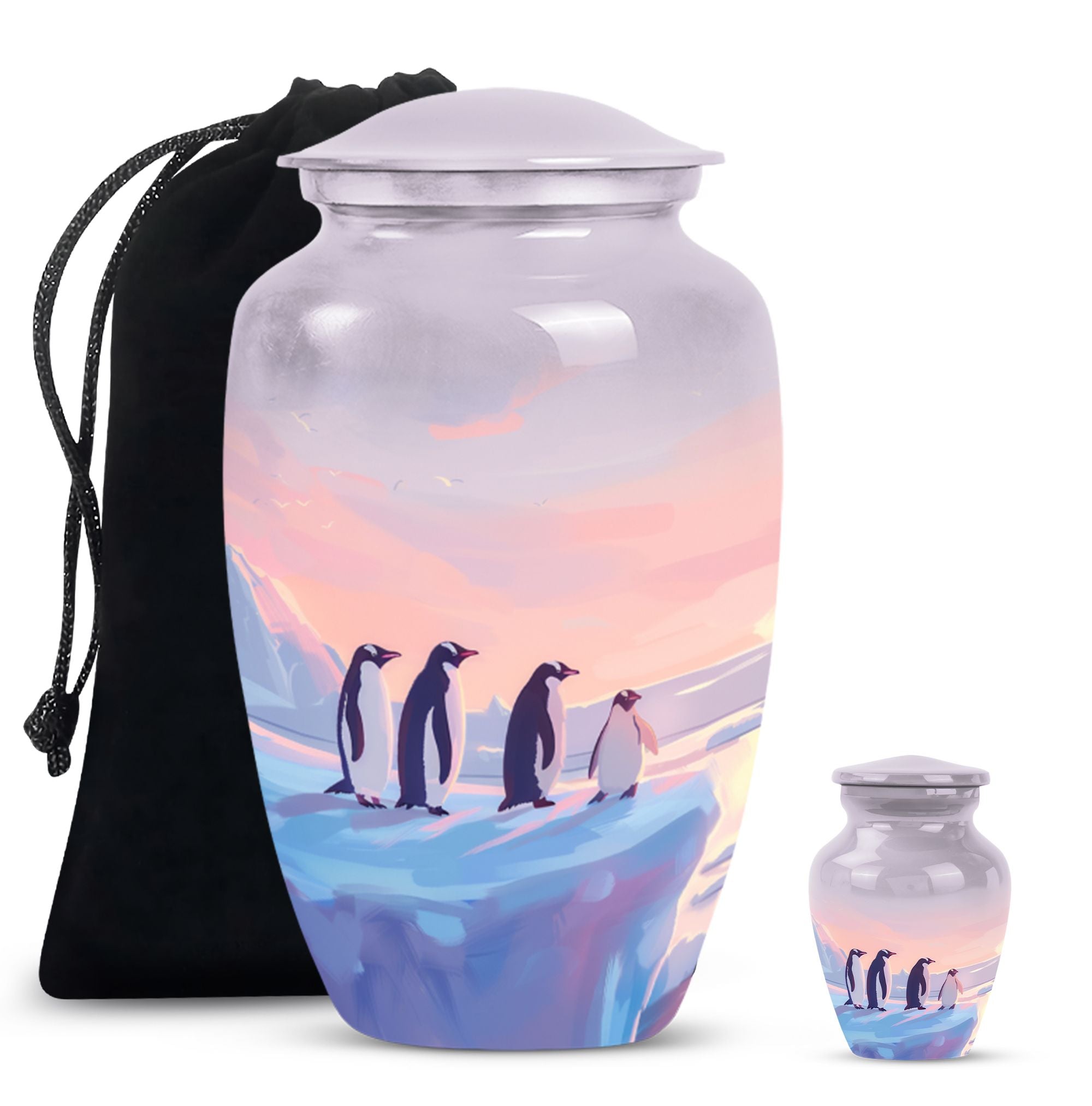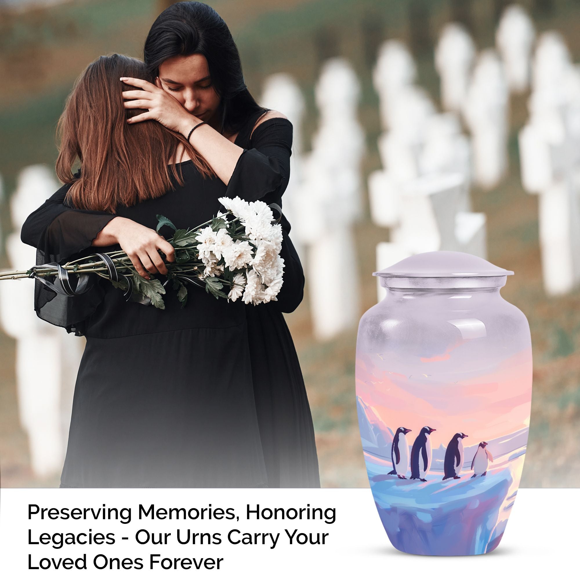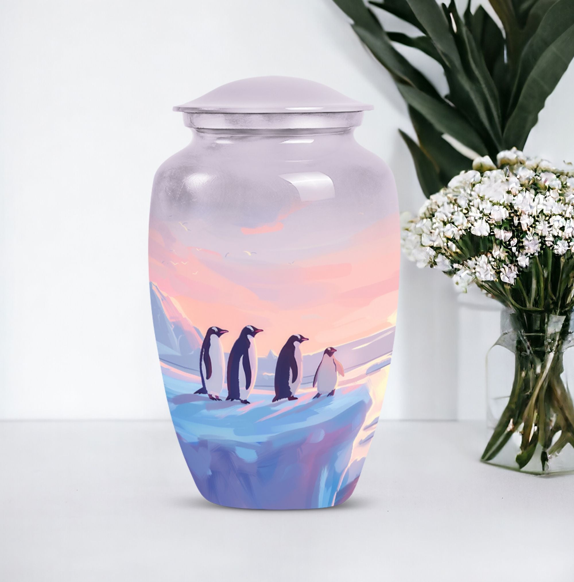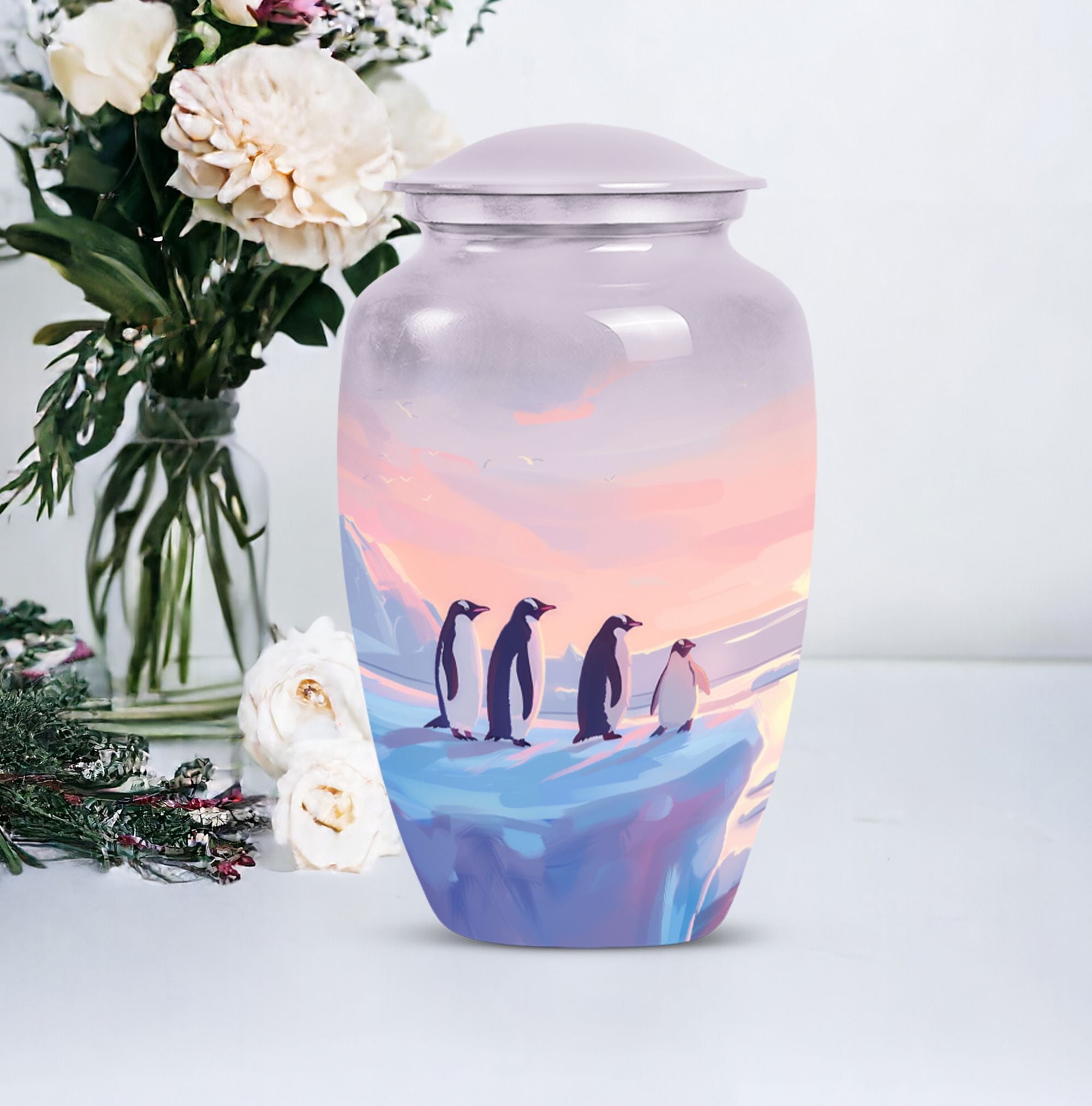 Embark on the tender journey of reminiscence with our exquisitely crafted Penguin Urn. This 10-inch high memorial urn is designed to honor and respect the enduring love you harbor for your departed loved ones. Forming a gentle dwelling for your cherished memories, it can store up to 200 cubic inches of ashes. Each urn weighs 3.3 pounds and is crafted from high-quality Aluminium, ensuring a sturdy and durable sanctuary for the eternal remains. An enchanting butterfly theme graces the urn, beautifully harmonizing the timelessness of spirit and fleeting nature of life. Our product, one of our range of captivating large urns, comes with a complimentary velvet pouch, perfect for containment and safeguarding of ashes. We offer personalization options by engraving names to infuse a personal touch, making it a perfect tribute to your loved ones. This urn perfectly balances craftsmanship and affordability without compromising the essence of memorializing individuals. A synonym to cremation dad urns or burial urns for adult men ashes, it captivates with its iridescent metal sheen. Note: No matter how you perceive it, Penguin Urn is more than just a 'large urn,' it's a loving testament of treasured life moments and eternal affinity.