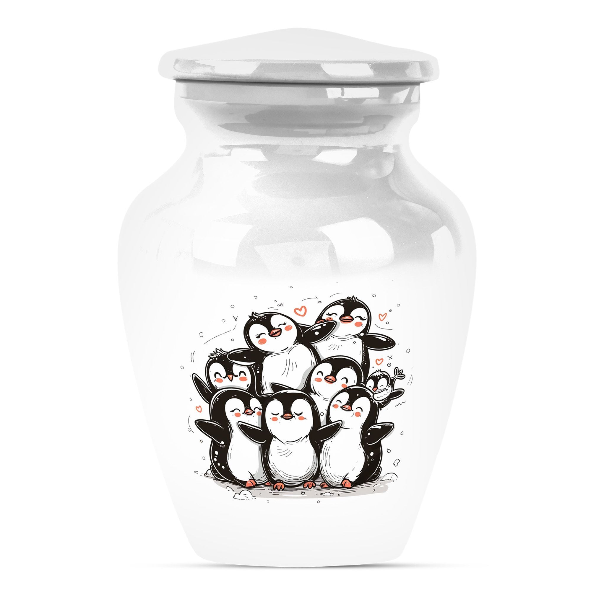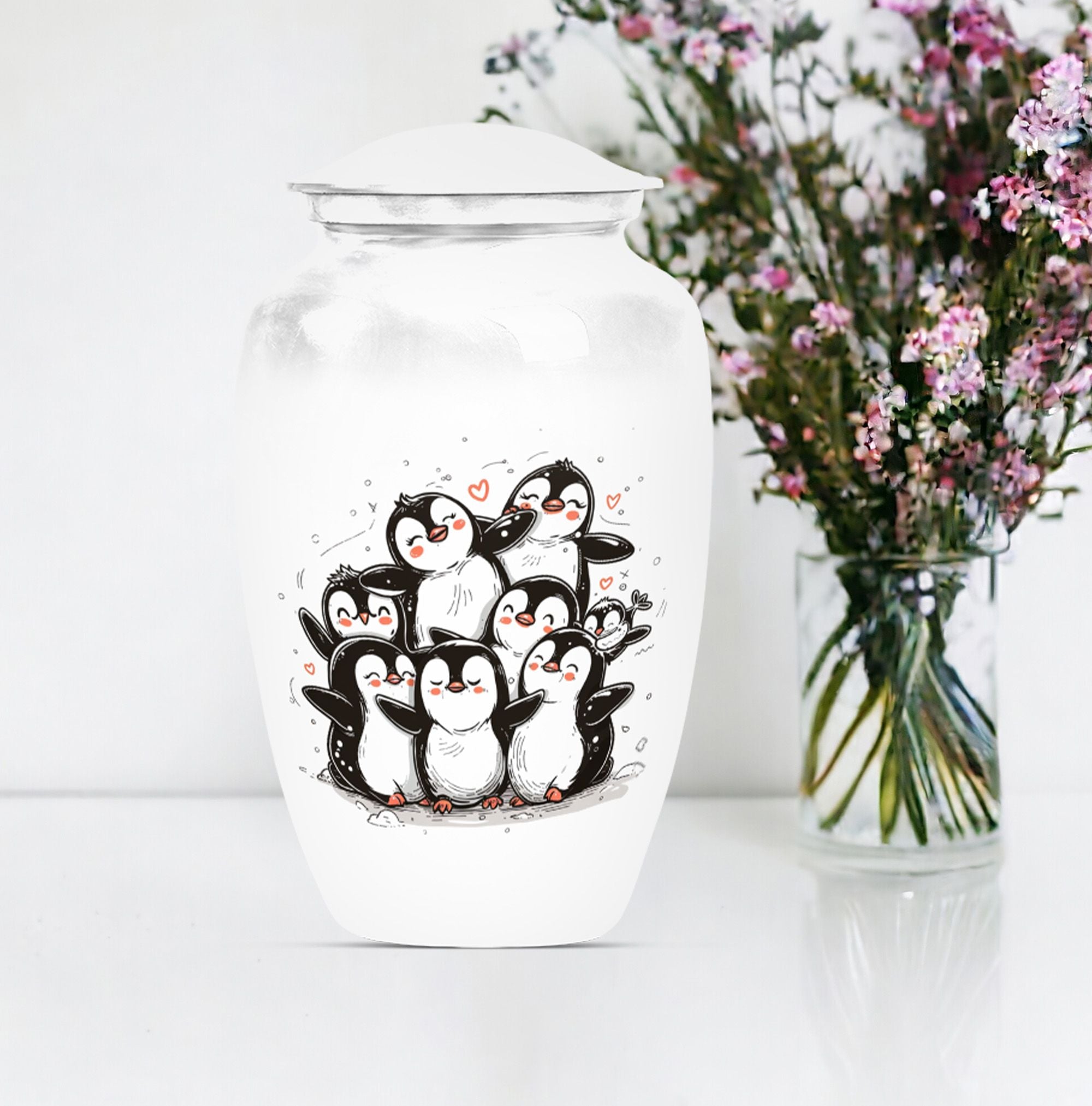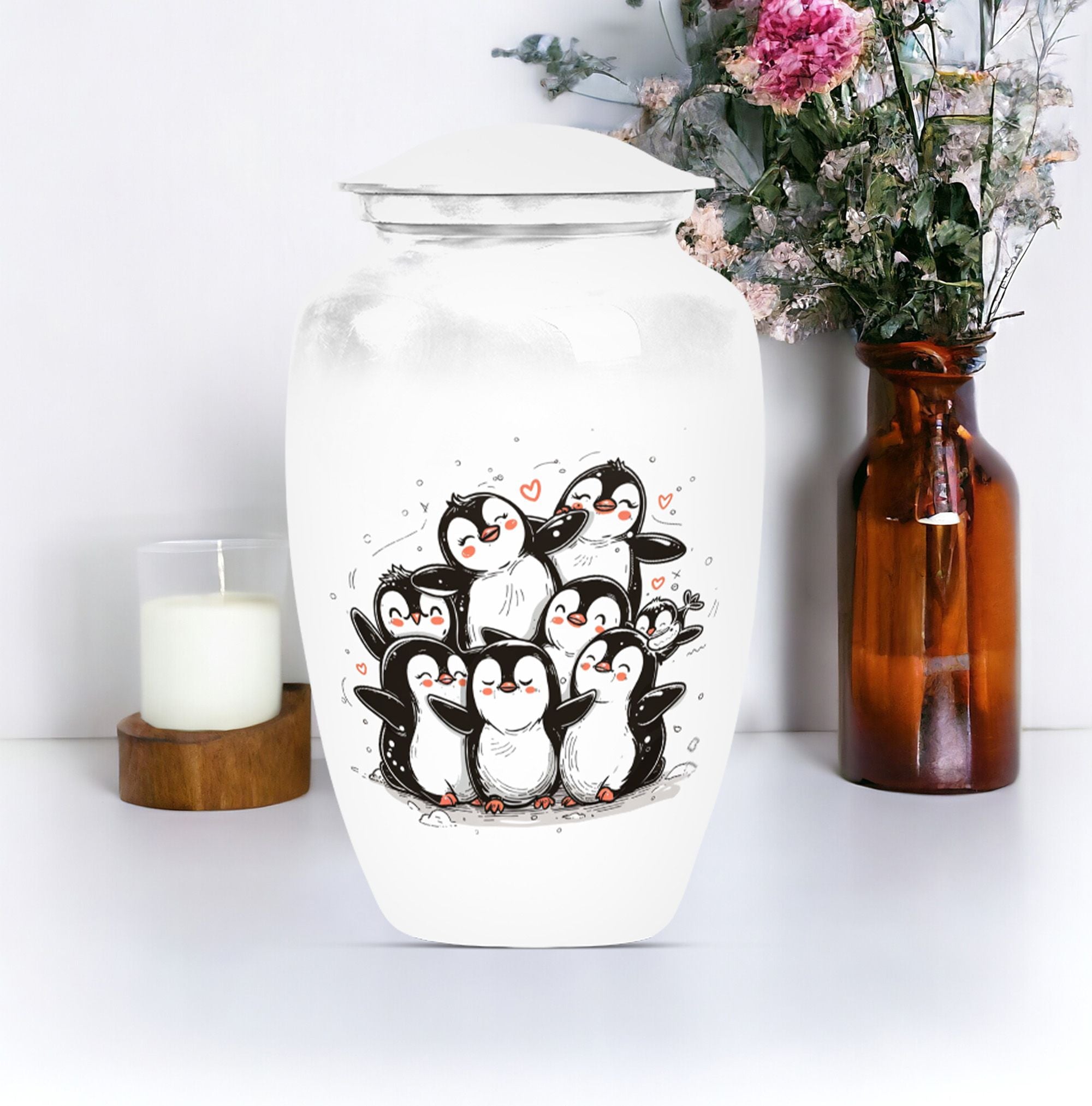 Discover our Penguin Urn, a testament of love and respect, ensuring an eloquent tribute to your loved one's memories. Handcrafted from robust aluminium, this classic cremation urn stands 10 inches in height, and with a hefty weight of 3.3 pounds, it ensures stability wherever it's placed. With an ample capacity of 200 cubic inches, it store adult human ashes with utmost dignity. Its theme is embossed with elegant butterflies, providing a serene, calming aura. The package comes complete with a soft velvet pouch, careful containment and transport of ashes. Its customization features leave room for reflective personal touches, allowing you to engrave names and create a special tribute. Larger than typical urns, this slates itself as a noteworthy addition to your household. Ideal for those seeking cremation urns for adult female ashes or a modern looking urn for a home shrine. However, the Penguin Urn's appeal is not limited: It transcends any ash containment needs with its universal design. Keep their memory alive with a housing as unique and beautiful as they were.