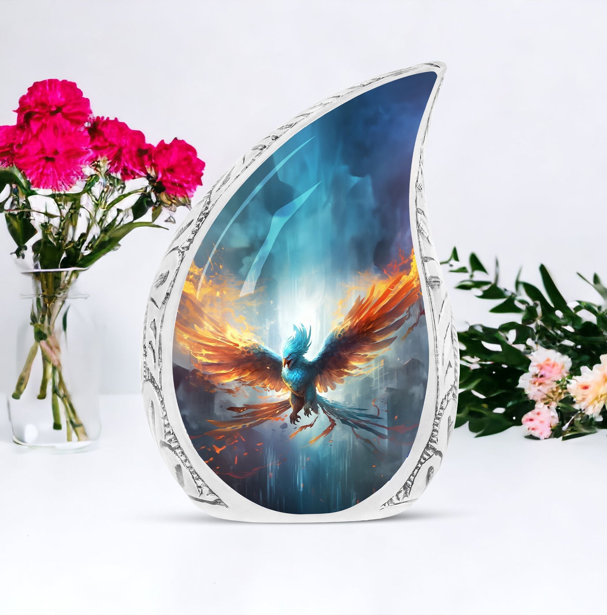Honour the memory of your loved ones with our Blue Phoenix Cremation Urn. Specifically intended for adults, this large urn represents the epitome of classic design in the category of memorial urns, ensuring dignity while beautifully safekeeping precious earthly remains. Fabricated from high-quality Aluminium, the urn weighs 3.3 pounds and stands at 10 inches in height, offering a generous capacity of 200 cubic inches. As a tangible sign of remembrance, it's sized ideally at 3 inches. The package comes complete with a delicate velvet pouch, optimally suited for the safe containment of ashes, enhancing the sanctity of this vital memorial item. Further, we offer the ability to personalize your cremation urn with engraved names, making each urn as unique as the life it commemorates. This urn is more than an ashes holder; it can serve as a decorative urn, blending seamlessly with your home decor. Treasure the memories of your loved ones in an enduring and profound manner with these blue phoenix urns for mom's ashes or celebratory decorative urns for human ashes.
