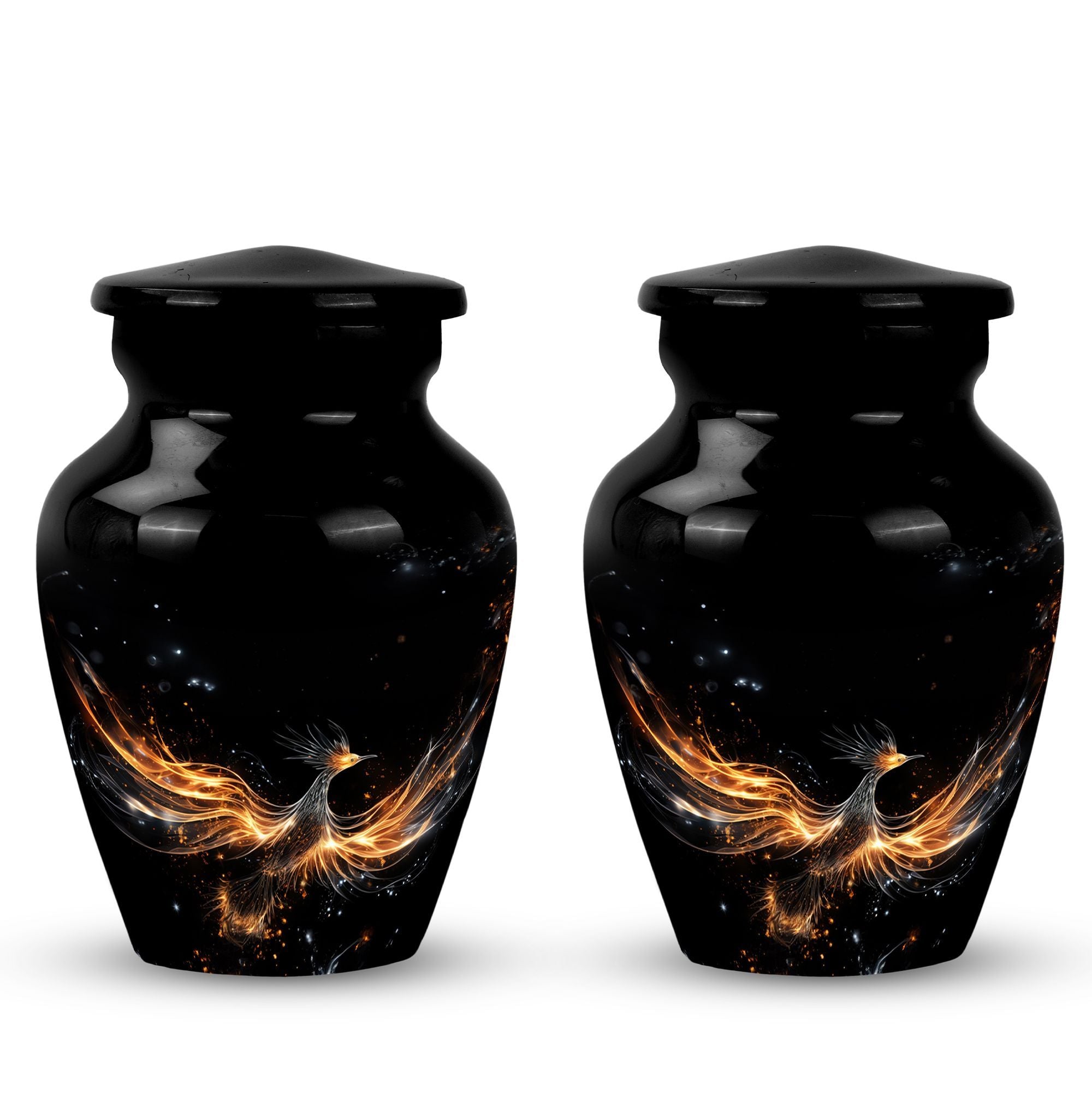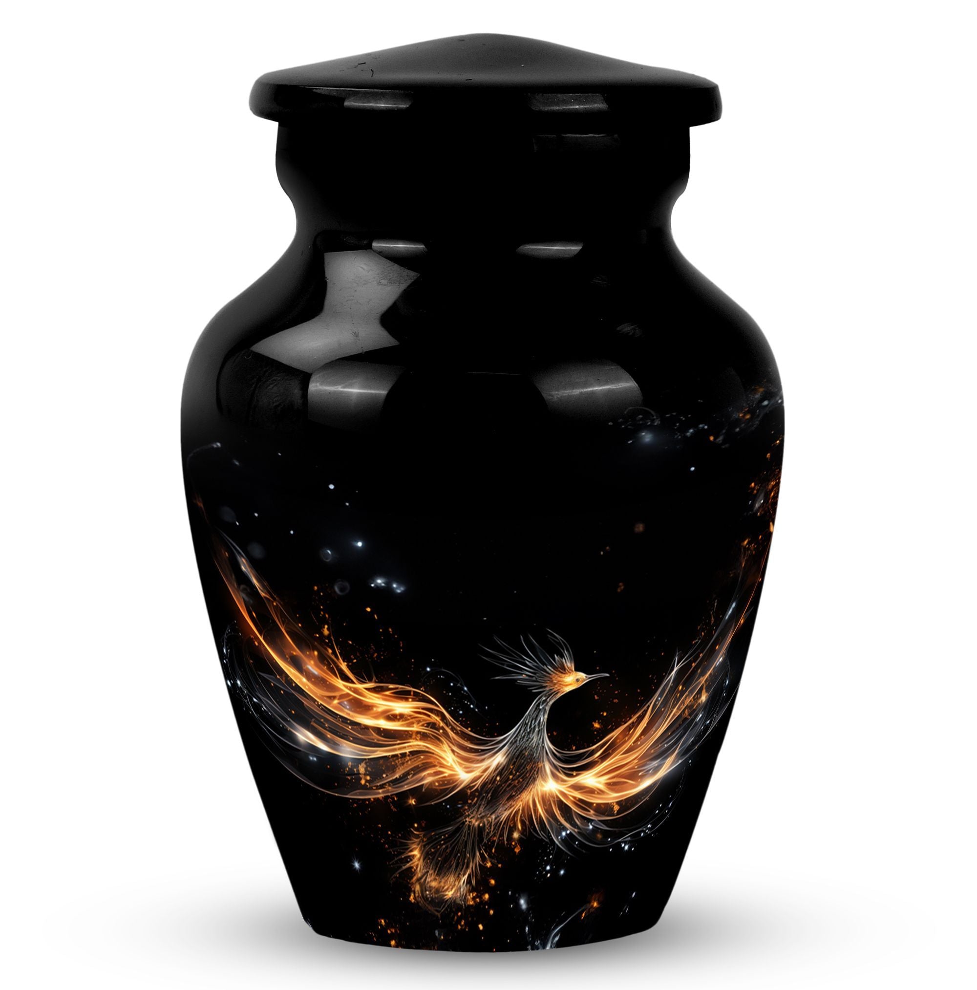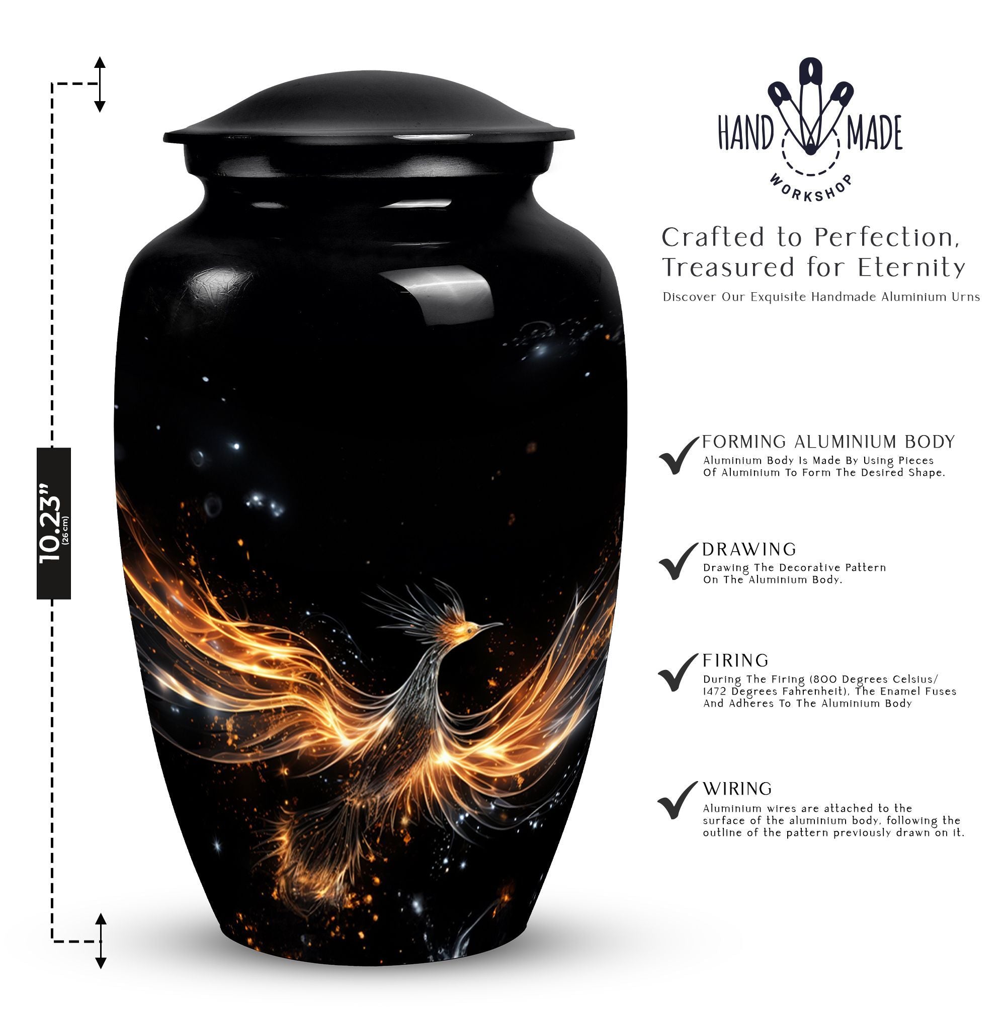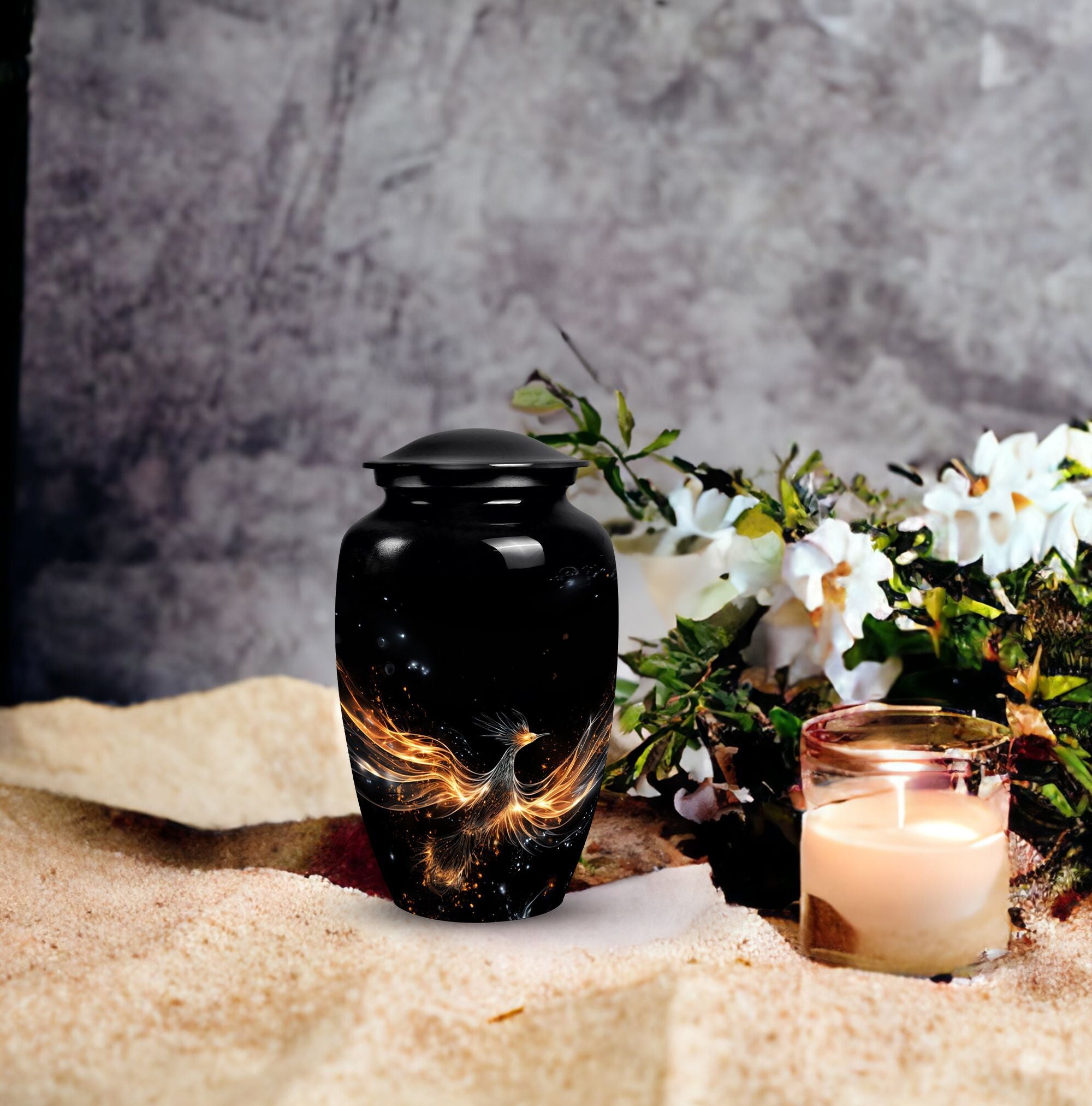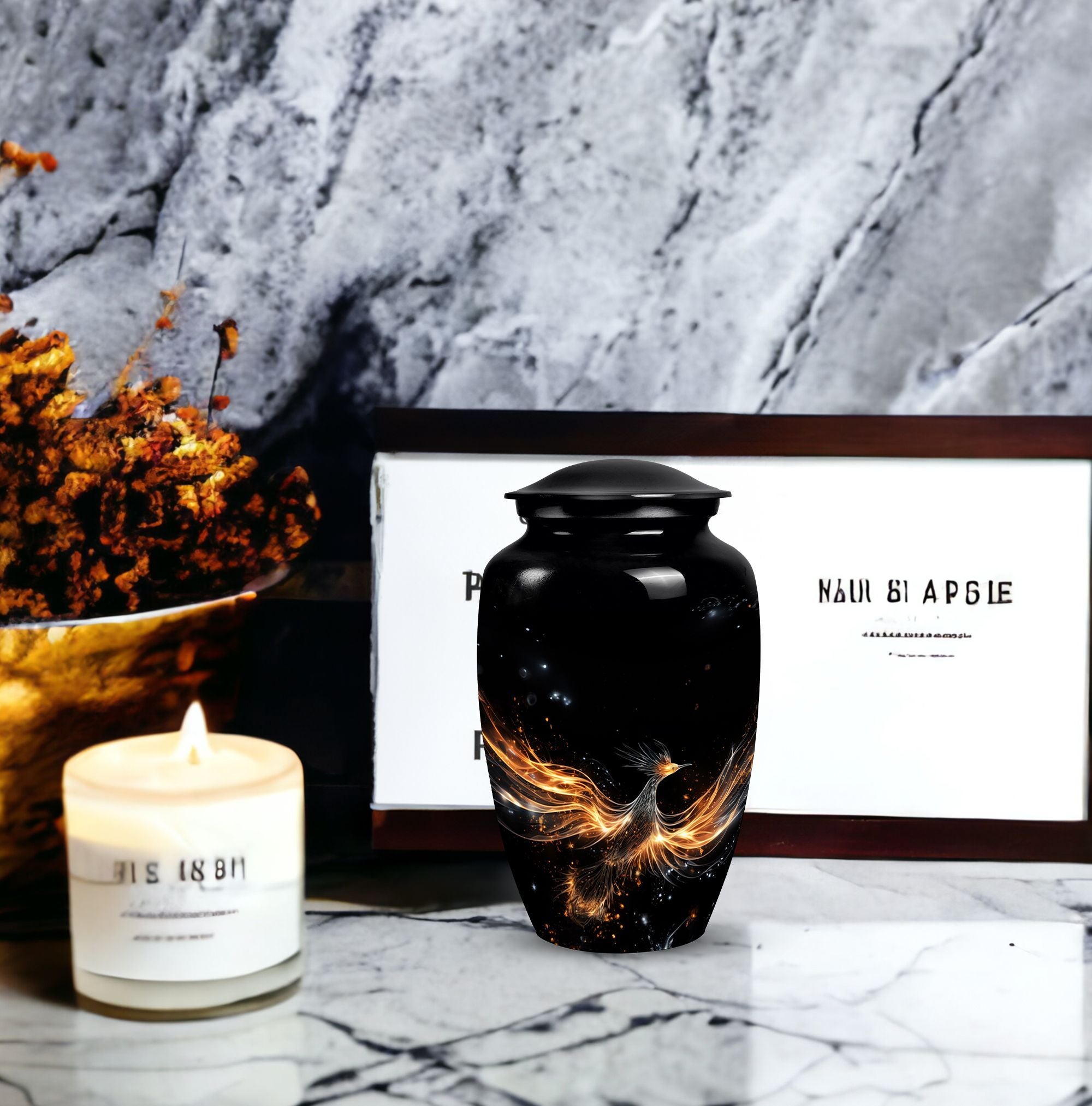 Introducing our Shining Phoenix Large Urn, an exquisite tribute for your loved ones' ashes. Its form evokes a sense of tranquillity and serenity, alluding to the everlasting memory of your loved one. Crafted from durable aluminium, this large urn is designed to endure, preserving the dignity and honor of the departed. It stands impressively at 10 inches in height and weighs 3.3 pounds, signifying its robust and sturdy nature. This cremation urn offers a considerable capacity of 200 cubic inches to hold the remains securely. Complementing the urn's presence is a plush velvet pouch, providing an additional layer of containment and reverence to the ashes. Adding a personalized touch, you can intricely engrave names to further immortalize the memory of your cherished ones. This urn does not only serve as a memorial but also as a piece of art that is bound to manifest the profound respect and love you hold for the departed. With 'Shining Phoenix urns for human ashes, Memorial urns for ashes, Personalized urns for human ashes, and Metal Cremation urns' being its salient aspects, this product indeed stands out in the Memorial Ceremony Supplies category.