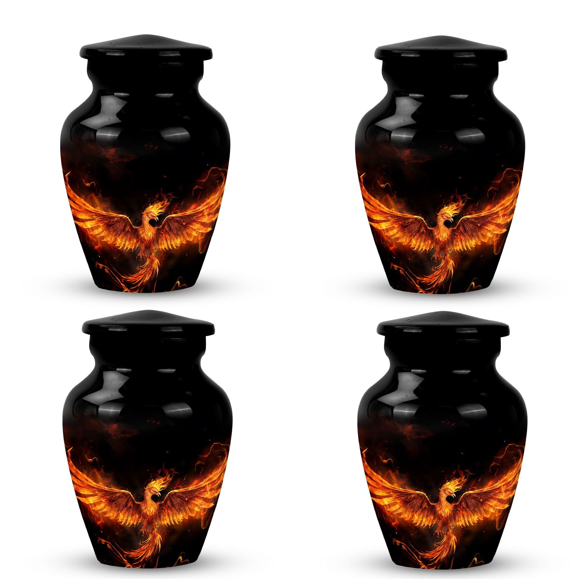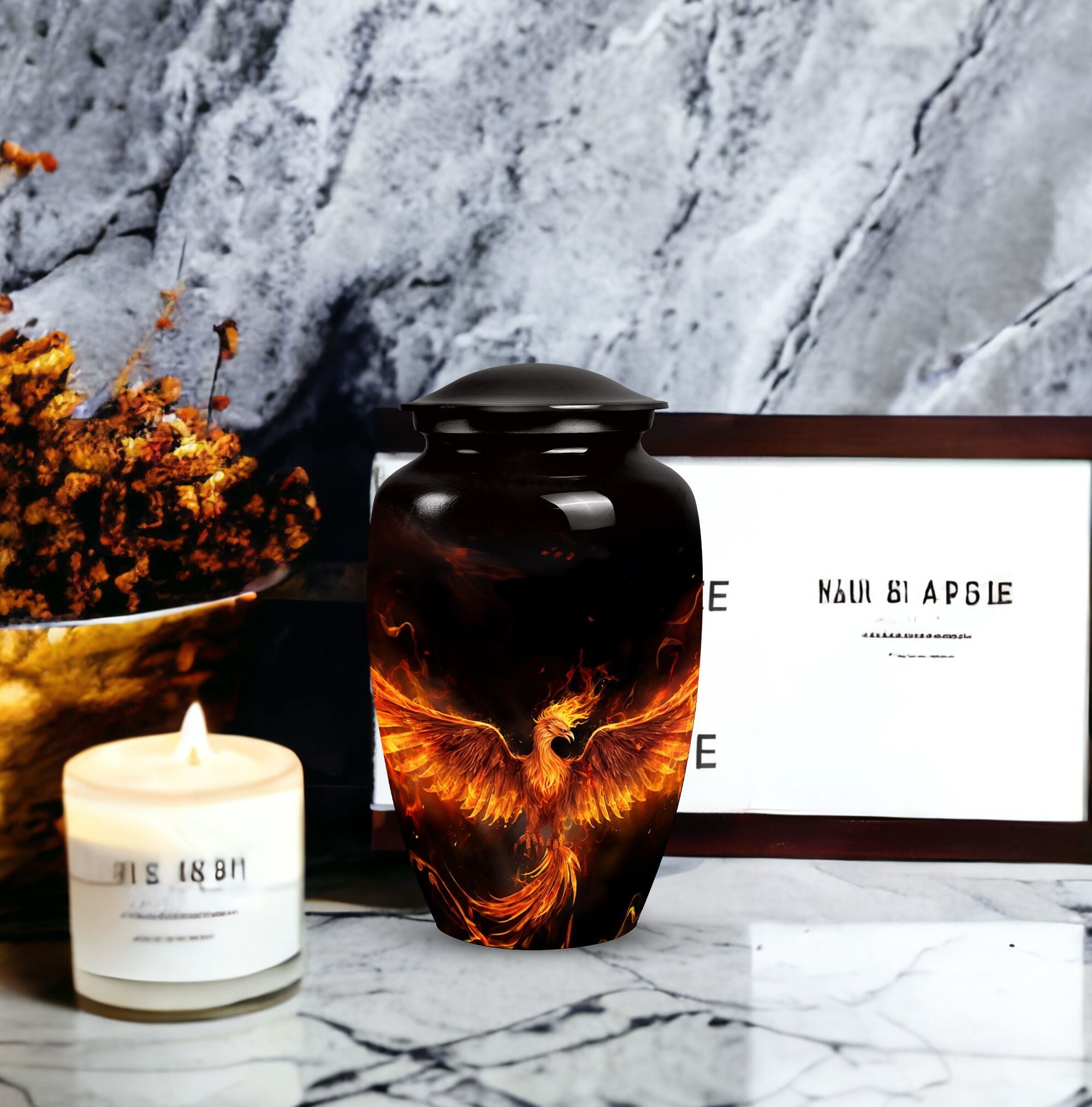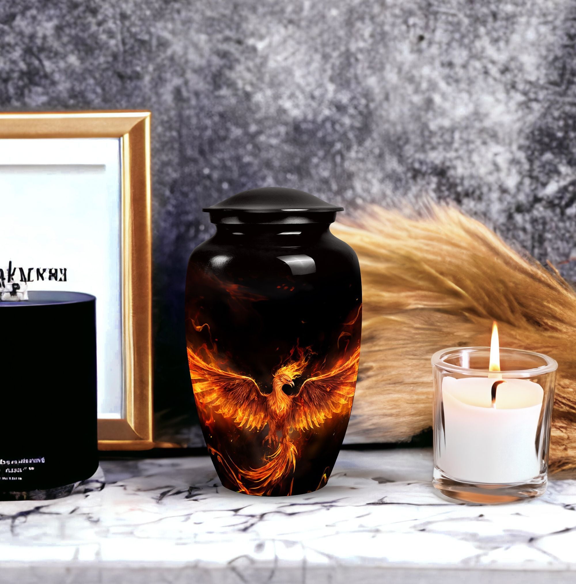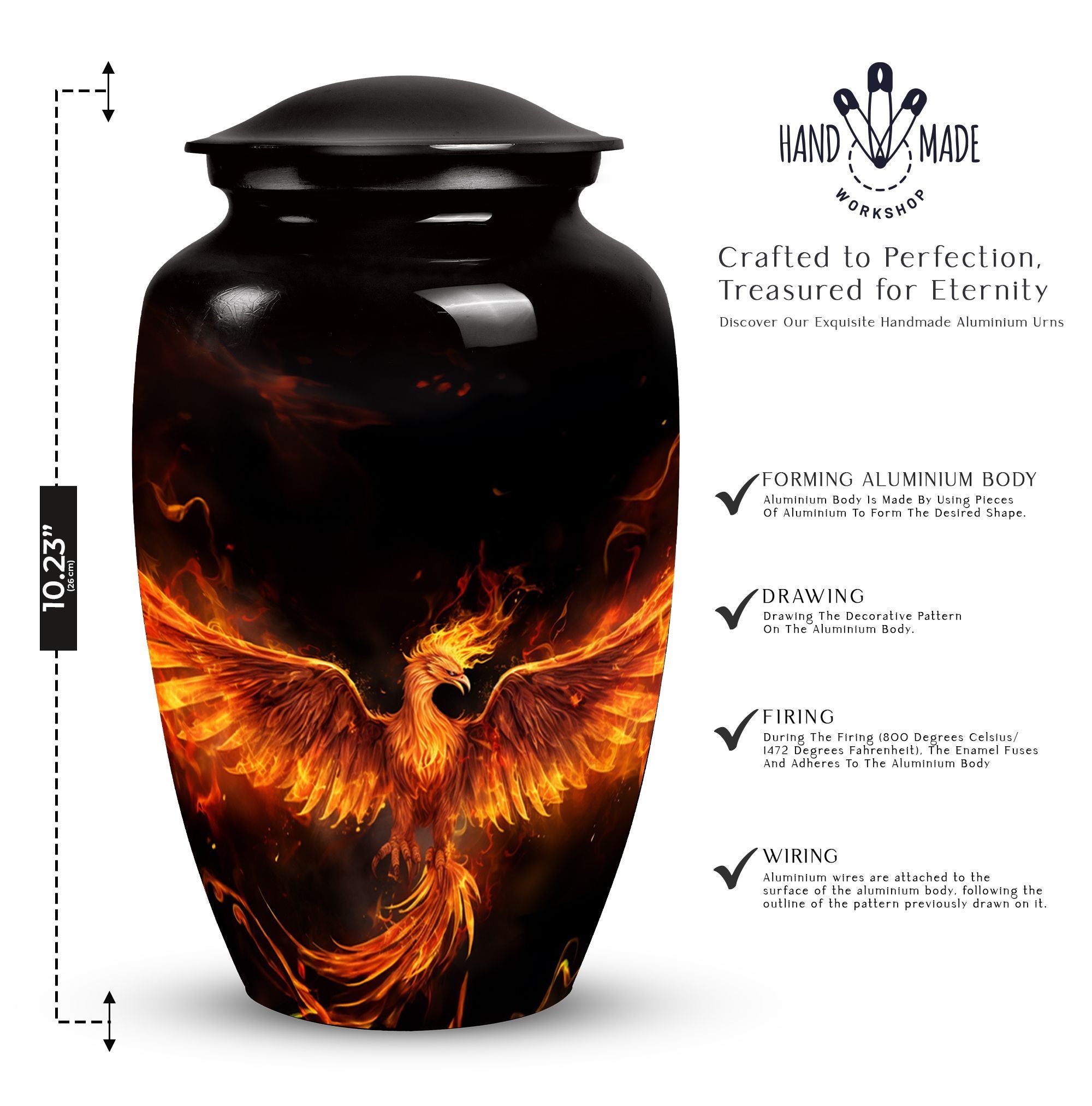 Cherish the memories of your departed loved ones with our Fire Phoenix Memorial Urn. This 3-inch, large-sized aluminium urn is robust yet lightweight at just 3.3 pounds, and skillfully crafted to stand at 10 inches of reverence. This Funeral Urn is uniquely characterized by its classic urn design that's impeccably pleasing to the eyes. The urn is substantial, with a 200 cubic inches capacity, enough to hold the ashes of your loved ones with room to spare. For ease of management, it comes with a velvet pouch for the containment of ashes. Even more, our memorial urns offer a unique touch - they can be personalized with engraved names. This adds an element of reverence, making the urn not just an ashes holder for cremation, but a decorative urn for human ashes. Purchase now to experience not just a container for human ashes, but an ashes keepsake for your lost, but never-forgotten loved ones.