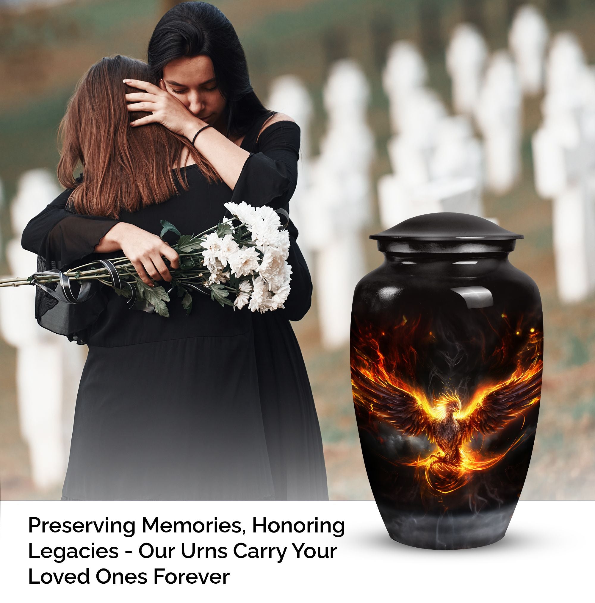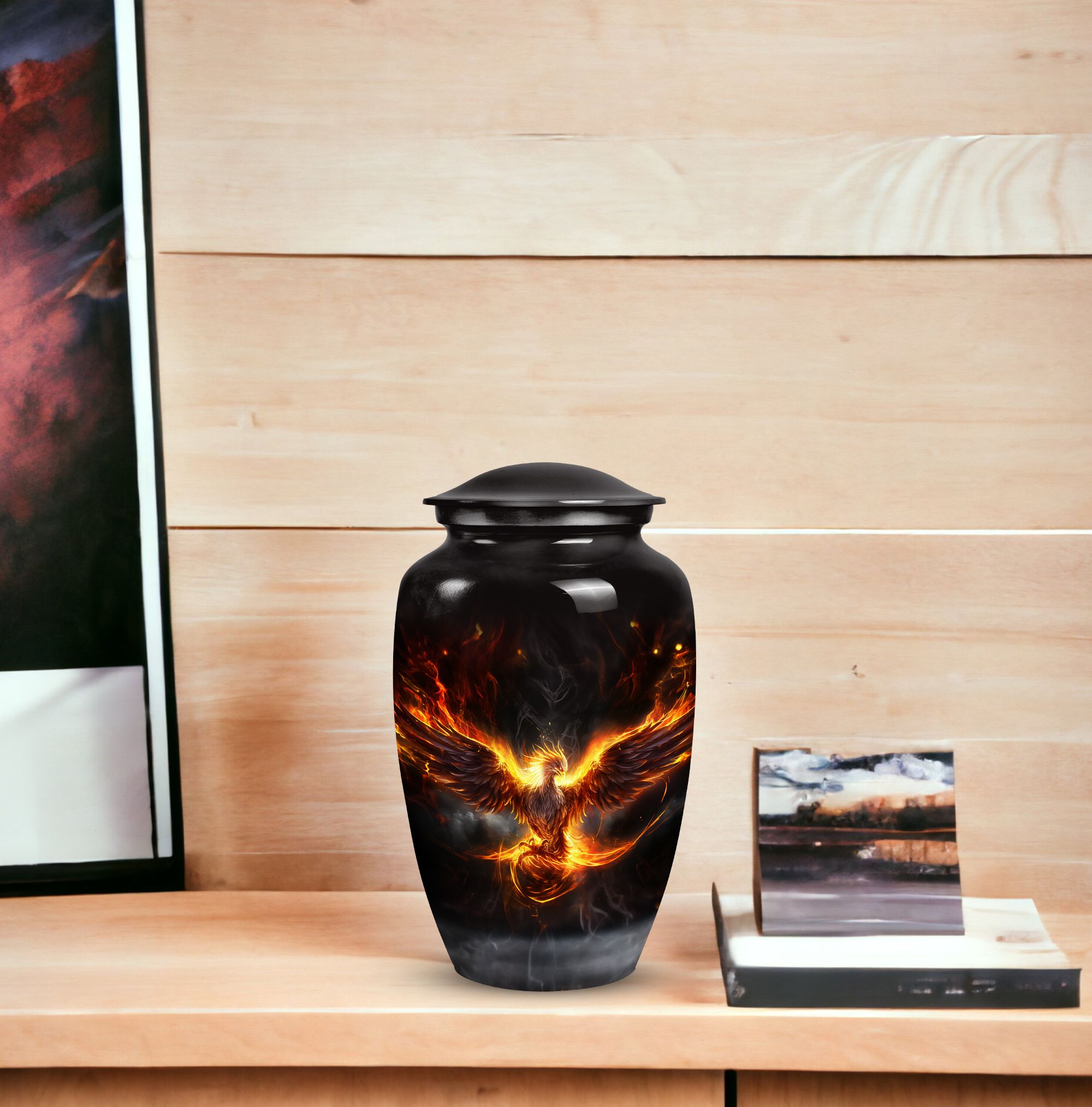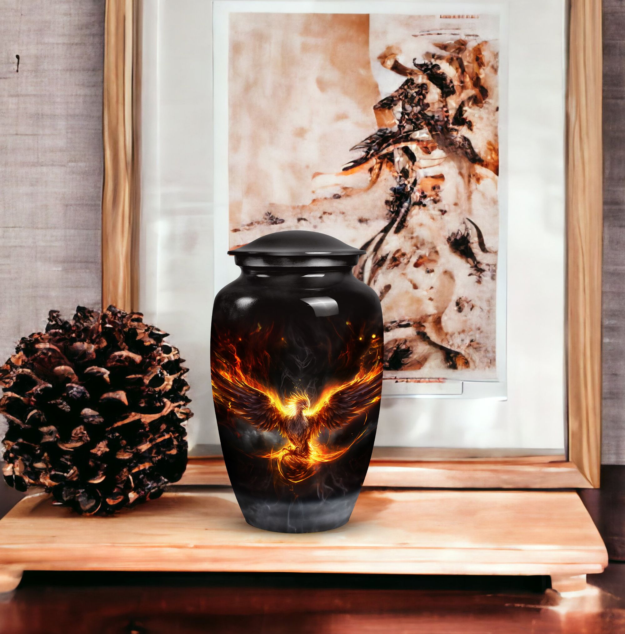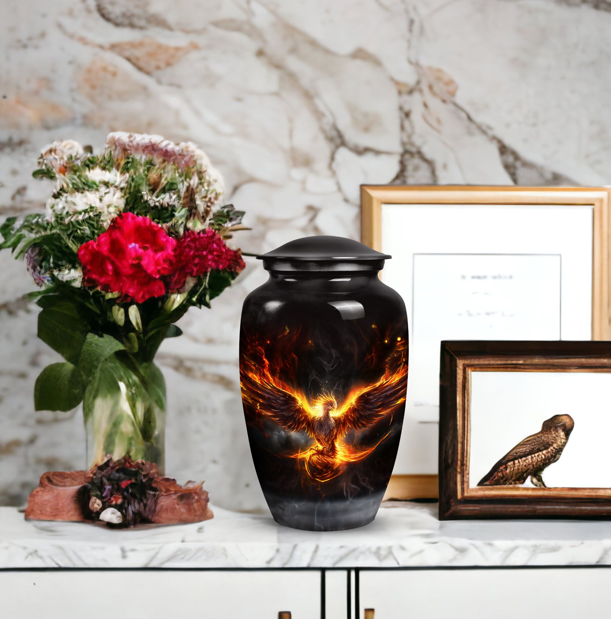 Adorned with a gorgeous Phoenix emblem, this Cremation Urn provides a soothing, uplifting place of rest for your loved one. Designed for adults, be they male or female, this urn is a fitting ode to a cherished existence. Its elegant lines are an homage to the person you knew, while the mythical Phoenix symbolizes their resilience and the eternal cycle of life and death. Specially crafted for ashes post-cremation, this urn is a thoughtful treasure holder for the sprinklings of a transformed life. Often sought by people searching for 'Urns For Human Ashes,' it serves as a poignant reminder of a life well-lived. This Urn aids in fondly encapsulating the memories of a mother or father—serving as an enduring, quiet presence, symbolizing the continuing influence of a parent in our lives. The 'Phoenix Urn' is more than a ceremonial supply; it is a tangible piece of your love, respect, and admiration.
