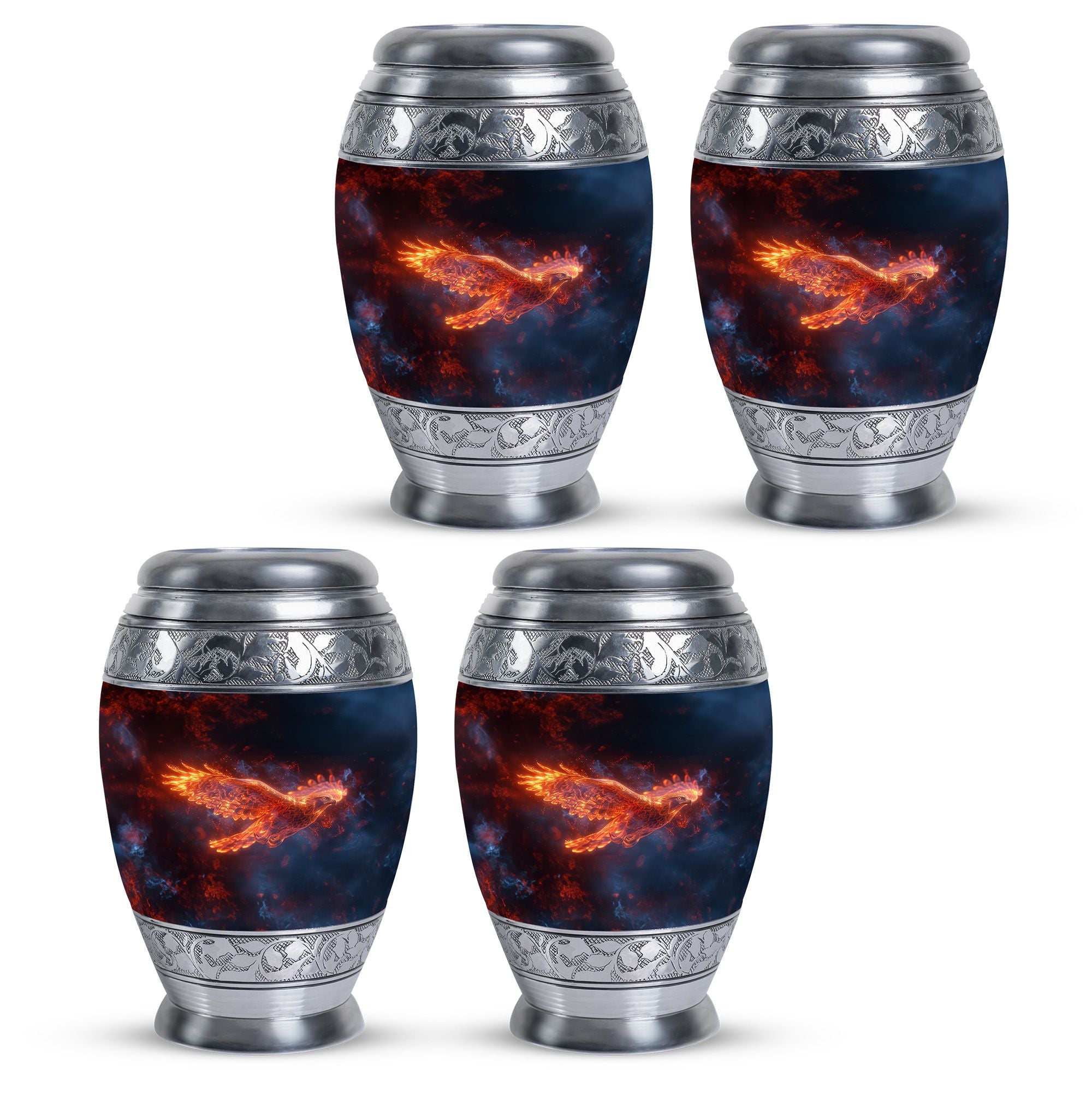 Expertly handcrafted from durable aluminum, this large cremation urn features a striking phoenix motif — a powerful emblem of transformation and eternal spirit. Its polished finish and elegant details make it a fitting large urn for ashes for women or men alike. Built for longevity, the secure screw-top lid ensures ashes remain safely preserved. Perfectly sized as a large urn for human ashes, it serves as both a memorial and a work of art that honors cherished memories.
