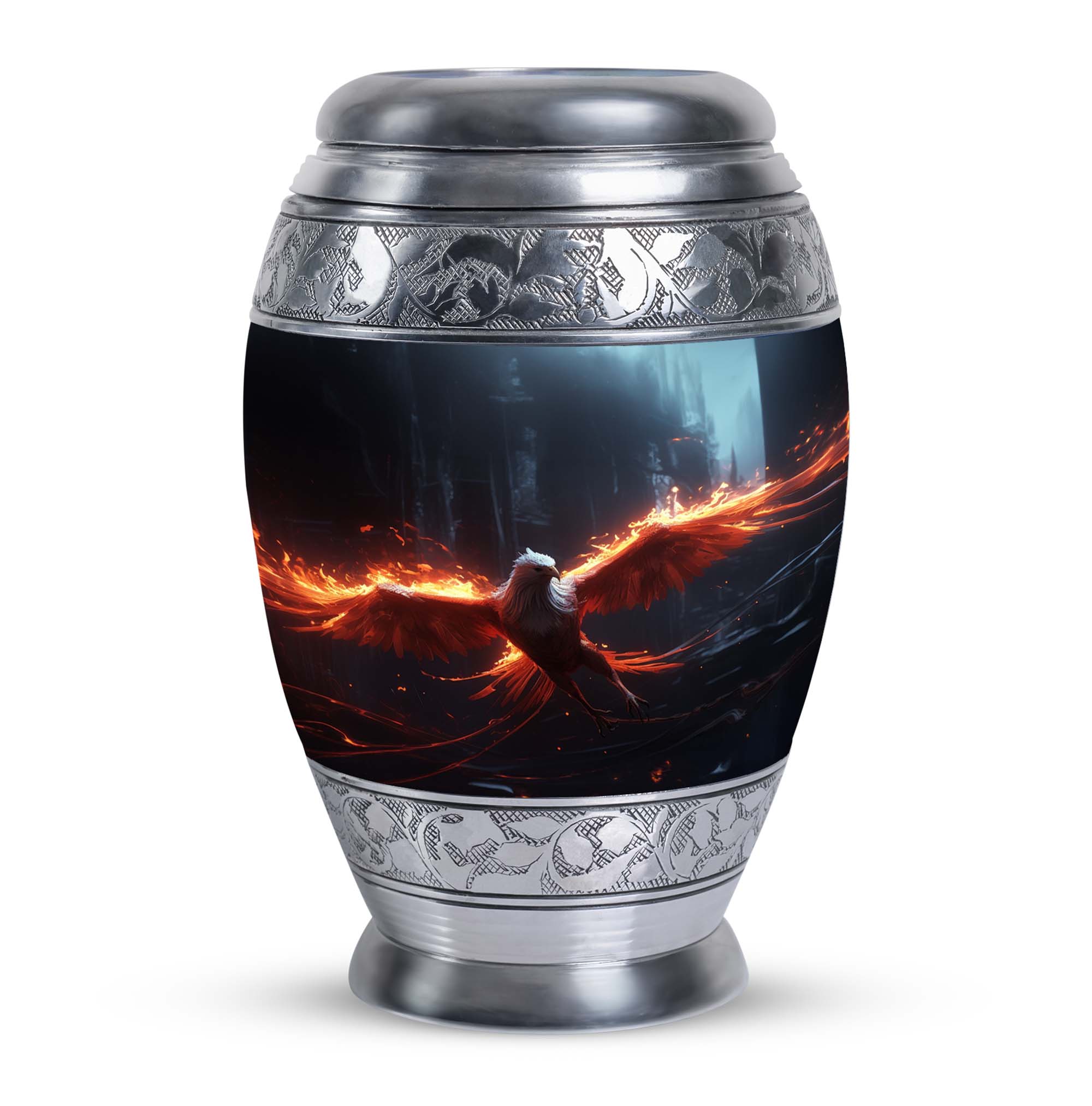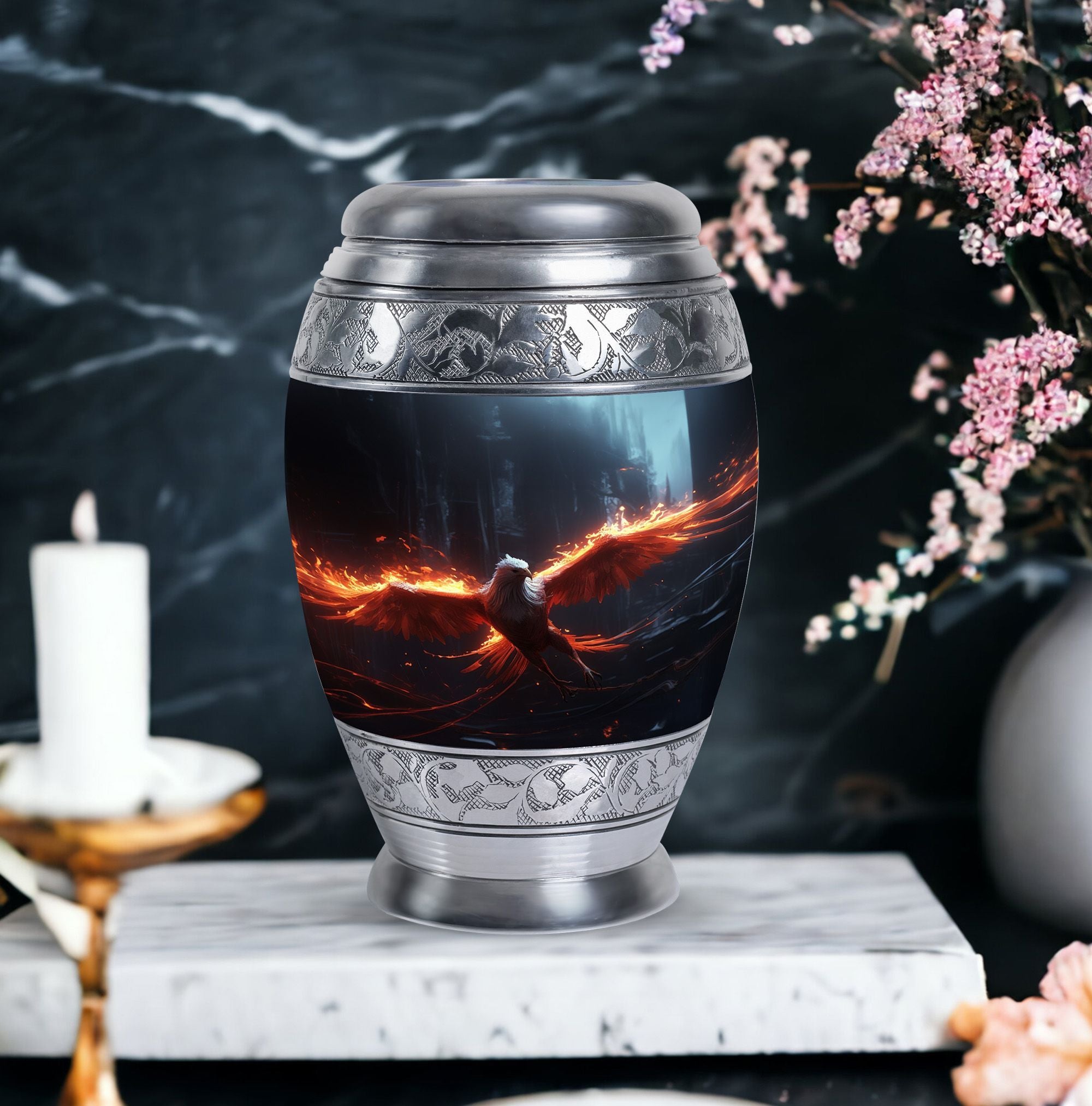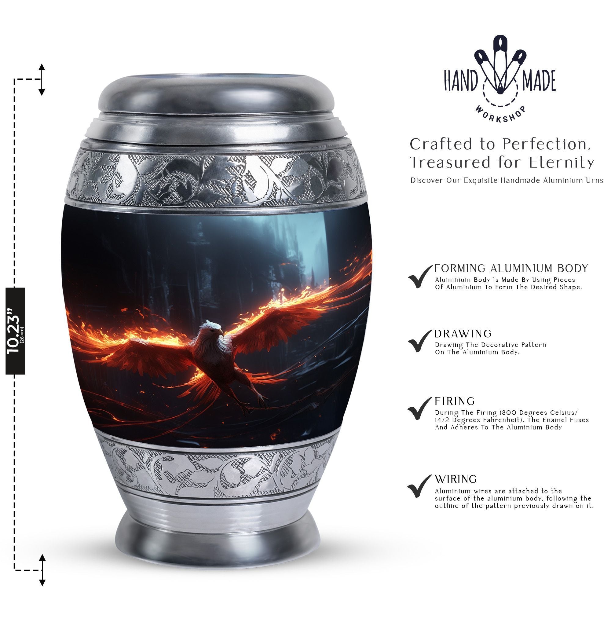 The Phoenix Cremation Urn is a thoughtful way to honor the memory of a loved one. With a size of 3 inches, this classic urn is compact yet spacious, capable of holding up to 200 cubic inches of ashes. The urn is made from durable aluminium, ensuring its longevity and resilience. This large urn has an impressive weight of 3.3 pounds and stands at 10 inches in height, symbolising the substantial presence and impact of the departed soul. To add a more personal touch, you can personalize this urn with engraved names, making it one truly unique memorial gift. The Phoenix Cremation Urn comes with a velvet pouch for the containment of ashes, expressing considerable amounts of care and sentiment. Some key terms related to this product include, 'Beautiful Urns for Mom', 'Large Cremation Urns', 'Personalized Urns for Adults' and 'Personalized Urns for Ashes'.