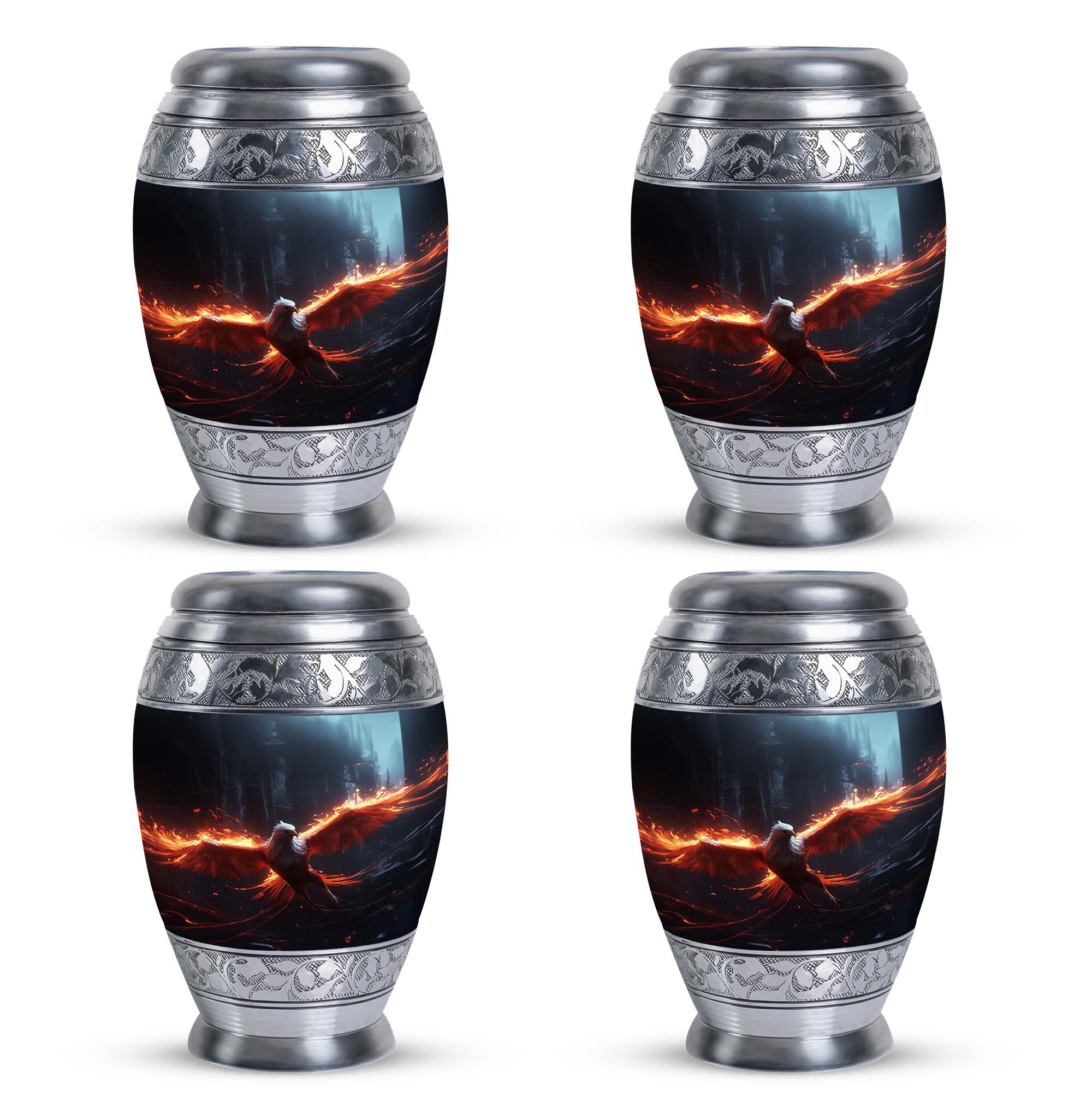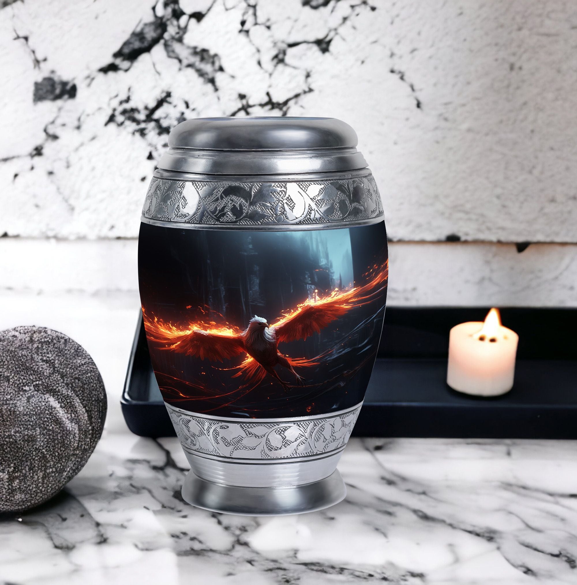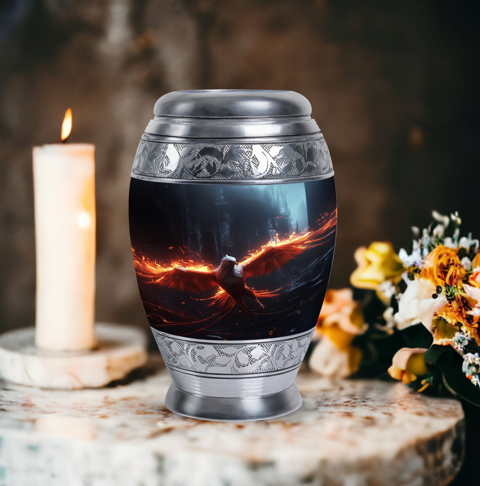 The Phoenix Cremation Urn is a thoughtful way to honor the memory of a loved one. With a size of 3 inches, this classic urn is compact yet spacious, capable of holding up to 200 cubic inches of ashes. The urn is made from durable aluminium, ensuring its longevity and resilience. This large urn has an impressive weight of 3.3 pounds and stands at 10 inches in height, symbolising the substantial presence and impact of the departed soul. To add a more personal touch, you can personalize this urn with engraved names, making it one truly unique memorial gift. The Phoenix Cremation Urn comes with a velvet pouch for the containment of ashes, expressing considerable amounts of care and sentiment. Some key terms related to this product include, 'Beautiful Urns for Mom', 'Large Cremation Urns', 'Personalized Urns for Adults' and 'Personalized Urns for Ashes'.