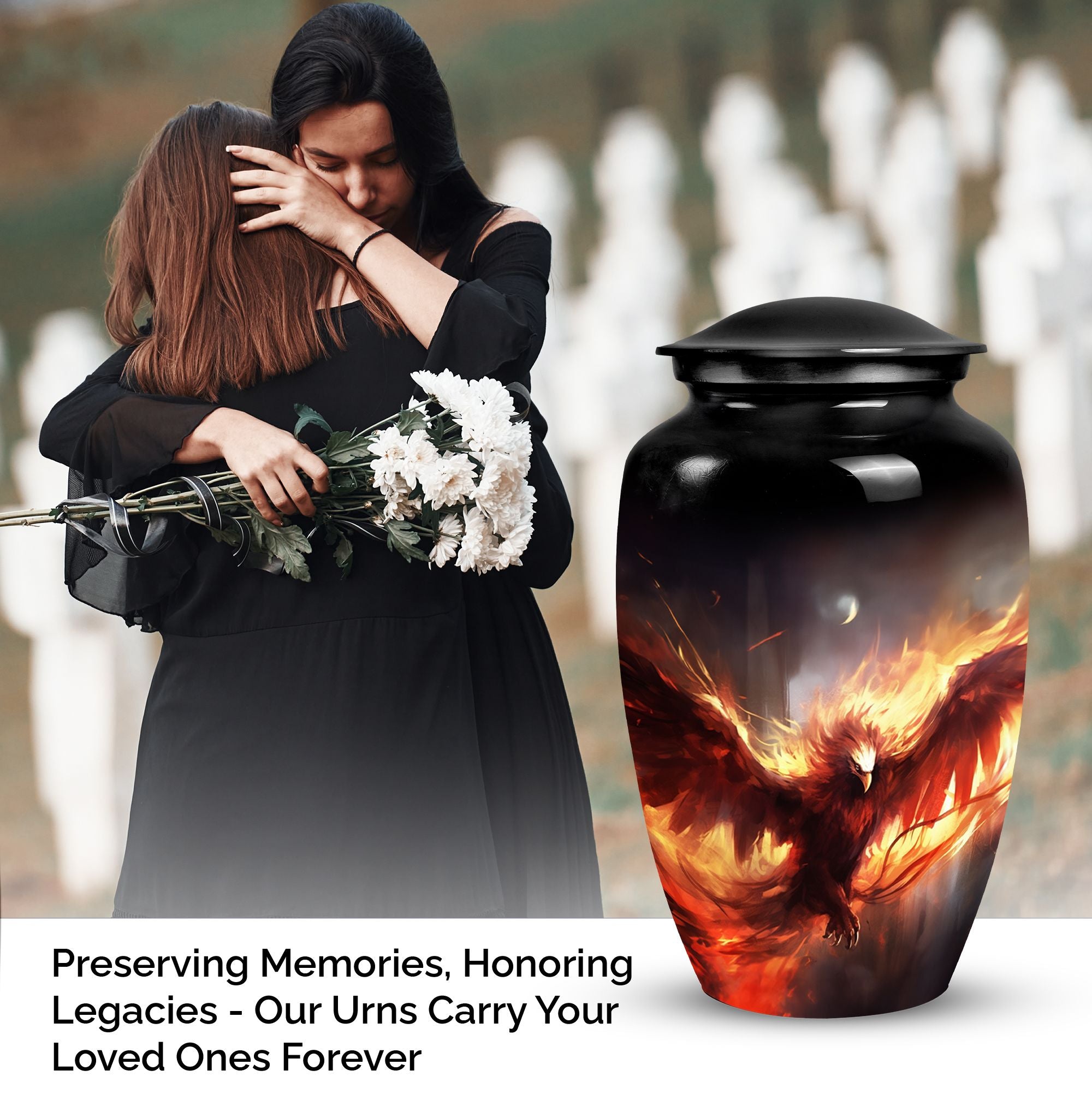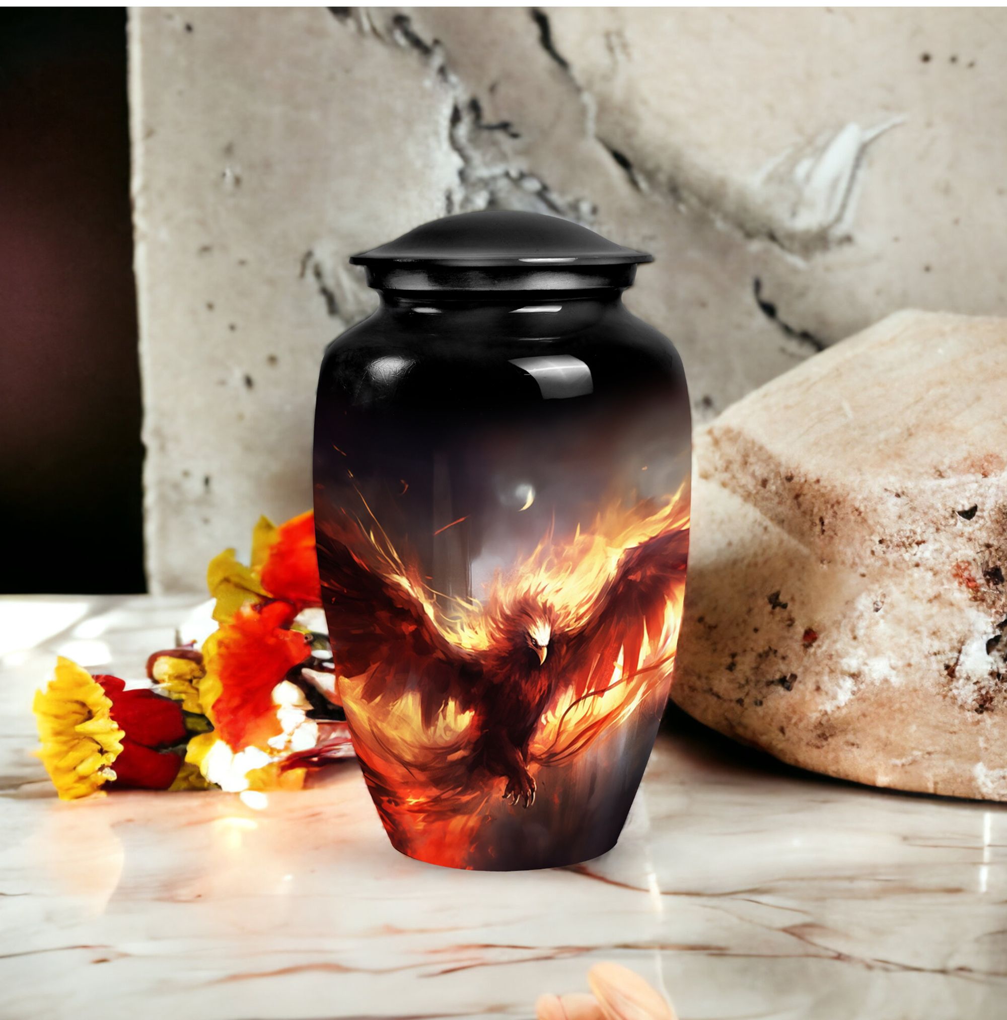 Behold an artifact of ethereal beauty and profound symbolism - the Phoenix Urn. Depicting the mythical creature that rises anew from its ashes, this metal cremation urn carries deep resonance and provides solace during the memorial ceremony. The Phoenix Urn's unique design fosters a comforting reminder of revival and continuity. Crafted with meticulous attention, this medium-sized vessel is ideal for human ashes and suitable for both burial in-ground or keeping as a cherished keepsake. The urn's portability also permits secure transportation, providing peace of mind during those moments of quiet remembrance. Discover a new form of celestial serenity with this one-of-a-kind Phoenix Urn, which captures the eternal human spirit's essence in a timeless display of love and respect.