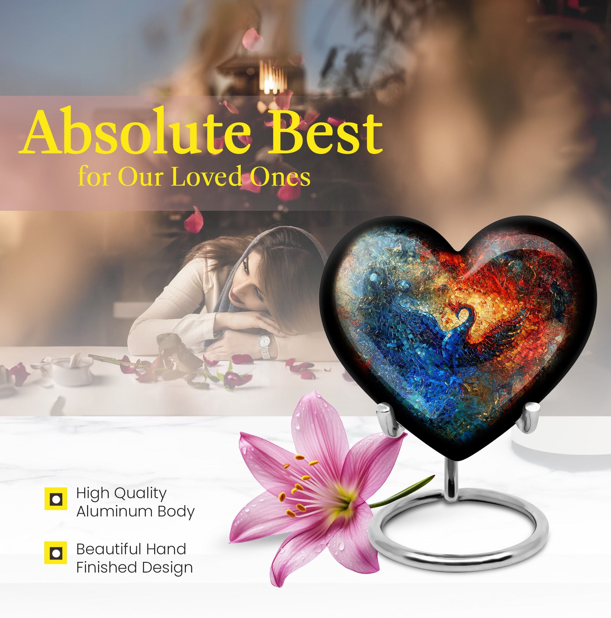 Capture the eternal spirit of your loved one in the abstractly designed and meticulously crafted Phoenix Urn. This large urn has a unique heart theme, offering a distinctive aura of love to honor your deceased adult male. Made from high-quality aluminum, this cremation urn measures 10 inches in height and weighs a solid 3.3 pounds, affirming its substantiality. Its imposing capacity of 200 cubic inches allows ample room for containment. The Phoenix Urn package also includes a velvet pouch that provides a dignified and respectful way to hold the ashes of your dear one. Providing an option to personalize with engraved names, this memorial urn offers the possibility to add an intimate touch to your remembrance. Keywords you might find helpful in your search include 'funeral medium size urns for human ashes', 'human urn adult', 'urns for human ashes adult', and 'companion cremation urns for 2 adults'. Size, weight, and customization are all attributes that make this urn truly unique, and its exceptional design ensures its stand-out quality among other products in the memorial and ceremonial supplies category.