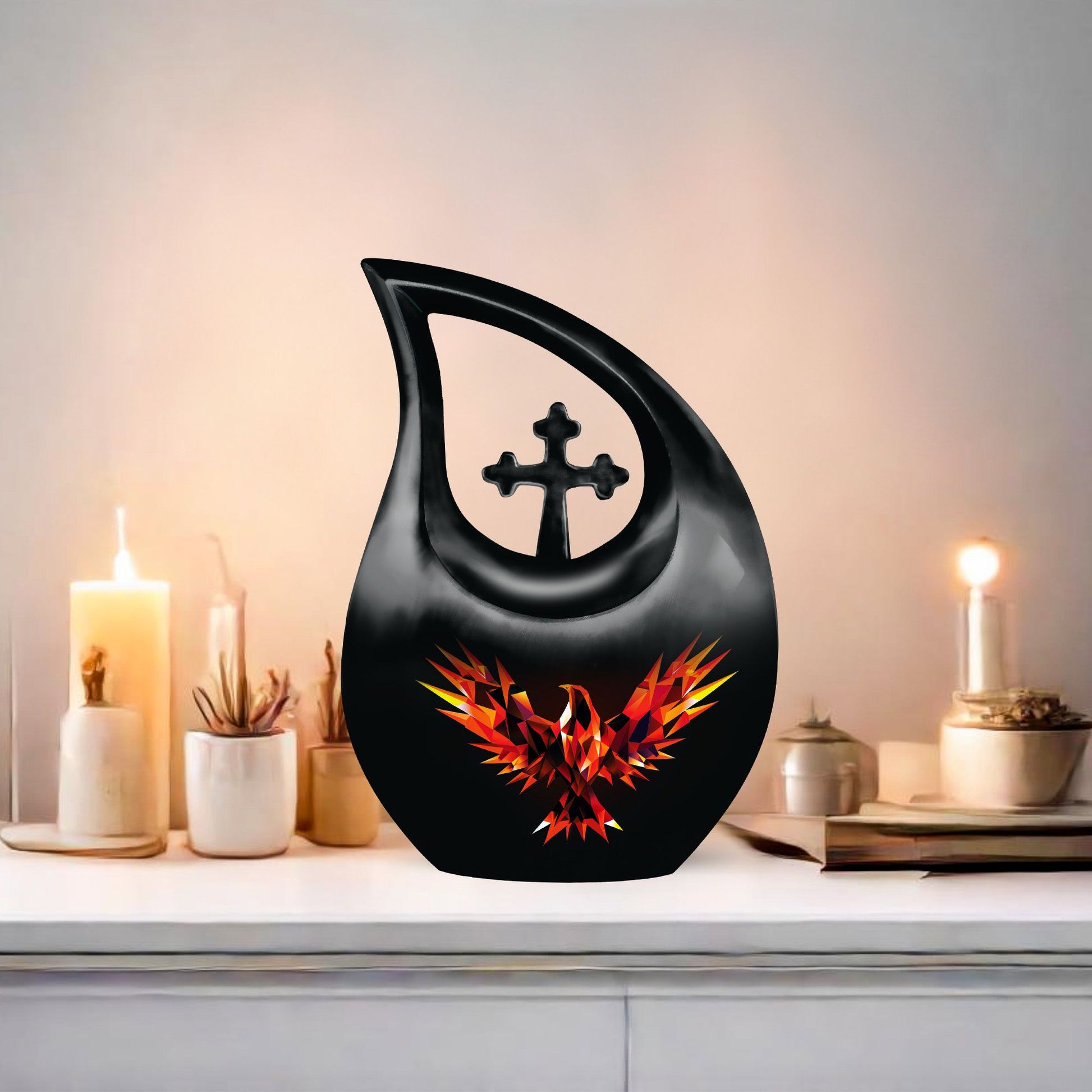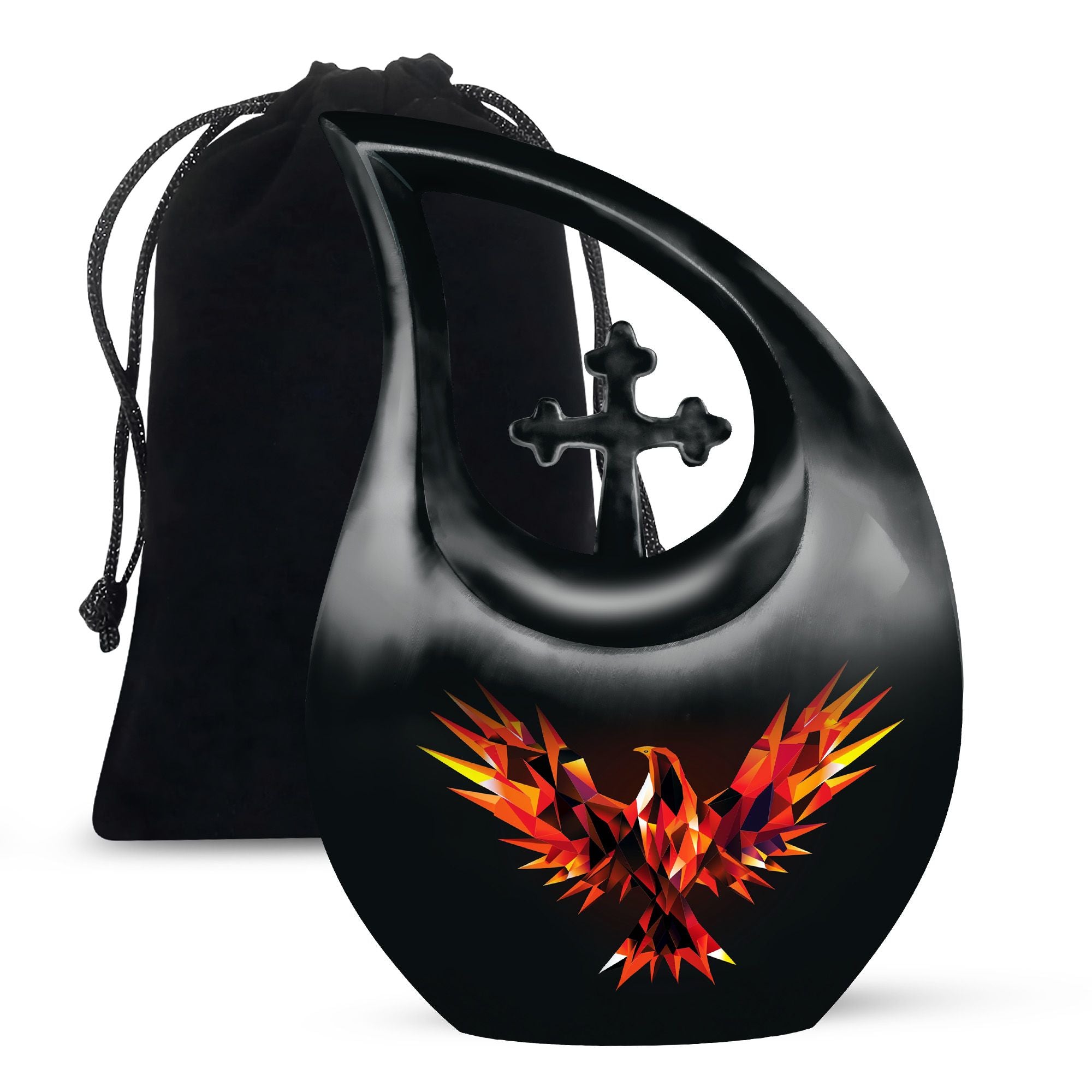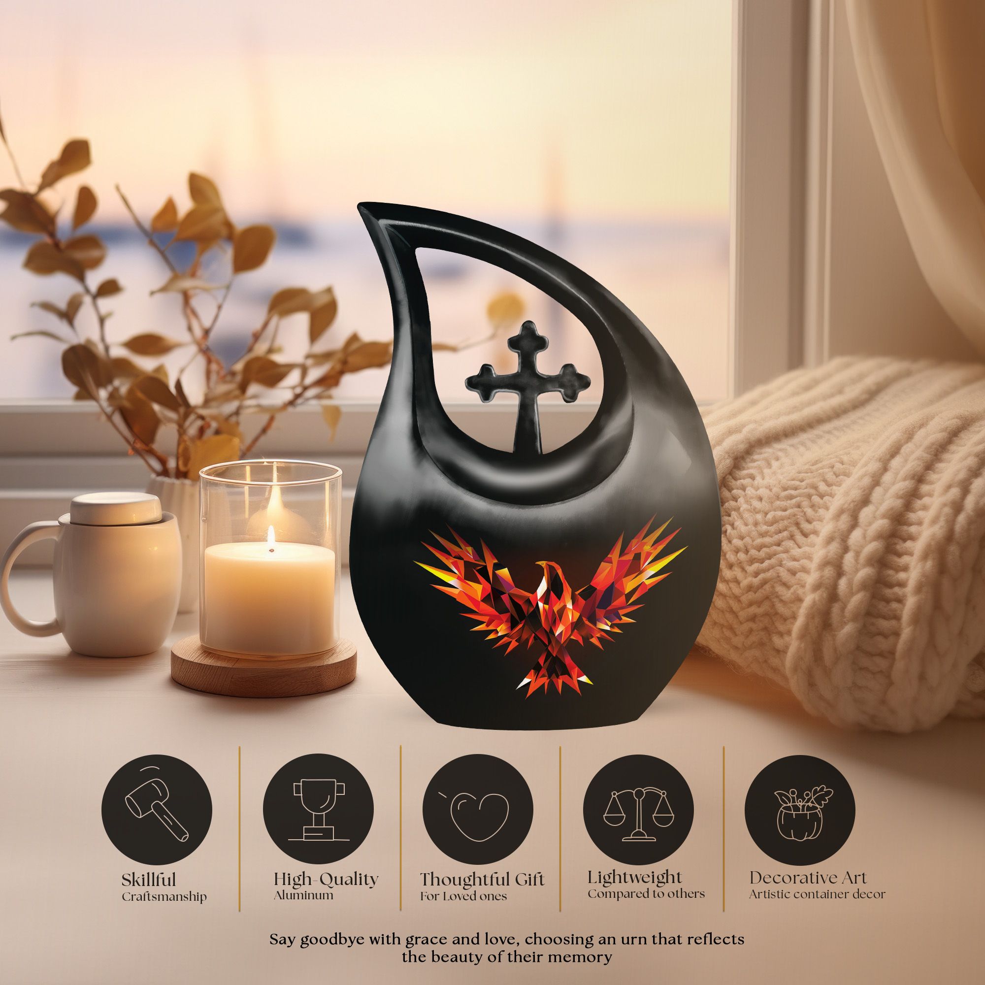 Ideal for those in search of distinctive 'memorial urns', this Phoenix Urn stands 10 inches tall and exudes a unique reverence and elegance. Engineered from resilient aluminium, it's an extra-large urn designed to hold up to 200 cubic inches of ashes, paired with a weight of 3.3 pounds indicating substantiality and durability. Accentuated by a 'Cross Drop' theme that reverberates peace, it's not just a receptacle, but a tribute to your beloved. The urn comes with a luxurious velvet pouch, providing a tactful and respectful containment of the cherished remains. Add a personalized touch with engraving, transforming this Phoenix urn into a truly unique memorial. 'Customized Urns for Ashes', 'Urns for Dad', and 'Personal Urns' bear testimony to the urn's niche. This is more than just an urn, it's a home for your precious memories.