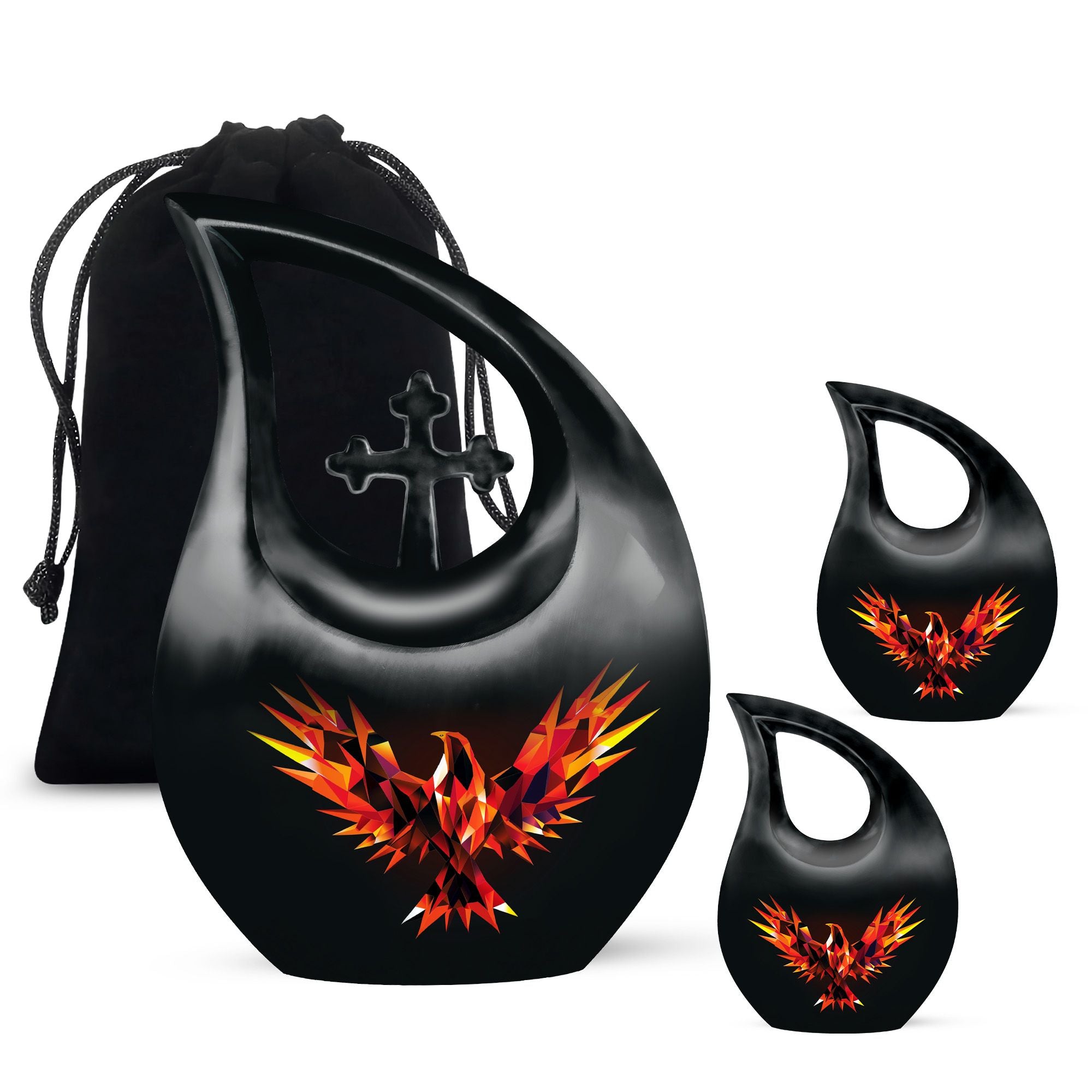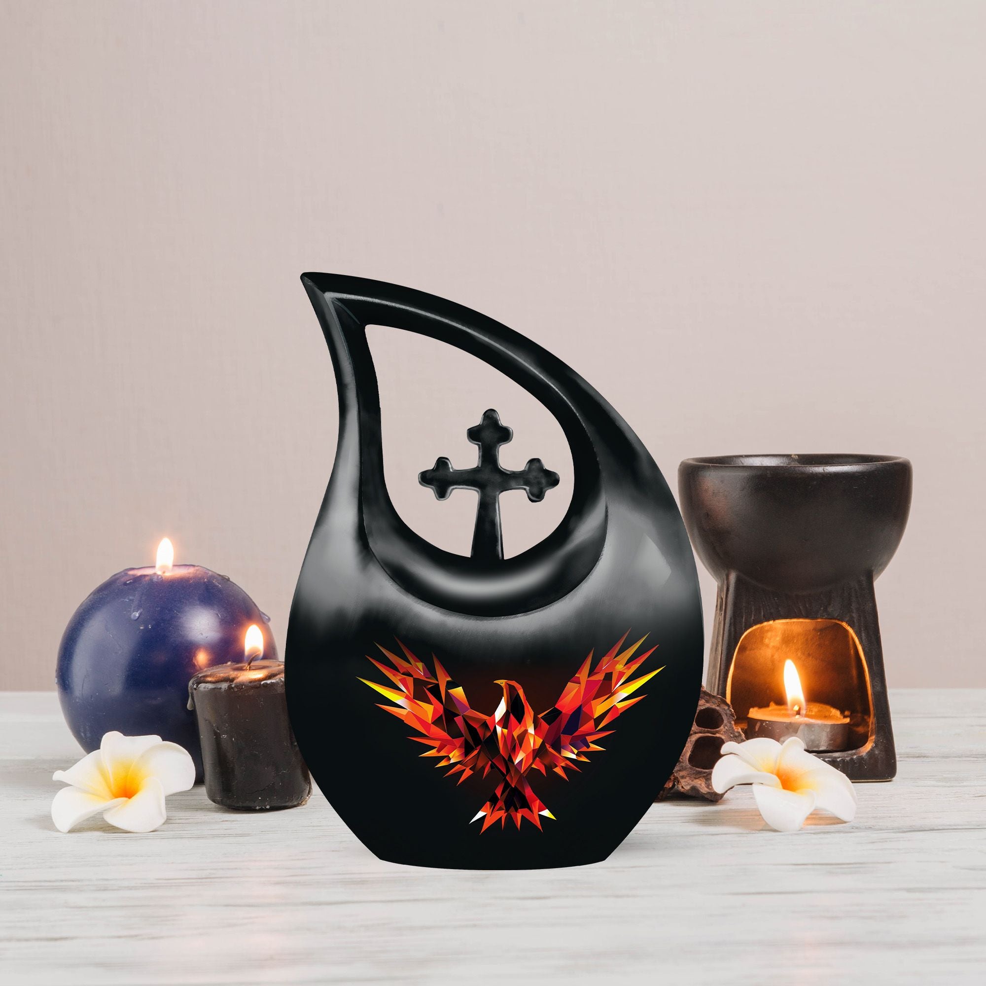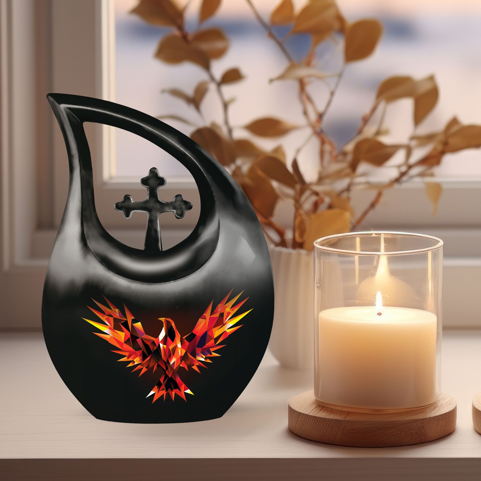 Ideal for those in search of distinctive 'memorial urns', this Phoenix Urn stands 10 inches tall and exudes a unique reverence and elegance. Engineered from resilient aluminium, it's an extra-large urn designed to hold up to 200 cubic inches of ashes, paired with a weight of 3.3 pounds indicating substantiality and durability. Accentuated by a 'Cross Drop' theme that reverberates peace, it's not just a receptacle, but a tribute to your beloved. The urn comes with a luxurious velvet pouch, providing a tactful and respectful containment of the cherished remains. Add a personalized touch with engraving, transforming this Phoenix urn into a truly unique memorial. 'Customized Urns for Ashes', 'Urns for Dad', and 'Personal Urns' bear testimony to the urn's niche. This is more than just an urn, it's a home for your precious memories.