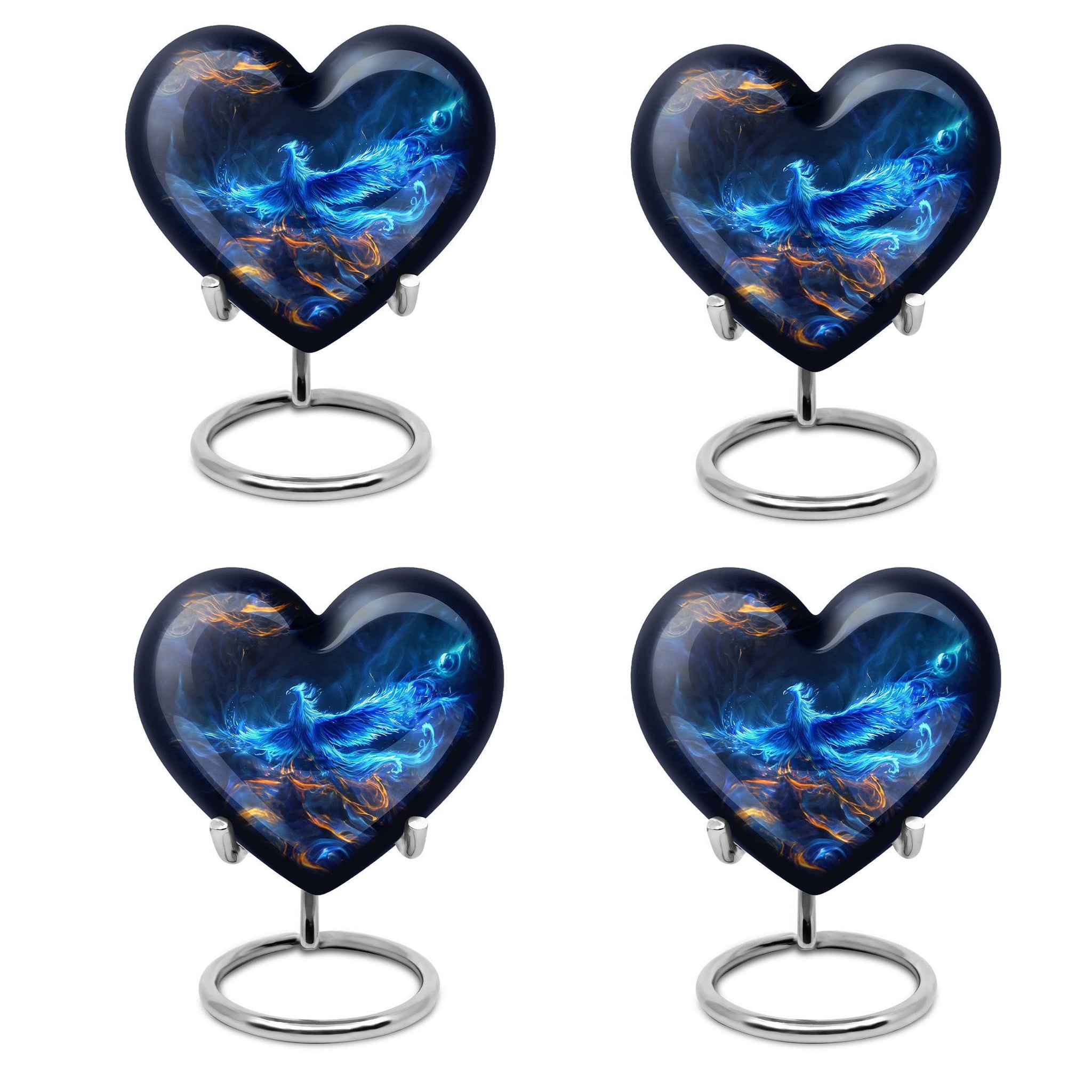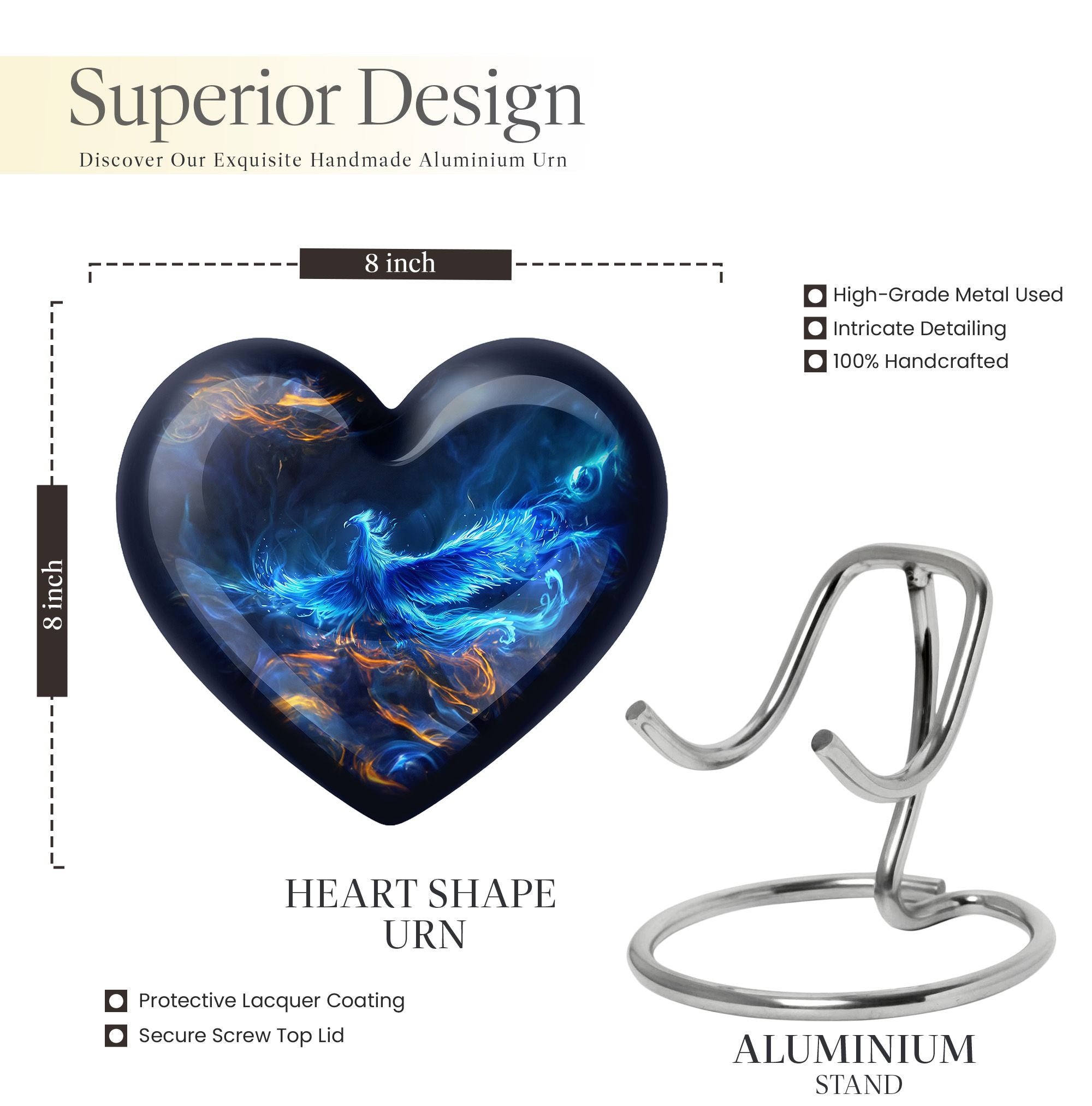 Illuminate your loving memories with our Phoenix urn, an exceptional cremation urn sized 10 inches. Crafted for those seeking to encapsulate the essence of their beloved, this urn for human ashes weighs just 3.3 pounds, making it both substantial and manageable. It possesses a unique heart urn configuration, elegantly molded from high-quality aluminium. Able to hold up to 200 cubic inches, it ensures ample space for containing ashes post cremation. For an added personal touch, customers have the luxury to customize this large urn with engraved names. In addition to the urn, a velvet pouch is part of the package, providing a dignified containment option for the ashes. True to its name, the Phoenix urn rediscovers the beauty in parting by presenting an abstract theme that sophisticatedly bridges the tangible and spiritual. For those needing cremation urn for dad, burial ash urns for humans, or desiring a distinctive cremation urn for burial, the Phoenix urn embodies an alluring union of art and affection.