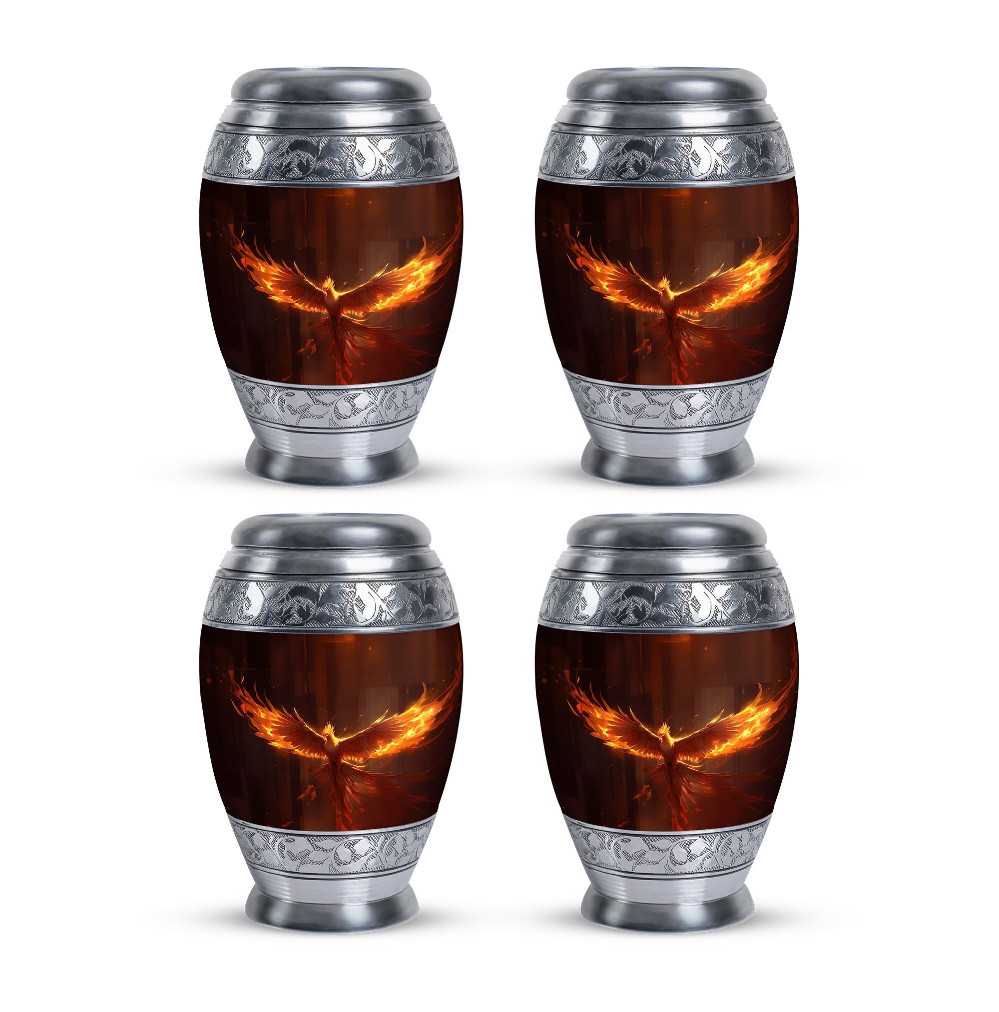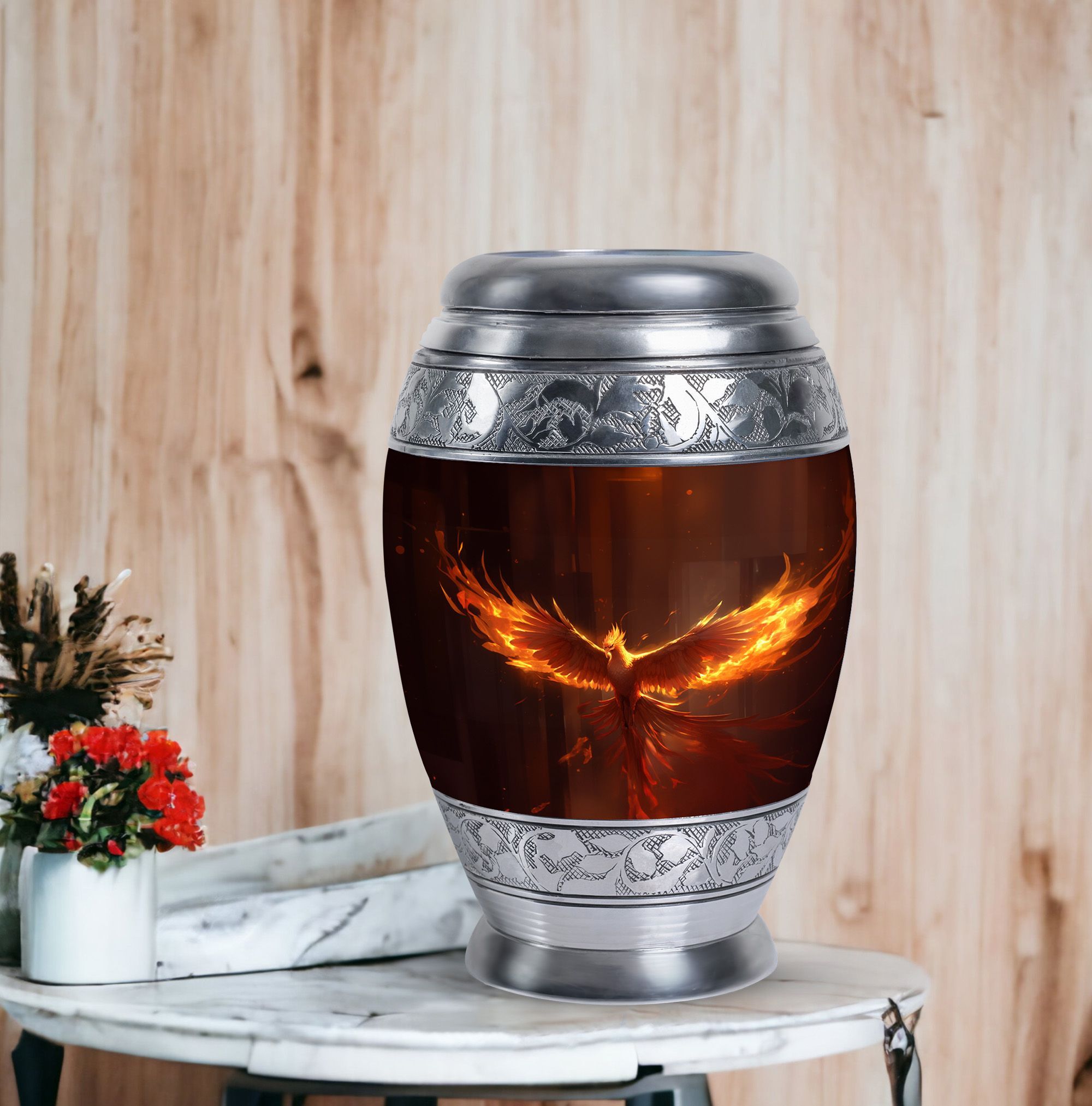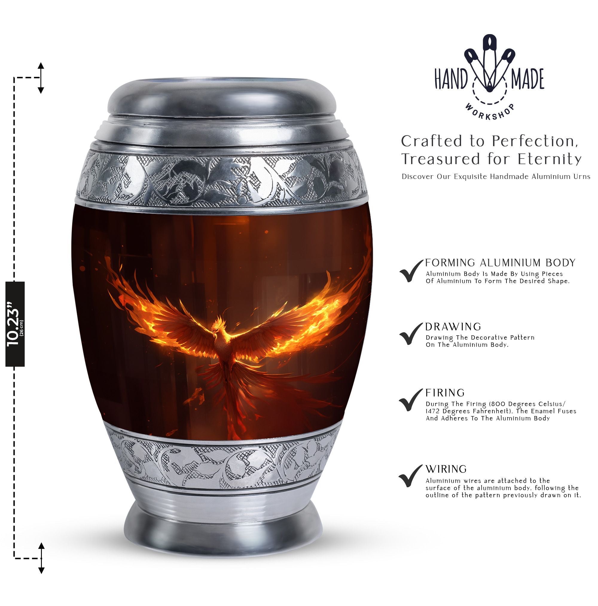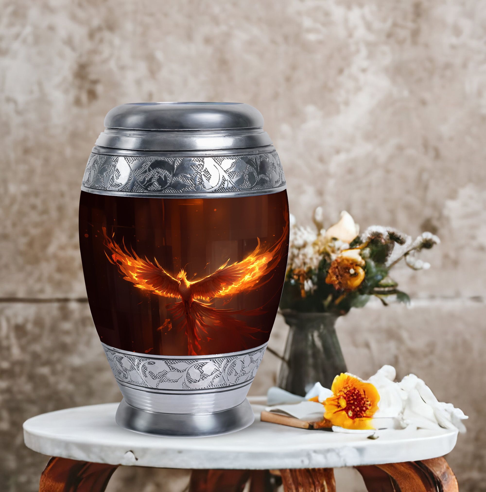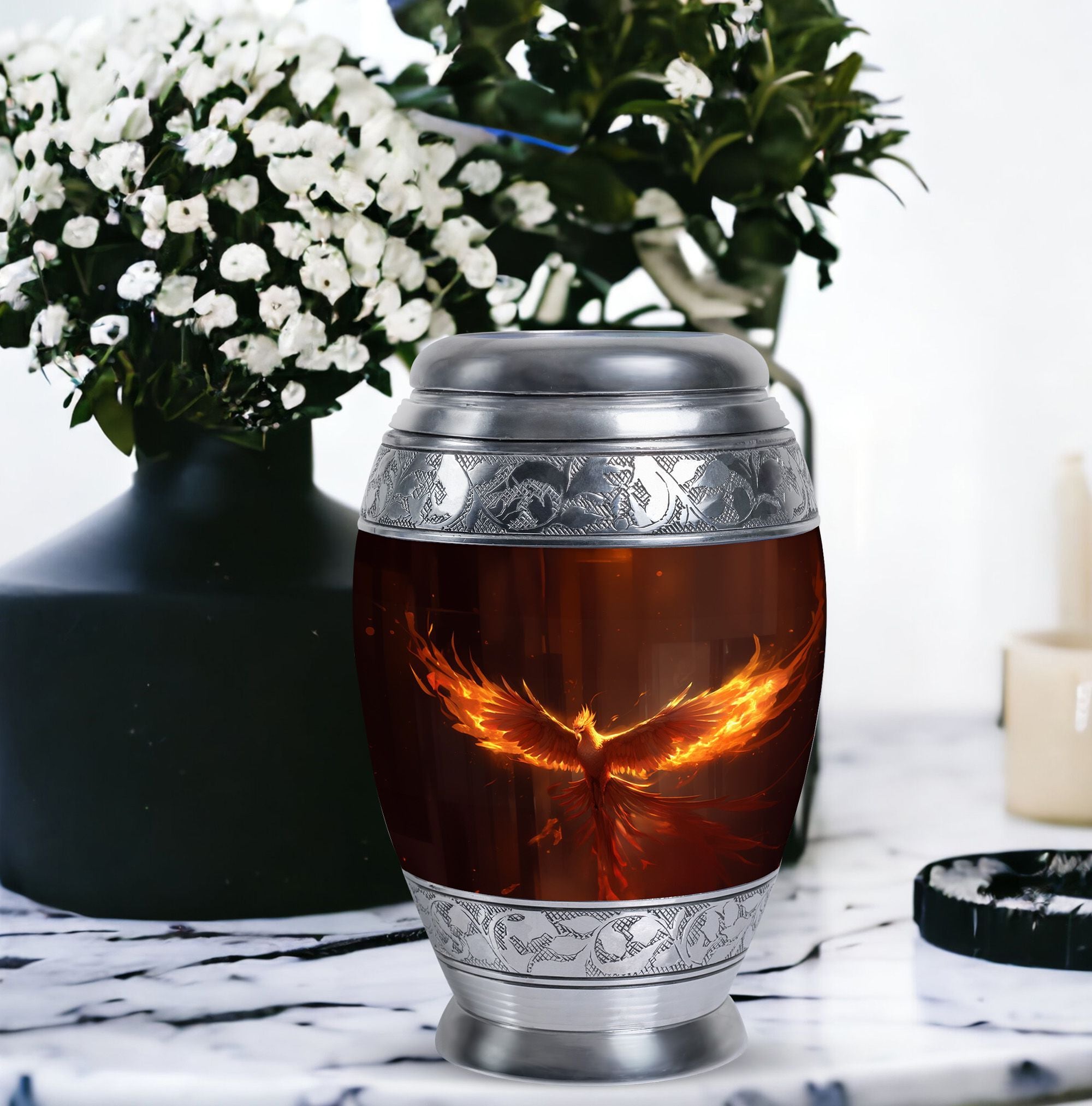 Discover the peace and comfort of knowing your loved one's ashes are secure in our 3 inch Phoenix Urn. This elegant, imposing cremation urn is crafted from robust aluminium, ensuring durability and stability. The urn, weighing in at 3.3 pounds, stands tall at 10 inches in height and has a generous capacity of 200 cubic inches, making it ideal for those seeking large urns that showcase refinement and sophistication. You can further personalize this urn by engraving chosen names, adding a deeper, personal touch. The package also comprises a tasteful velvet pouch, providing a handsome and respectful containment for the ashes. Spotlighting both function and aesthetics, this urn is perfect for those seeking unique urns for dad or anyone dear. Remember, it's more than just an urn. It's a commemoration of life, treasuring the moments and love shared. Embrace this heartfelt solution for your cremation containers for ashes needs, knowing that you've found the perfect resting place that has been crafted with utmost respect and care.