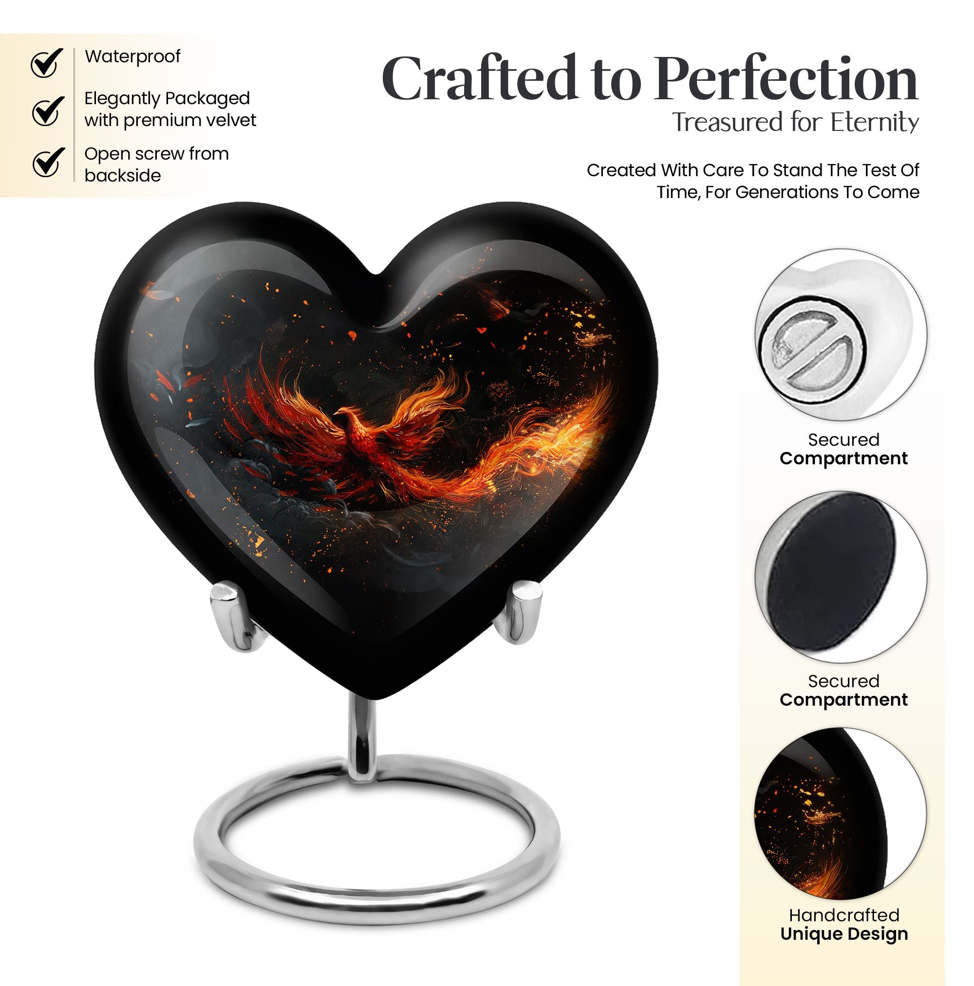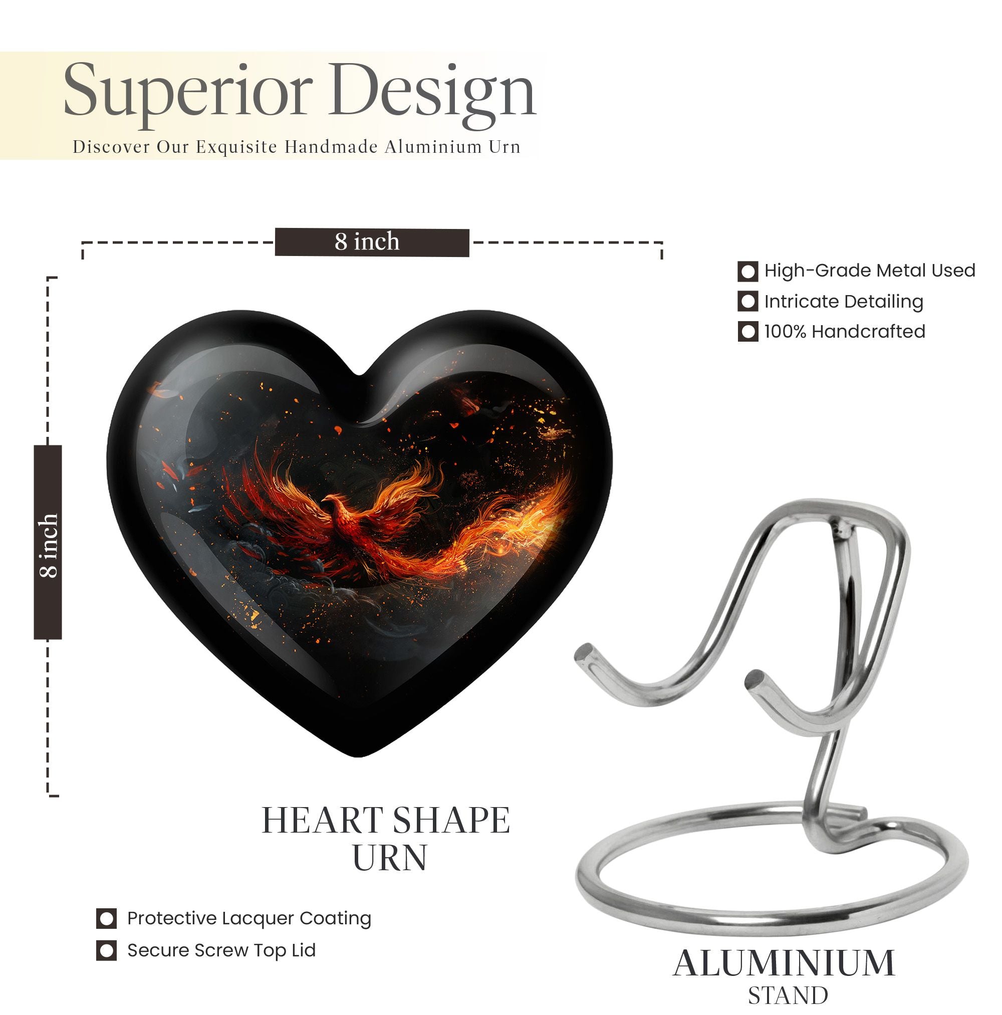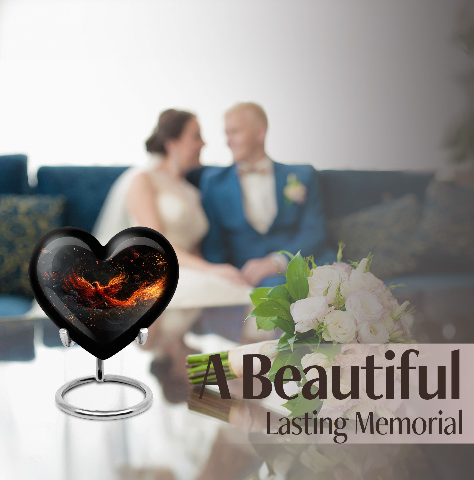 Introducing the Phoenix Urn, our meticulously fashioned, abstract-themed cremation urn designed to offer an affectionate tribute to your departed loved one. Sized at a substantial 10 inch height, this large urn boasts a storage capacity of up to 200 cubic inches, offering ample space for a male adult's ashes. Particularly adept as a memorial urn for adult male ashes, it also resonates as a human burial urn with significant gravitas. Our Phoenix Urn is adroitly formed of durable aluminium, a feature that guarantees longevity while retaining an air of graceful charm. Each cremation urn for men comes with a soft, velvet pouch to safeguard the ashes within. Furthermore, we offer a customization option, allowing you to personalize your urn with engraved names - an intimate touch to commemorate your loved one. This cremation urn for two adults strikes a heartfelt balance between practicality and timeless elegance.
