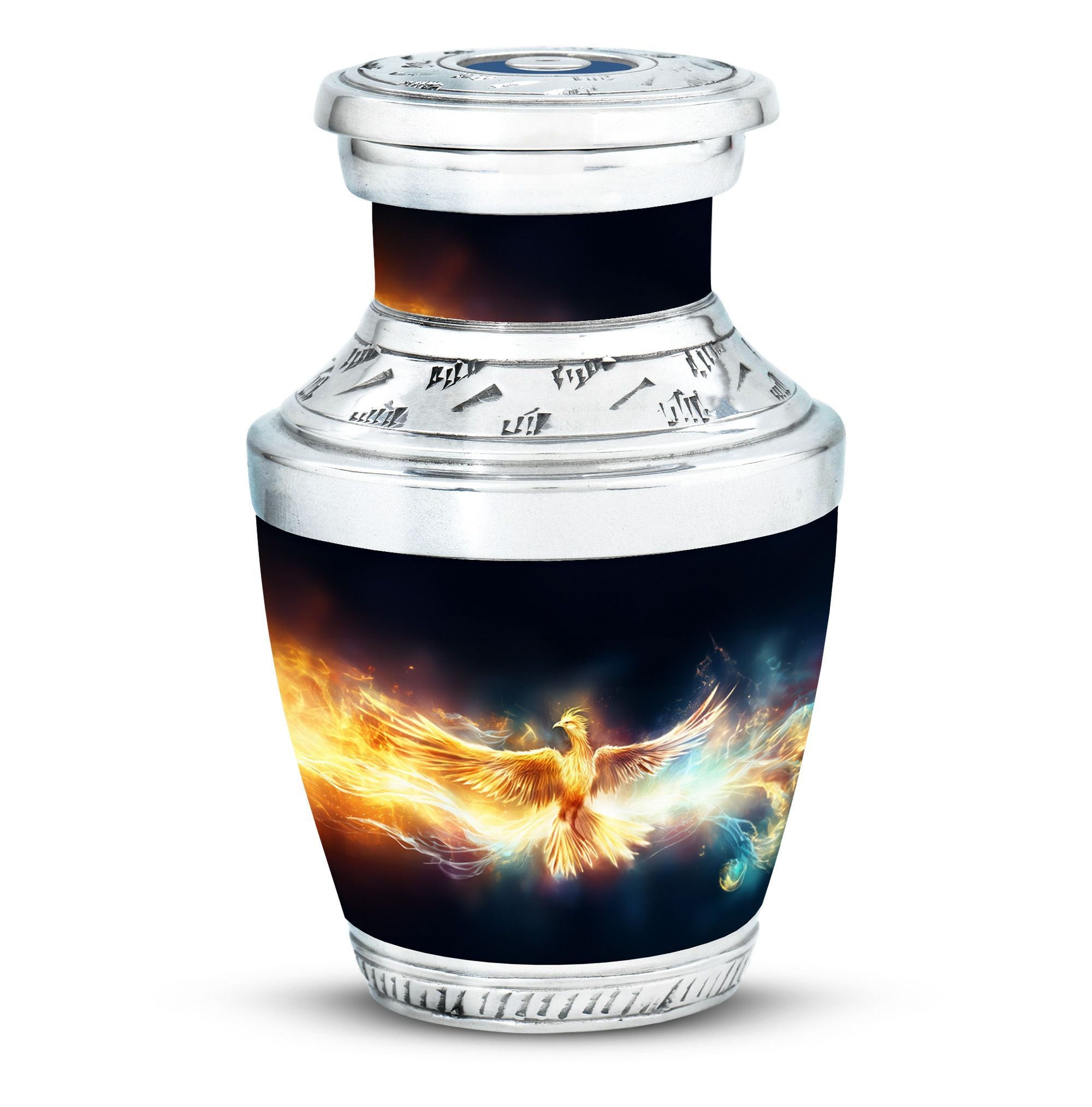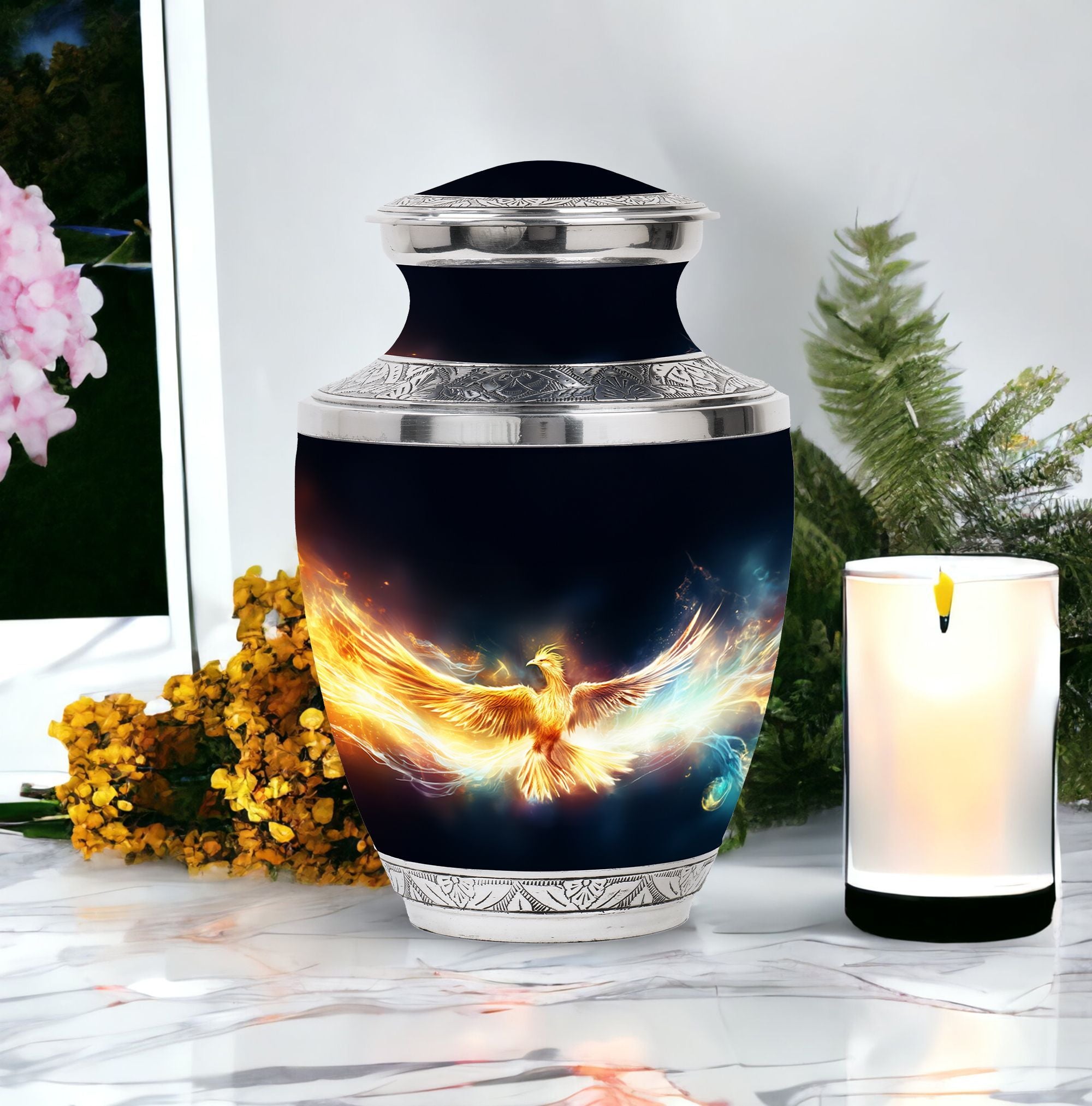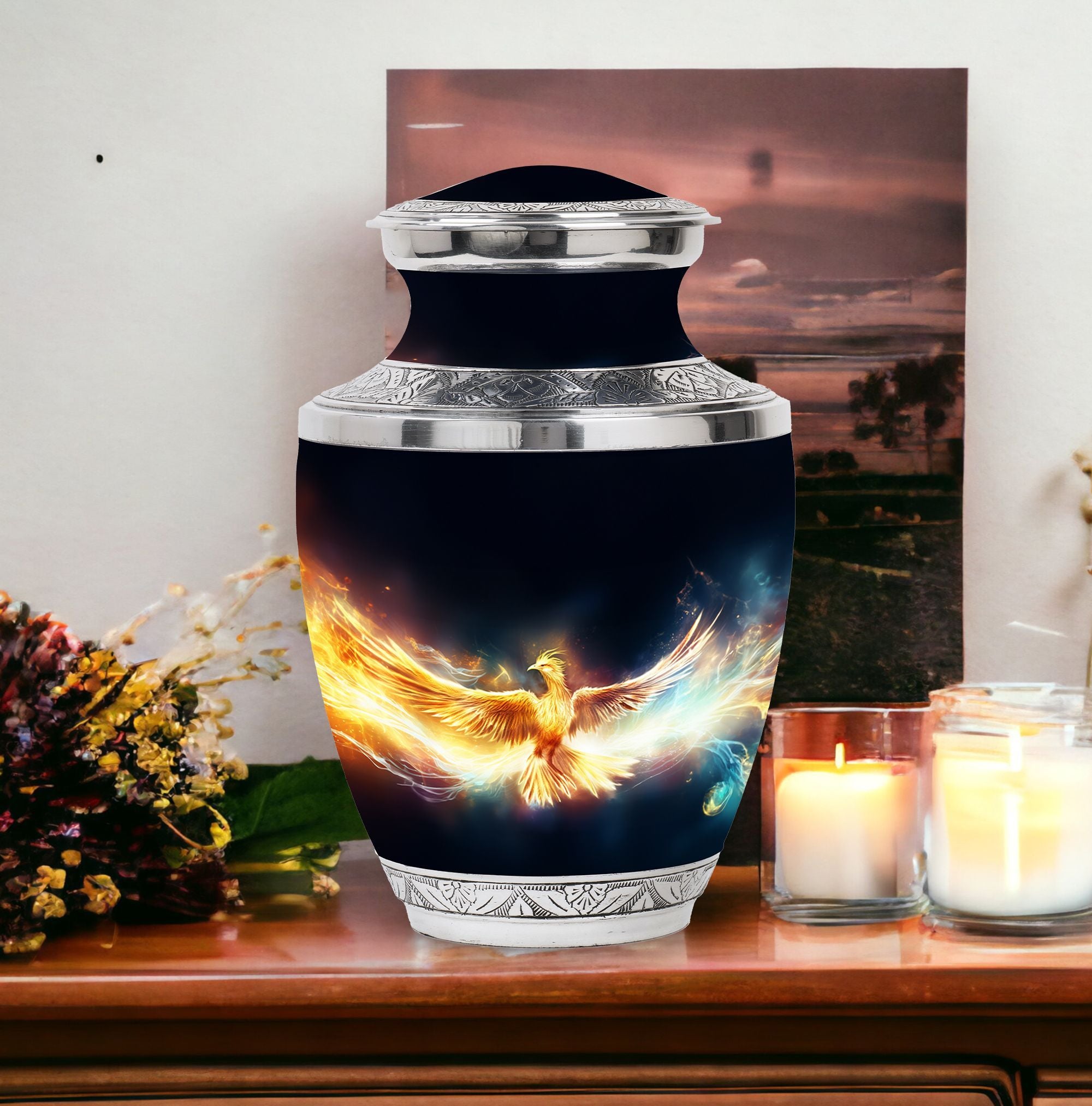 Discover peace in memory of your departed one with the Yellow Phoenix Urn. This distinct selection among unique urns for human ashes sets a serene reminder of your loved one's eternal spirit. Crafted from durable aluminium, this Large Urn offers a capacity of 200 cubic inches, ample space to respectfully contain the ashes. This 3-inch Classic Urn weighs only 3.3 pounds and stands 10 inches high, making it easy to place in your home as a compassionate reminder of one so dearly loved and missed. Its package includes a velvet pouch, providing a tasteful and dignified containment for the ashes. One can also personalize it with engraved names, making it an intimate memento of remembrance. Whether you're looking for Personalized Urns, Urns for Ashes for Dad, or decorative urns for ashes for human remains, this Yellow Phoenix Urn serves as the embodiment of timeless love and memories.
