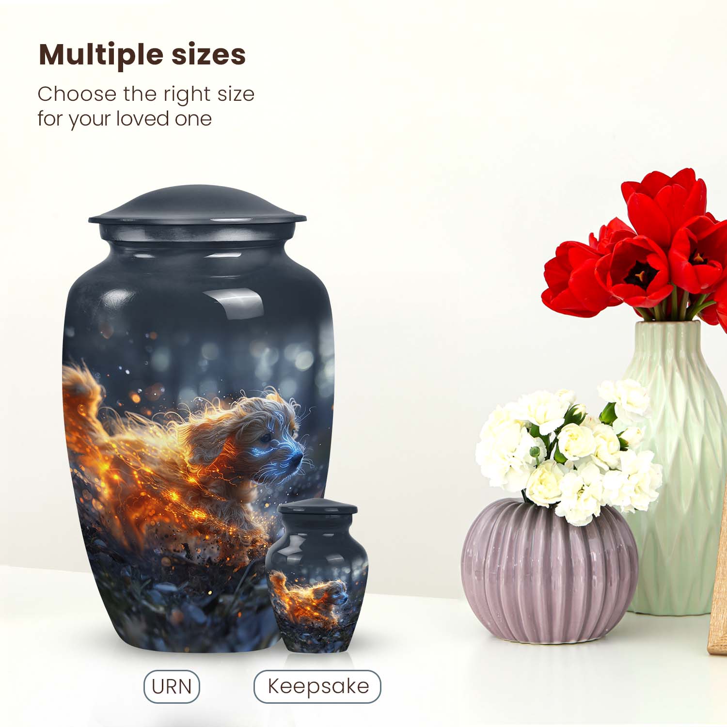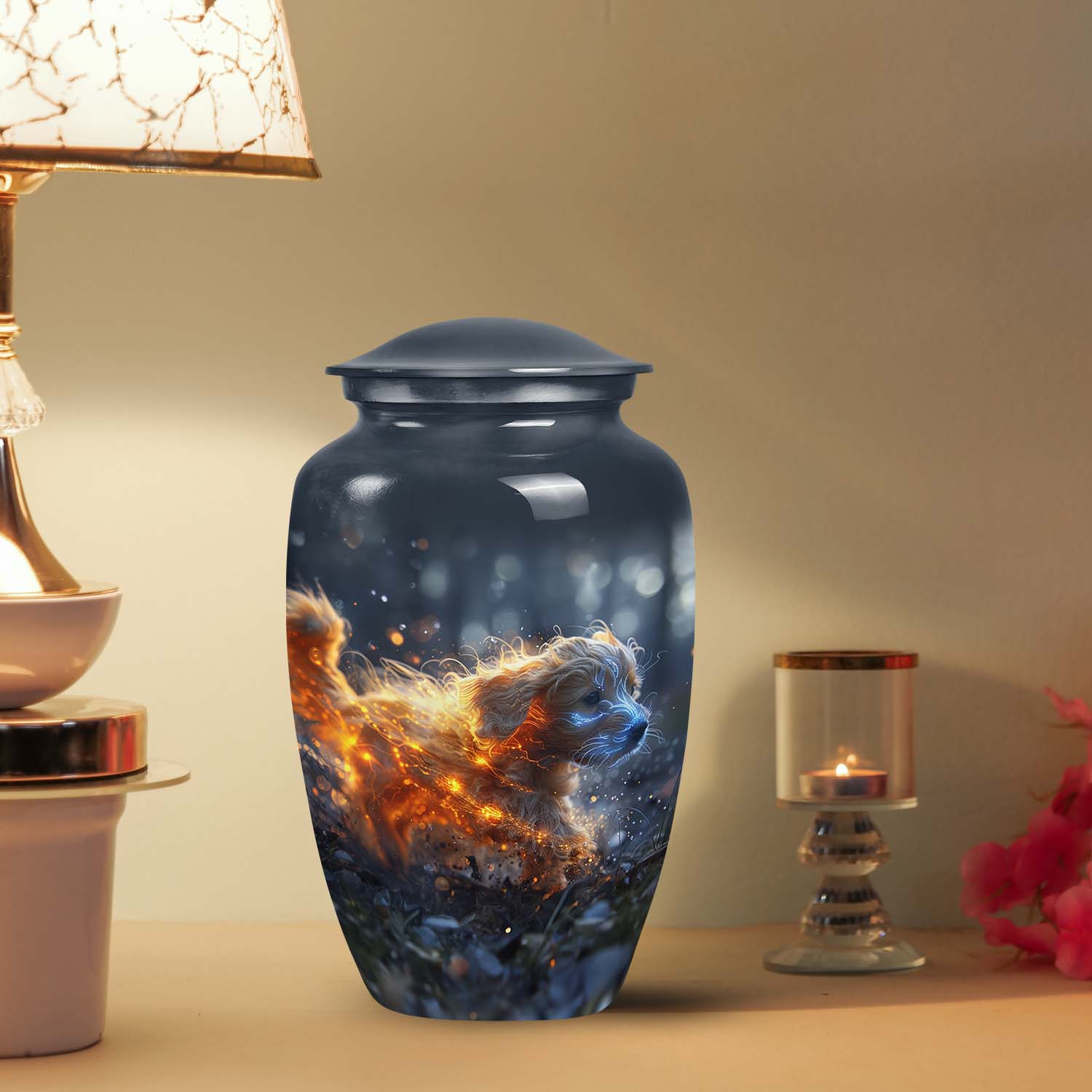 This beautifully handcrafted urn is designed to honor the memory of your cherished Poodle. The dynamic and colorful design captures the playful and lively spirit of your pet. The artistic elements and vibrant tones evoke feelings of warmth and joy, making this urn a perfect tribute to your furry companion.