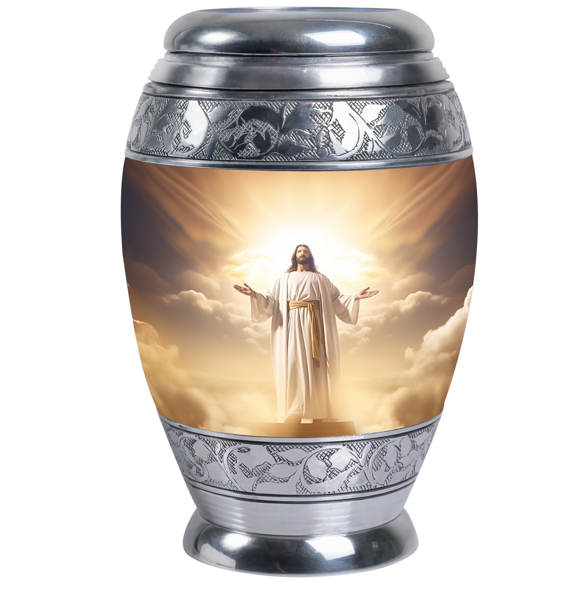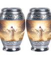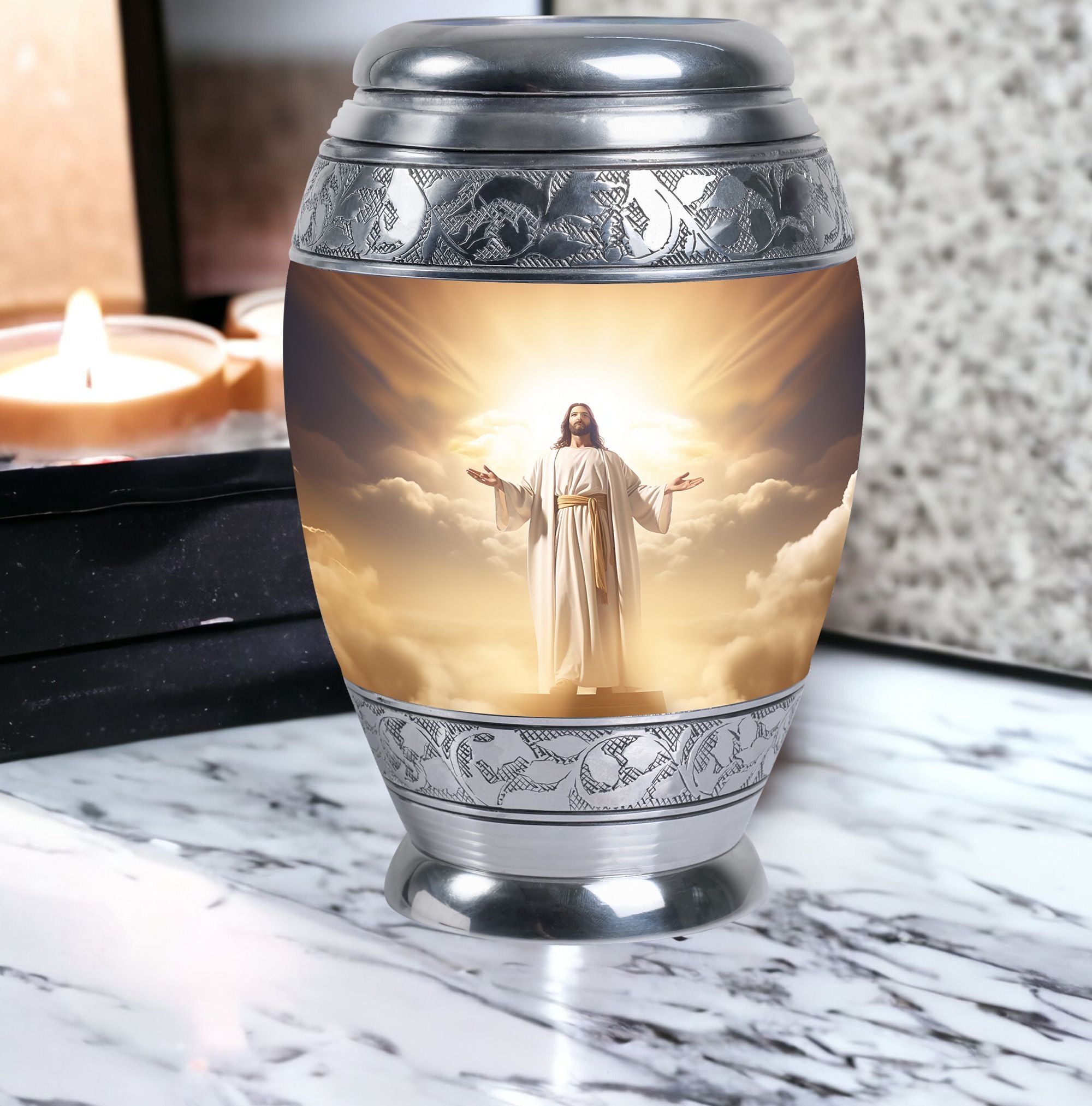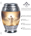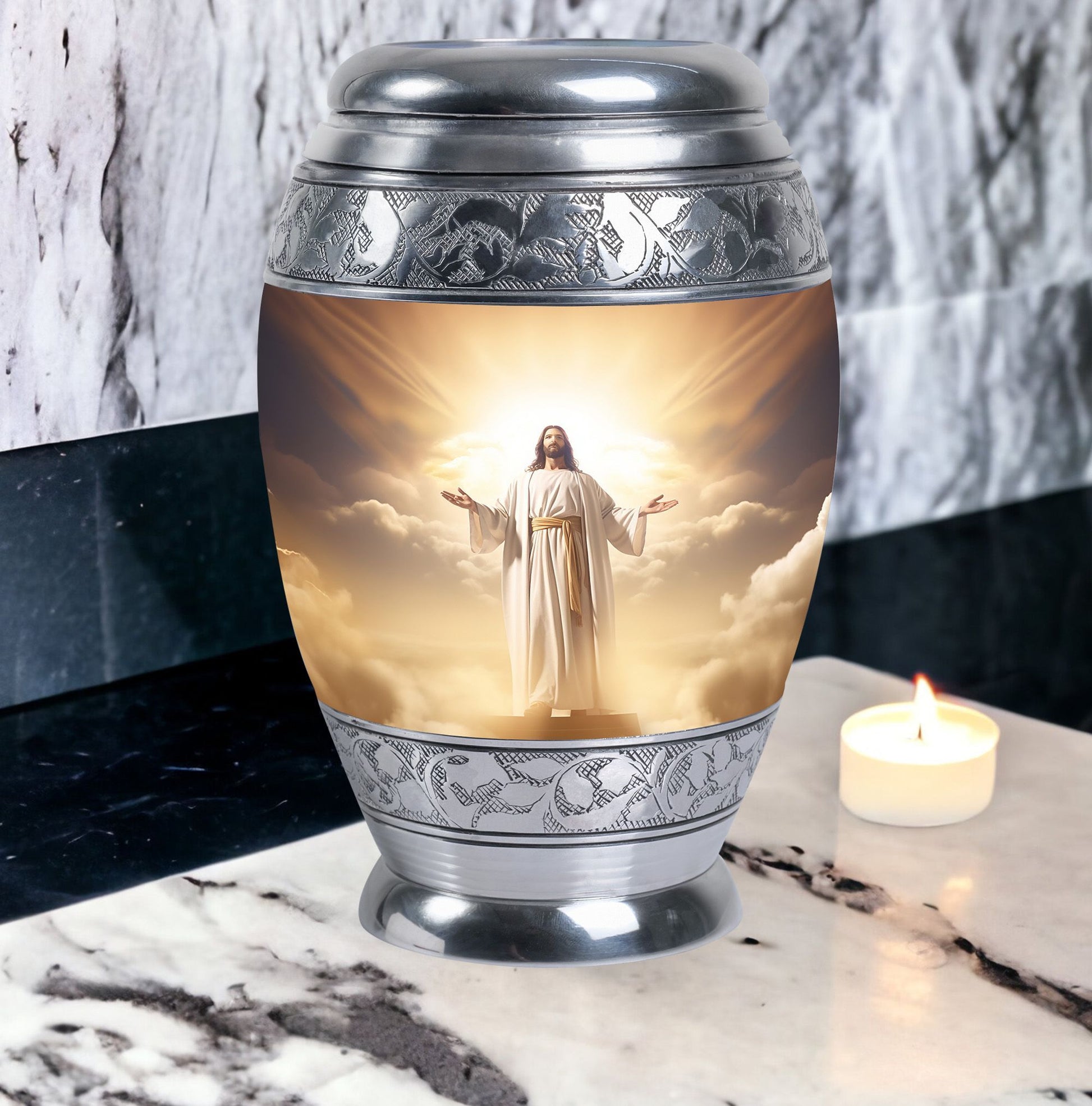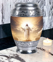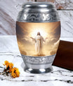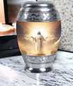 Crafted with exceptional care, this urn features a detailed depiction of Jesus Christ, symbolizing protection and eternal guidance. Its aluminum structure ensures durability, while the elegant finish speaks to timeless devotion. Thoughtfully made for families looking for urns for human ashes adult male dad or urns adult male dad, it blends artistry with practicality. The secure screw-top lid ensures ashes remain safe, and the spacious capacity accommodates the full remains of an adult male. Whether displayed at home or used in a memorial ceremony, it stands as a refined and meaningful tribute.
