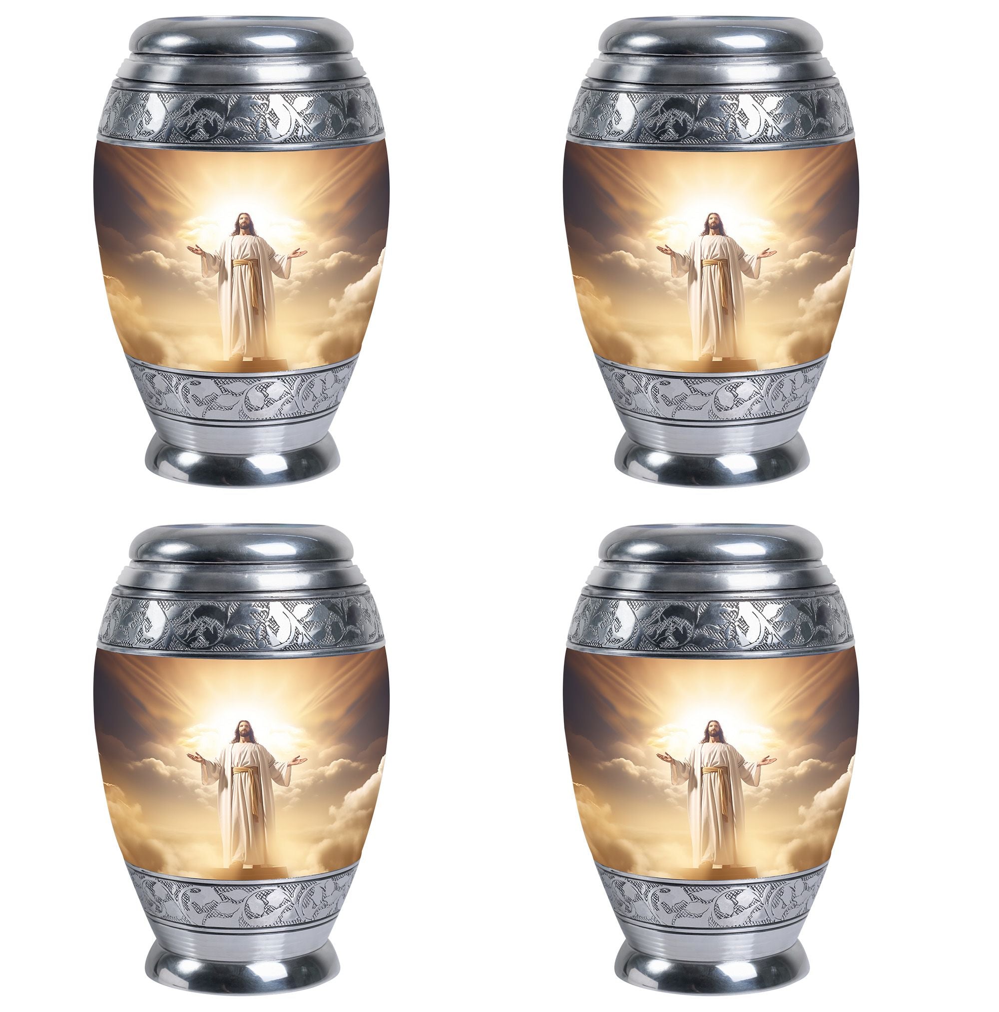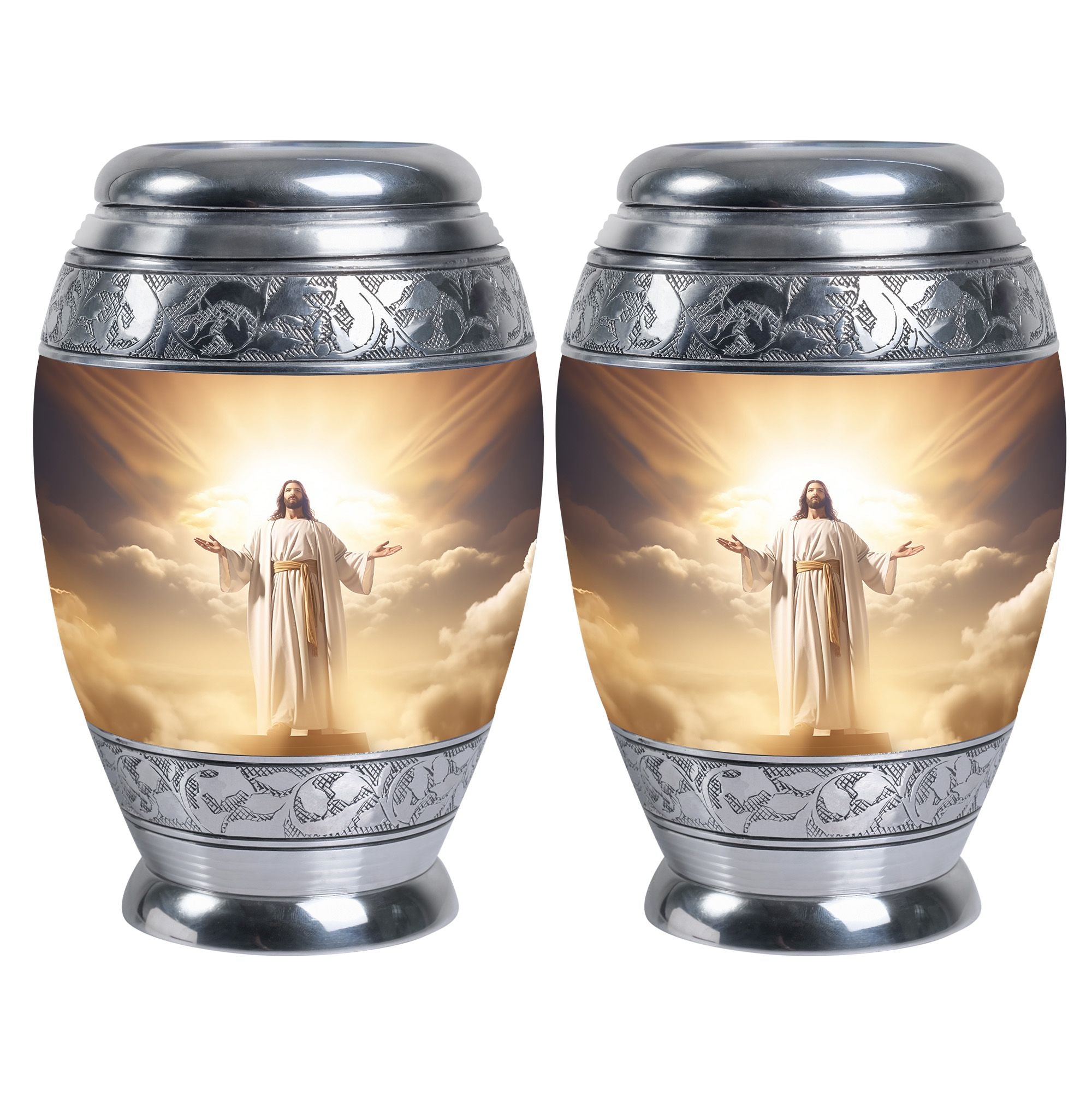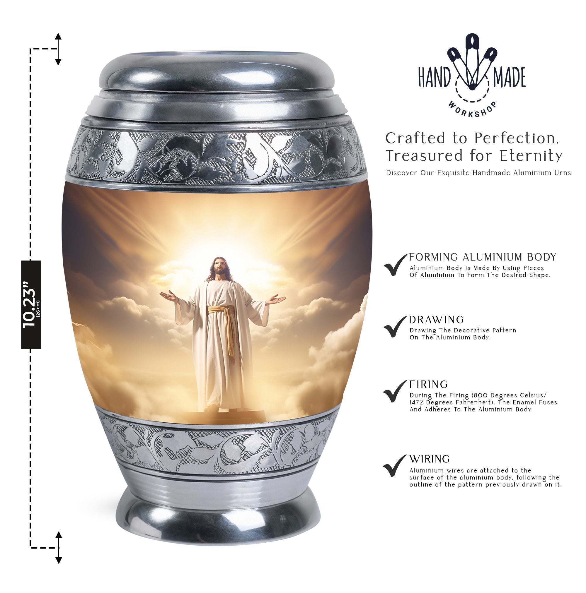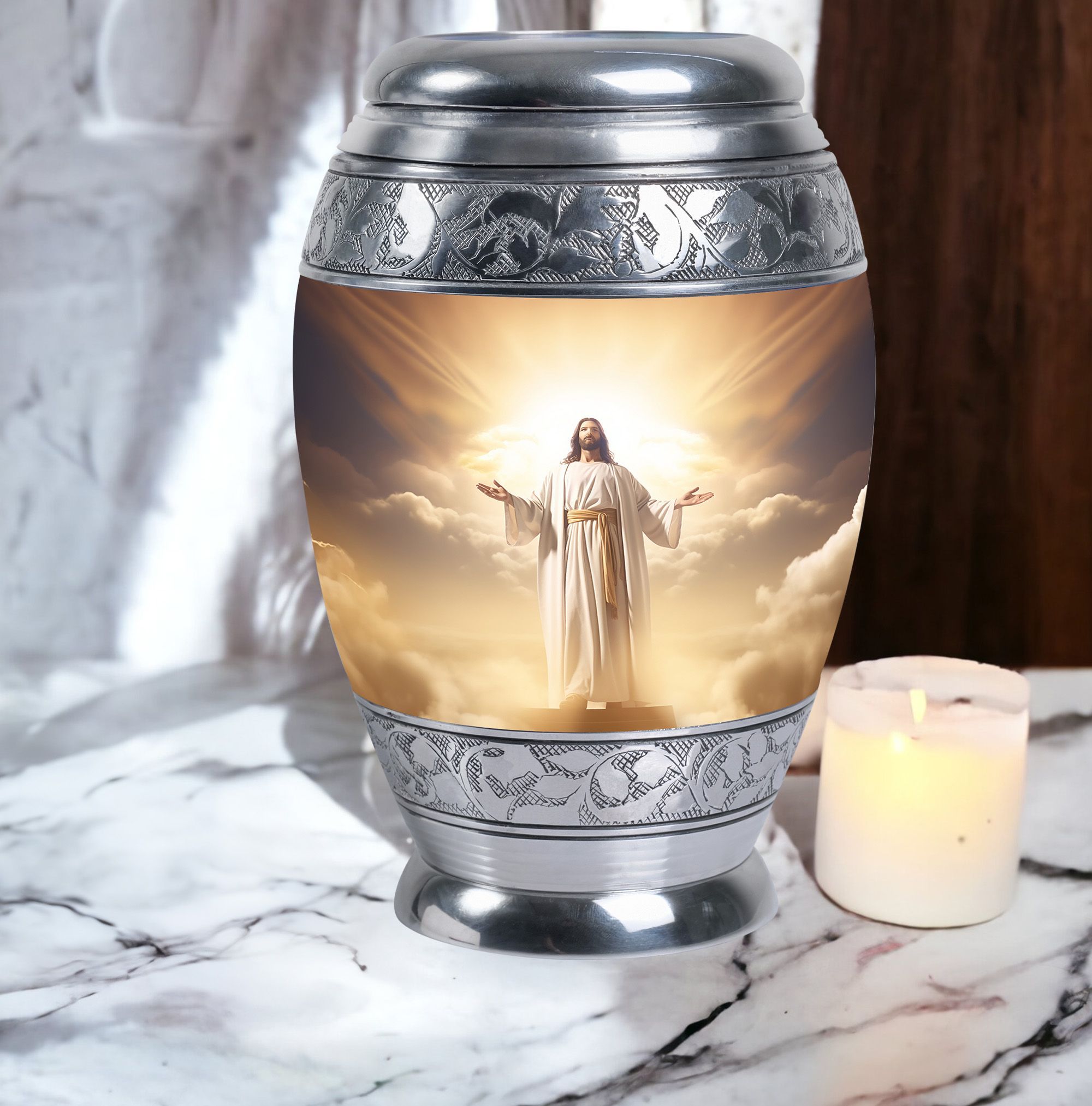 Crafted with exceptional care, this urn features a detailed depiction of Jesus Christ, symbolizing protection and eternal guidance. Its aluminum structure ensures durability, while the elegant finish speaks to timeless devotion. Thoughtfully made for families looking for urns for human ashes adult male dad or urns adult male dad, it blends artistry with practicality. The secure screw-top lid ensures ashes remain safe, and the spacious capacity accommodates the full remains of an adult male. Whether displayed at home or used in a memorial ceremony, it stands as a refined and meaningful tribute.